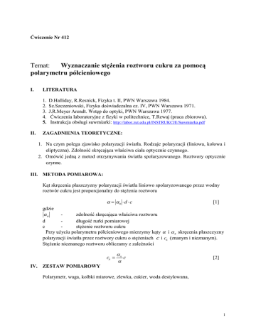 Ćwiczenie Nr 412 Temat: Wyznaczanie stężenia roztworu cukru za pomocą polarymetru półcieniowego I. LITERATURA 1. 2. 3. 4. 5. II. D.Halliday, R.Resnick, Fizyka t. II, PWN Warszawa 1984. Sz.Szczeniowski, Fizyka doświadczalna cz. IV, PWN Warszawa 1971. J.R.Meyer Arendt. Wstęp do optyki, PWN Warszawa 1977. Ćwiczenia laboratoryjne z fizyki w politechnice, T.Rewaj (praca zbiorowa). Instrukcja obsługi suwmiarki: http://labor.zut.edu.pl/INSTRUKCJE/Suwmiarka.pdf ZAGADNIENIA TEORETYCZNE: 1. Na czym polega zjawisko polaryzacji światła. Rodzaje polaryzacji (liniowa, kołowa i eliptyczna). Zdolność skręcająca właściwa ciała optycznie czynnego. 2. Omówić jedną z metod otrzymywania światła spolaryzowanego. Roztwory optycznie czynne. III. METODA POMIAROWA: Kąt skręcenia płaszczyzny polaryzacji światła liniowo spolaryzowanego przez wodny roztwór cukru jest proporcjonalny do stężenia roztworu o d c [1] gdzie o zdolność skręcająca właściwa roztworu d długość rurki pomiarowej c stężenie roztworu cukru Przy użyciu polarymetru półcieniowego mierzymy kąty i x skręcenia płaszczyzny polaryzacji światła przez roztwory cukru o stężeniach c i cx (znanym i nieznanym). Stężenie nieznanego roztworu obliczamy z zależności cx IV. x c [2] ZESTAW POMIAROWY Polarymetr, waga, kolbki miarowe, zlewka, cukier, woda destylowana, 1 V. WYKONANIE ĆWICZENIA: 1. Przygotować roztwór cukru o jednym ze stężeń c: 0,1 g / cm3 , 0,15 g / cm3 , 0,2 g / cm3 lub 0,25 g / cm3 Potrzebne będzie 25 cm3 takiego roztworu, trzeba więc obliczyć jaką ilość cukru należy odważyć: m c V c 25cm 3 gramów cukru W celu sporządzenia roztworu: - odważyć odpowiednią ilość cukru (ważenie przeprowadzić w pok. 619); - odmierzyć menzurką około 20cm3 wody (tj. mniej niż 25 cm3 ); - przesypać odważony cukier do zlewki i rozpuścić go w odmierzonej ilości wody destylowanej; - przelać roztwór do menzurki i uzupełnić roztwór wodą do 25 cm3. 2. Napełnić rurkę polarymetryczną wodą destylowaną tak, by nie było w niej pęcherzyków powietrza, a okienka, przez które przechodzi światło, były z zewnątrz czyste i suche. 3. Przy pomocy pokrętła okularu wyregulować ostrość obserwowanego obrazu (obraz a lub c na rysunku 1). Rysunek 1. 4. Ustawić obraz na taki jak na rysunku b czyli tzw. "półcień" (nie powinien być widoczny jasny lub ciemny pasek po środku) 5. Odczytać ze skali kątowej z noniuszem wartość kąta 1 odpowiadającą temu ustawieniu. 6. Pomiar powtórzyć pięciokrotnie. UWAGA: Obrazy (a), (b) i (c) znajdują się bardzo blisko siebie i są „oddalone od siebie” o minimalny ruch pokrętła. Jeżeli przy niewielkim obrocie pokrętła (3-4 stopnie) obraz nie zmienia się na (a) lub (c), to nie jest to właściwy półcień i należy poszukiwać obrazów (a), (b) i (c) w innym miejscu. Wskazówką prawidłowego pomiaru może być też to, że w przebiegu całego ćwiczenia nigdzie nie jest przekroczony kąt 500. 7. Napełnić rurkę polarymetryczną przygotowanym roztworem. 8. Umieścić rurkę z roztworem w polarymetrze i ponownie ustawić analizator na "półcień". 9. Odczytać wartość kąta 2 . Pomiar powtórzyć pięciokrotnie. 10. Wykonać pomiary opisane w punktach 7-9 dla roztworu o nieznanym stężeniu (podanym przez asystenta). 2 11. Wyniki zapisać w tabeli: Pomiar Woda destylowana 1 1 u a ( 1 ) Nr 1 2 3 4 5 Kąt skręcenia Zdolność skręcająca właściwa Niepewność kąta skręcenia Stężenia roztworów [g/cm3] 2 Znany roztwór 2 u a ( 2 ) 0 u( 0 ) Nieznany roztwór 3 3 u a ( 3 ) 2 1 ............. x 3 1 .......... 0 ........................... 0 x ......................... u ( ) ...................... u ( x ) ................... c=............................... cx=............................. Niepewności stężeń u(c)=........................... u(cx)=........................ roztworów [g/cm3] W tabeli wszystkie kąty proszę podawać w stopniach, a zdolność skręcającą właściwą 10 w jednostkach . dm g cm 3 Długość rurki polarymetrycznej d=20 0,4 cm. (Δd=0,4cm) Niepewność wyznaczenia masy cukru (dokładność wagi) Δ(m)=.................... Niepewność pomiaru objętości cieczy (dokładność menzurki) Δ(V)=.................... VI. Obliczenia i niepewności pomiarowe. 1. Obliczyć wartości kąta skręcenia płaszczyzny polaryzacji dla znanego i nieznanego roztworu: 2 1 oraz x 3 1 . 2. Obliczyć zdolność skręcającą właściwą [ 0 ] dla wodnego roztworu cukru o d c 1 dm g cm 3 [3] 3. Obliczyć stężenie nieznanego roztworu z wzoru: cx x c. 3 4. Wyznaczyć niepewności pomiarowe mierzonych wielkości z następujących wzorów: u a ( 1 ) i 1 2 u a ( 2 ) 54 2i 2 2 u a ( 3 ) 54 3 3i 2 54 Są to niepewności typu A dla odpowiednich średnich kątów. Niepewności typu B można zaniedbać, ze względu na bardzo dużą rozdzielczość skali przyrządu (0,10). Niepewności kąta skręcenia obliczyć z wzorów: 2 2 u a 2 ( 1 ) u a 2 ( 2 ) u 2 ( 1 ) u 2 ( 2 ) u ( ) 1 2 2 2 u a 2 ( 3 ) u 2 ( 1 ) u 2 ( 3 ) u a 2 ( 1 ) u ( x ) 1 3 Niepewności pomiaru stężeń obliczyć ze wzorów: ub2 (m) ub2 (V ) c c 2 2 u(c) u ( m ) u ( V ) c b b m2 V2 m V 2 c u (c x ) x x cx 2 2 c c u 2 ( x ) x u 2 (c) x u 2 ( ) c u 2 ( x ) x2 2 2 u 2 (c) u 2 ( ) c2 2 Niepewność zdolności skręcającej właściwej obliczyć ze wzoru: u ( 0 ) 0 u 2 ( ) 0 u 2 (c) 0 u 2 (d ) c d 2 0 u 2 ( ) 2 2 2 u 2 (c ) u 2 ( d ) c2 d2 Należy pamiętać o zamianie niepewności maksymalnych Δd, ΔV, Δm na niepewności x standardowe według zależności u ( x) . 3 4