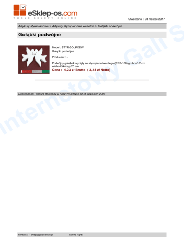 Utworzono : 08 marzec 2017 S li Artykuły styropianowe > Artykuły styropianowe weselne > Gołąbki podwójne Gołąbki podwójne a G y w o t e n r Model : STYRGOLPODW Gołąbki podwójne Producent : - Podwójny gołąbek wycięty ze styropianu twardego (EPS-100) grubość 2 cm wielkość 25 cm. Cena : 4,23 zł Brutto ( 3,44 zł Netto) Dostępność: Produkt dostępny w naszym sklepie od 25 wrzesień 2008 e t in kontakt : - [email protected] Strona 1/{nb}