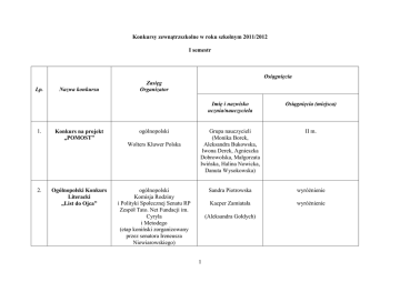 Konkursy zewnątrzszkolne w roku szkolnym 2011/2012 I semestr Osiągnięcia Lp. 1. Nazwa konkursu Konkurs na projekt „POMOST” Zasięg Organizator ogólnopolski Wolters Kluwer Polska 2. Ogólnopolski Konkurs Literacki „List do Ojca” Imię i nazwisko ucznia/nauczyciela Osiągnięcia (miejsca) Grupa nauczycieli (Monika Borek, Aleksandra Bukowska, Iwona Derek, Agnieszka Dobrowolska, Małgorzata Iwińska, Halina Nowicka, Danuta Wysokowska) II m. Sandra Piotrowska wyróżnienie Kacper Zamiatała wyróżnienie ogólnopolski Komisja Rodziny i Polityki Społecznej Senatu RP Zespół Tato. Net Fundacji im. Cyryla i Metodego (etap koniński zorganizowany przez senatora Ireneusza Niewiarowskiego) (Aleksandra Gołdych) 1 Osiągnięcia Lp. 3. Nazwa konkursu Olimpiada Wiedzy i Umiejętności Zasięg Organizator Imię i nazwisko ucznia/nauczyciela Osiągnięcia (miejsca) Krystian Konieczka (Mariusz Witkowski) III miejsce Wiktoria Perschke Klaudia Wicińska Dagmara Kobojek, Julia Grzelak, Jakub Hajewski, Oliwia Staszak (s. Aurelia Leszczyńska) I m. II m. III m. 3 wyróżnienia ogólnopolski (ponadregionalny) Centrum Doskonalenia Nauczycieli Wojewódzkiego Zakładu Doskonalenia Zawodowego w Opolu w partnerstwie z Wyższą Szkołą Biznesu i Przedsiębiorczości w Ostrowcu Świętokrzyskim 4. Konkurs plastyczny „Jan Paweł II – orędownik tradycji polskiej i tożsamości” wojewódzki szkoła ss.urszulanek Poznań 2 Osiągnięcia Lp. Nazwa konkursu Zasięg Organizator Imię i nazwisko ucznia/nauczyciela 5. Konkurs plastyczny „Żłóbek Wielkopolski" wojewódzki rozw. Muzeum Narodowe Poznań Emilia Nowak, Tobiasz Tomaszewski, uczniowie Kółka Artystycznego, uczniowie „Kółka Plastycznego”, Paweł Szyk, Piotr Kucharski, Marcin Derda Osiągnięcia (miejsca) II m. III m. 5 wyróżnień (s. Aurelia Leszczyńska, Karnelia Topor Pustelnik, Halina Nowicka, s. Laurencja Chodźko) 6. Turniej Orlika o Puchar Premiera Donalda Tuska powiatowy Drużyna OSiR Zagórów (Piotr Jabłoński) 3 III m. Osiągnięcia Lp. 7. Nazwa konkursu Powiatowy Konkurs Recytatorski „Co nam w duszy Zasięg Organizator Imię i nazwisko ucznia/nauczyciela Osiągnięcia (miejsca) powiatowy Milena Dąbrowska I m. Szkoła Podstawowa w Głodnie Filip Chwaciński wyróżnienie (Arleta Skibińska, Aleksandra Gołdych) gra…” – nasze ulubione wiersze 8. II Międzyszkolny gminny Konkurs Recytatorski Szkoła Podstawowa im. Stanisława Wyspiańskiego w Kawnicach „Jesienne poezjowanie” Filip Chwaciński Emilia Nowak (Aleksandra Gołdych, Paulina Kubsik, Przemysław Ciesielski) 4 I miejsce w kategorii klas szóstych III m. w kategorii klas piątych Osiągnięcia Lp. 9. 10. Nazwa konkursu Eliminacje do finału powiatowego w piłce ręcznej dziewcząt Mistrzostwa powiatu w piłce ręcznej dziewcząt 11. Konkurs plastyczny na ozdobę choinkową Zasięg Organizator Imię i nazwisko ucznia/nauczyciela Osiągnięcia (miejsca) powiatowy Drużyna II m. OSiR Kleczew (Piotr Jabłoński) powiatowy Drużyna OSiR Kleczew (Piotr Jabłoński) gminny Igor Janiszewski, Sandra Żerkowska, grupa dzieci (H. Nowicka, Kornelia Topor -Pustelnik, Żaneta Wilant, Alina Król, Agnieszka Dobrowolska, Przemysław Ciesielski Dom Kultury w Golinie 5 II m. 2 wyróżnienia Osiągnięcia Lp. 12. Nazwa konkursu IX Prezentacje Bożonarodzeniowe Zasięg Organizator Imię i nazwisko ucznia/nauczyciela Osiągnięcia (miejsca) II b, grupa dzieci (Alina Król, Żaneta Wilant, s. Laurencja Chodźko, s. Aurelia Leszczyńska) 2 wyróżnienia M. Grzesiak, K. Ślęzak, A. Sibiński, F. Chwaściński, I. Szymański, K. Zamiatała, A. Górniak, J. Ławniczak (Tomasz Borowski) III m. M. Łukasiewicz, D. Gordziewicz, A. Sibiński, M. Grzesiak, J. Ławniczak, A. Górniak (Tomasz Borowski) II m. gminny Dom Kultury w Golinie 13. 14. II Turniej Orlika o Puchar Premiera Donalda Tuska” Gminne sztafetowe biegi przełajowe gminny SP w Kawnicach gminny SP w Golinie 6 Osiągnięcia Lp. Nazwa konkursu 15. Drużynowe mistrzostwa gminy w tenisie stołowym 16. Mistrzostwa gminy w halowej piłce nożnej 17. Gminne sztafetowe biegi przełajowe Zasięg Organizator Imię i nazwisko ucznia/nauczyciela Osiągnięcia (miejsca) gminny M. Grzesiak, A. Sibiński II m. SP w Kawnicach (Tomasz Borowski) gminny II m. SP w Kawnicach A. Górniak, J. Ławniczak, F. Chwaściński, I. Szymański, K. Zamiatała, M. Grzesiak, A. Sibiński, F. Zaborski (Tomasz Borowski) gminny Drużyna II m. Gminny koordynator ds. sportu. (Piotr Jabłoński) 7 Osiągnięcia Lp. 18. 19. 20. Nazwa konkursu Mistrzostwa gminy w szachach Turniej Orlika o Puchar Premiera Donalda Tuska Drużynowe mistrzostwa gminy w tenisie stołowym Zasięg Organizator Imię i nazwisko ucznia/nauczyciela Osiągnięcia (miejsca) gminny Drużyna III m. SP Przyjma (Piotr Jabłoński) gminny Drużyna SP Kawnice (Piotr Jabłoński) gminny Drużyna SP Kawnice (Piotr Jabłoński) 8 I m. III m. Osiągnięcia Lp. 21. 22. Nazwa konkursu Zasięg Organizator Imię i nazwisko ucznia/nauczyciela Osiągnięcia (miejsca) I m. Mistrzostwa gminy w piłce ręcznej dziewcząt gminny Drużyna SP Golina (Piotr Jabłoński) Konkurs Humanistyczny wojewódzki (etap szkolny) Filip Chwaciński Wiktoria Szymaniak Sandra Piotrowska Magdalena Stolarska Karolina Franikowska (Paulina Kubsik) (Aleksandra Gołdych) Kuratorium Oświaty w Poznaniu 9 5 kwalifikacji do etapu rejonowego Osiągnięcia Lp. 23. 24. Nazwa konkursu X edycja Wojewódzkiego Konkursu Recytatorskiego Twórczości Adama Mickiewicza oraz Polskich Romantyków ŚMIEŁÓW 2012 Wojewódzki Konkurs Przyrodniczy Zasięg Organizator Imię i nazwisko ucznia/nauczyciela Osiągnięcia (miejsca) wojewódzki Filip Chwaciński kwalifikacja do II etapu Kuratorium Oświaty w Poznaniu, Muzeum Narodowe w Poznaniu (Aleksandra Gołdych) wojewódzki Filip Chwaciński Wielkopolski Kurator Oświaty (K. Szadkowska, J. Smuszkiewicz, Anna Neneman – Koprowska, A. Sołtysiak) 10 ----- Osiągnięcia Lp. Nazwa konkursu Zasięg Organiza