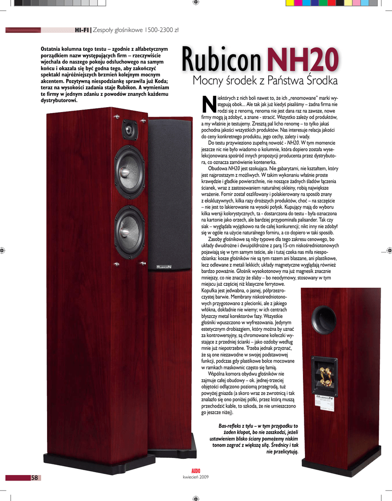 HI-FI Zespoły głośnikowe 1500-2300 zł Ostatnia kolumna tego testu – zgodnie z alfabetycznym porządkiem nazw występujących firm – rzeczywiście wjechała do naszego pokoju odsłuchowego na samym końcu i okazała się być godna tego, aby zakończyć spektakl najróżniejszych brzmień kolejnym mocnym akcentem. Pozytywną niespodziankę sprawiła już Koda; teraz na wysokości zadania staje Rubikon. A wymieniam te firmy w jednym zdaniu z powodów znanych każdemu dystrybutorowi. Rubicon NH20 Mocny środek z Państwa Środka N iektórych z nich boli nawet to to, że ich „renomowane” renomowane” marki występują obok... Ale tak jak już kiedyś pisaliśmy – żadna firma nie rodzi się z renomą, renoma nie jest dana raz na zawsze, nowe firmy mogą ją zdobyć, a znane - stracić. Wszystko zależy od produktów, a my właśnie je testujemy. Zresztą pal licho renomę – to tylko jakaś pochodna jakości wszystkich produktów. Nas interesuje relacja jakości do ceny konkretnego produktu, jego cechy, zalety i wady. Do testu przywieziono zupełną nowość - NH20. W tym momencie jeszcze nic nie było wiadomo o kolumnie, która dopiero została wyselekcjonowana spośród innych propozycji producenta przez dystrybutora, co oznacza zamówienie kontenerka. Obudowa NH20 jest szokująca. Nie gabarytami, nie kształtem, który jest najprostszym z możliwych. W takim wykonaniu właśnie proste krawędzie i gładkie powierzchnie, nie noszące żadnych śladów łączenia ścianek, wraz z zastosowaniem naturalnej okleiny, robią największe wrażenie. Fornir został oszlifowany i polakierowany na sposób znany z ekskluzywnych, kilka razy droższych produktów, choć – na szczęście – nie jest to lakierowanie na wysoki połysk. Kupujący mają do wyboru kilka wersji kolorystycznych, ta - dostarczona do testu - była oznaczona na kartonie jako orzech, ale bardziej przypominała palisander. Tak czy siak – wyglądała wyjątkowo na tle całej konkurencji; nikt inny nie zdobył się w ogóle na użycie naturalnego forniru, a co dopiero w taki sposób. Zasoby głośnikowe są niby typowe dla tego zakresu cenowego, bo układy dwudrożne i dwuipółdrożne z parą 15-cm niskośredniotonowych pojawiają się w tym samym teście, ale i tutaj czeka nas miła niespodzianka: kosze głośników nie są tym razem ani blaszane, ani plastikowe, lecz odlewane z metali lekkich; układy magnetyczne wyglądają również bardzo poważnie. Głośnik wysokotonowy ma już magnesik znacznie mniejszy, co nie znaczy że słaby – bo neodymowy, stosowany w tym miejscu już częściej niż klasyczne ferrytowe. Kopułka jest jedwabna, o jasnej, półprzezroczystej barwie. Membrany niskośredniotonowych przygotowano z plecionki, ale z jakiego włókna, dokładnie nie wiemy; w ich centrach błyszczy metal korektorów fazy. Wszystkie głośniki wpuszczono w wyfrezowania. Jedynym estetycznym drobiazgiem, który można by uznać za kontrowersyjny, są chromowane kołeczki wystające z przedniej ścianki – jako ozdoby według mnie już niepotrzebne. Trzeba jednak przyznać, że są one niezawodne w swojej podstawowej funkcji, podczas gdy plastikowe bolce mocowane w ramkach maskownic często się łamią. Wspólna komora obydwu głośników nie zajmuje całej obudowy – ok. jednej-trzeciej objętości odłączono poziomą przegrodą, tuż powyżej gniazda (a skoro wraz ze zwrotnicą i tak znalazło się ono poniżej półki, przez którą muszą przechodzić kable, to szkoda, że nie umieszczono go jeszcze niżej). Bas-refleks z tyłu – w tym przypadku to żaden kłopot, bo nie zaszkodzi, jeżeli ustawieniem blisko ściany pomożemy niskim tonom zagrać z większą siłą. Średnicy i tak nie przelicytują. 58 kwiecień 2009 ODSŁUCH Brzmienie NH20 nie jest neutralne, wyrównane, wyrafinowane, jednak jego odchyłki od równowagi tonalnej idą w zupełnie nieoczekiwanym kierunku. Przy całym szacunku dla Rubicona, tanie kolumny producentów zorientowanych na rynek masowy (jednak znowu ta renoma...) mają zwykle wzmocnione skraje pasma. NH20 jakby na przekór takim stereotypom (a może to po prostu wypadek przy pracy...) powstrzymuje te zapędy, ale nie poprzestaje na charakterystyce wyrównanej; wciąż więc nie zadowala się brzmieniem, które ktokolwiek mógłby nazwać nijakim; kreuje wyjątkowe emocje za pomocą wyraźnie wyeksponowanej średnicy. Przy szczęśliwym zbiegu okoliczności – czyli przy odpowiednim materiale muzycznym – efekt jest powalający. Mark Knopfler z płyty Kill To Get Crimson, nagranej w typowej dla niego, „ciemnoszarej” tonacji, zabrzmiał wyjątkowo żywo. Po prostu profil tonalny kolumn doskonale skorygował manierę realizacyjną, ta z kolei nie pozwoliła do końca wyzwolić energii, jaka pojawia się przy odtwarzaniu standardowo, czyli jaśniej nagranych płyt. Wówczas dominacja średnicy staje się już tak oczywista, że trudno pominąć wniosek o zachwianiu neutralności, a mimo to jakoś udaje się Rubiconowi uniknąć prymitywnej natarczywości; na dłuższą metę taka konsekwencja, nadająca różnym nagraniom podobny, bardzo bezpośredni charakter może się i znudzi, ale zanim to się stanie, musimy przesłuchać wszystkie płyty i wszystkie odkryć na nowo. Rubicon nada im nowy muzyczny sens, niemal nowy wymiar, nie tylko wydobędzie na powierzchnię dźwięki wcześniej drugoplanowe, ale też wciąż niczego ważnego nie zgubi i nie stłumi, chociaż poukłada na nowo. Sposób, w jaki promuje średnicę, jest tak odważny, a z drugiej strony tak umiejętnie zestrojony, że trudno jest się oprzeć magii tej manipulacji, nawet przy pełnej świadomości zachodzącego konfliktu ze standardem neutralności. A jestem pewien, że wielu słuchaczy w ogóle tego konfliktu nie zauważy, sądząc, że taka właśnie, mocna, nasycona, żywiołowa średnica jest naturalnym elementem brzmienia najwyższej próby, osiągniętego jakimś sposobem w produkcie za tak umi
