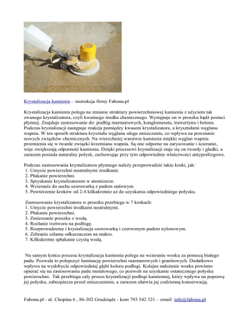 Krystalizacja kamienia – instrukcja firmy Fabona.pl Krystalizacja kamienia polega na zmianie struktury powierzchniowej kamienia z użyciem tak zwanego krystalizatora, czyli kwaśnego środka chemicznego. Występuje on w proszku bądź postaci płynnej. Znajduje zastosowanie do: podłóg marmurowych, konglomeratu, trawertynu i betonu. Podczas krystalizacji następuje reakcja pomiędzy kwasem krystalizatora, a kryształami węglanu wapnia. W ten sposób struktura kryształu węglanu ulega zniszczeniu, co wpływa na powstanie nowych związków chemicznych. Na wierzchniej warstwie kamienia miękki węglan wapnia przemienia się w twarde związki krzemianu wapnia. Są one odporne na zarysowanie i ścieranie, więc zwiększają odporność kamienia. Dzięki procesowi krystalizacji staje się on twardy i gładki, a zarazem posiada naturalny połysk, zachowując przy tym odpowiednie właściwości antypoślizgowe. Podczas zastosowania krystalizatora płynnego należy przeprowadzić takie kroki, jak: 1. Umycie powierzchni neutralnymi środkami. 2. Płukanie powierzchni. 3. Spryskanie krystalizatorem w atomizerze. 4. Wcieranie do sucha szorowarką z padem stalowym. 5. Powtórzenie kroków od 2-4 kilkakrotnie aż do uzyskania odpowiedniego połysku. Zastosowanie krystalizatora w proszku przebiega w 7 krokach: 1. Umycie powierzchni środkami neutralnymi. 2. Płukanie powierzchni. 3. Zmieszanie proszku z wodą. 4. Rozlanie roztworu na podłogę. 5. Rozprowadzenie i krystalizacja szorowarką i czerwonym padem nylonowym. 6. Zebranie szlamu odkurzaczem na makro. 7. Kilkukrotne spłukanie czystą wodą. Na samym końcu procesu krystalizacja kamienia polega na wcieraniu wosku za pomocą białego padu. Pozwala to polepszyć luminację powierzchni marmurowych i granitowych. Dodatkowo wpływa na wydobycie odpowiedniej głębi koloru podłogi. Kolejne nałożenie wosku powinno opierać się na zastosowaniu padu metalowego, co pozwoli na uzyskanie ostatecznego połysku powierzchni. Tak przebiega cały proces krystalizacji podłogi kamiennej, który wpływa na poprawę jej połysku, zabezpiecza przed zniszczeniem, a zarazem ułatwia jej codzienną konserwację. Fabona.pl - ul. Chopina 6 , 86-302 Grudziądz - kom 793 542 321 – email: [email protected]