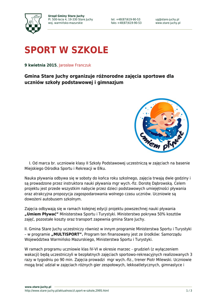 Urząd Gminy Stare Juchy Pl. 500-lecia 4, 19-330 Stare Juchy woj. warmińsko-mazurskie tel. +48(87)619-90-53 faks +48(87)619-90-53 [email protected] www.stare-juchy.pl SPORT W SZKOLE 9 kwietnia 2015, Jarosław Franczuk Gmina Stare Juchy organizuje różnorodne zajęcia sportowe dla uczniów szkoły podstawowej i gimnazjum I. Od marca br. uczniowie klasy II Szkoły Podstawowej uczestniczą w zajęciach na basenie Miejskiego Ośrodka Sportu i Rekreacji w Ełku. Nauka pływania odbywa się w soboty do końca roku szkolnego, zajęcia trwają dwie godziny i są prowadzone przez instruktora nauki pływania mgr wych.-fiz. Dorotę Dąbrowską. Celem projektu jest przede wszystkim nabycie przez dzieci podstawowych umiejętności pływania oraz atrakcyjna propozycja zagospodarowania wolnego czasu uczniów. Uczniowie są dowożeni autobusem szkolnym. Zajęcia odbywają się w ramach kolejnej edycji projektu powszechnej nauki pływania „Umiem Pływać” Ministerstwa Sportu i Turystyki. Ministerstwo pokrywa 50% kosztów zajęć, pozostałe koszty oraz transport zapewnia gmina Stare Juchy. II. Gmina Stare Juchy uczestniczy również w innym programie Ministerstwa Sportu i Turystyki – w programie „MULTISPORT”. Program ten finansowany jest ze środków: Samorządu Województwa Warmińsko Mazurskiego, Ministerstwa Sportu i Turystyki. W ramach programu uczniowie klas IV-VI w okresie marzec - grudzień (z wyłączeniem wakacji) będą uczestniczyli w bezpłatnych zajęciach sportowo-rekreacyjnych realizowanych 3 razy w tygodniu po 90 min. Zajęcia prowadzi mgr wych.-fiz., trener Piotr Milewski. Uczniowie mogą brać udział w zajęciach różnych gier zespołowych, lekkoatletycznych, gimnastyce i www.stare-juchy.pl http://www.stare-juchy.pl/aktualnosci/i,sport-w-szkole,2995.html 1/3 Urząd Gminy Stare Juchy Pl. 500-lecia 4, 19-330 Stare Juchy woj. warmińsko-mazurskie tel. +48(87)619-90-53 faks +48(87)619-90-53 [email protected] www.stare-juchy.pl elementach sportów walki. Głównymi celami programu jest: wspieranie rozwoju dzieci i młodzieży poprzez zwiększenie ich aktywności ruchowej prowadzącej do poprawy sprawności fizycznej, stanu zdrowia i związanej z nim jakości życia; upowszechnienie sportu wśród uczniów szkół podstawowych poprzez zwiększenie liczby dzieci i młodzieży uprawiających różne sporty w ramach pozalekcyjnych i pozaszkolnych zajęć sportowych; poprawa i rozwijanie zdolności motorycznych dzieci i młodzieży; zapoznanie dzieci i młodzieży z różnymi sportami; stworzenie oraz poprawa warunków i dostępu do uprawiania zorganizowanej aktywności fizycznej, rozwoju talentów oraz zainteresowań sportowych dzieci i młodzieży; wyrównywanie szans dzieci i młodzieży w dostępie do sportu, niezależnie od statusu materialnego rodziców; profilaktyka i korygowanie wad postawy; zapobieganie zjawiskom patologii społecznych; optymalne wykorzystanie terenowej infrastruktury sportowej; wzrost liczby dzieci i młodzieży uczestniczących w różnych formach aktywności fizycznej; identyfikacja i rozwijanie talentów sportowych. III. Kolejnym programem jest Animator Sportu. Bierze w nim udział 18 chłopców z gimnazjum Zespołu Szkół Samorządowych. Zajęcia prowadzi mgr wych.-fiz., trener Adam Lewicki, zajęcia odbywają się w okresie roku szkolnego trzy razy w tygodniu. Uczestnicy grają w piłkę nożną. www.stare-juchy.pl http://www.stare-juchy.pl/aktualnosci/i,sport-w-szkole,2995.html 2/3 Urząd Gminy Stare Juchy Pl. 500-lecia 4, 19-330 Stare Juchy woj. warmińsko-mazurskie tel. +48(87)619-90-53 faks +48(87)619-90-53 [email protected] www.stare-juchy.pl Program ten finansowany jest przez Szkolny Związek Sportowy i Gminę Sta Celem programu jest między innymi: zwiększenie aktywności i efektywności działań klubów: uczniowskich, szkolnych, przeciwdziałanie agresji, patologiom społecznym i innym zagrożeniom cywilizacyjnym służące integracji społecznej i wyrównanie szans poprzez sport; wspomaganie działalności klubów - stowarzyszeń w zakresie rozwoju sportu dzieci i młodzieży poprzez szkolenia animatorów; stworzenie, jak największej grupie młodzieży możliwości uczestniczenia w zajęciach sportowych, co sprzyja m.in. wyłanianiu sportowych talentów, wyrównywaniu szans dostępu do sportu, tworzeniu więzi społecznych; aktywizacja lokalnych struktur samorządu terytorialnego i środowisk gospodarczych do współpracy i współfinansowania działalności animatorów; Wszystkie zajęcia odbywają się w hali widowiskowo-sportowej i wraz z poprawą pogody przenoszone będą na boisko wielofunkcyjne. www.stare-juchy.pl http://www.stare-juchy.pl/aktualnosci/i,sport-w-szkole,2995.html 3/3