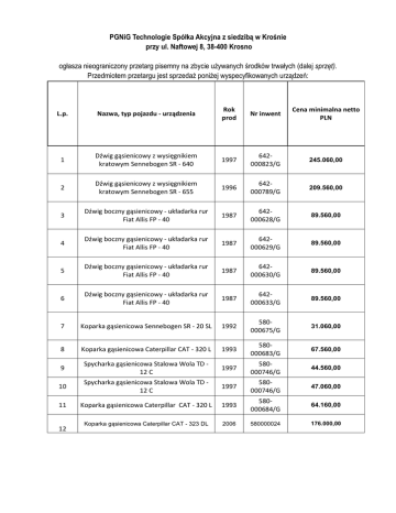 PGNiG Technologie Spółka Akcyjna z siedzibą w Krośnie przy ul. Naftowej 8, 38-400 Krosno ogłasza nieograniczony przetarg pisemny na zbycie używanych środków trwałych (dalej sprzęt). Przedmiotem przetargu jest sprzedaż poniżej wyspecyfikowanych urządzeń: L.p. Nazwa, typ pojazdu - urządzenia Rok prod Nr inwent Cena minimalna netto PLN 1 Dźwig gąsienicowy z wysięgnikiem kratowym Sennebogen SR - 640 1997 642000823/G 245.060,00 2 Dźwig gąsienicowy z wysięgnikiem kratowym Sennebogen SR - 655 1996 642000789/G 209.560,00 3 Dźwig boczny gąsienicowy - układarka rur Fiat Allis FP - 40 1987 642000628/G 89.560,00 4 Dźwig boczny gąsienicowy - układarka rur Fiat Allis FP - 40 1987 642000629/G 89.560,00 5 Dźwig boczny gąsienicowy - układarka rur Fiat Allis FP - 40 1987 642000630/G 89.560,00 6 Dźwig boczny gąsienicowy - układarka rur Fiat Allis FP - 40 1987 642000633/G 89.560,00 7 Koparka gąsienicowa Sennebogen SR - 20 SL 1992 580000675/G 31.060,00 8 Koparka gąsienicowa Caterpillar CAT - 320 L 1993 580000683/G 67.560,00 9 Spycharka gąsienicowa Stalowa Wola TD 12 C 1997 580000746/G 44.560,00 10 Spycharka gąsienicowa Stalowa Wola TD 12 C 1997 580000746/G 47.060,00 11 Koparka gąsienicowa Caterpillar CAT - 320 L 1993 580000684/G 64.160,00 Koparka gąsienicowa Caterpillar CAT - 323 DL 2006 580000024 176.000,00 12