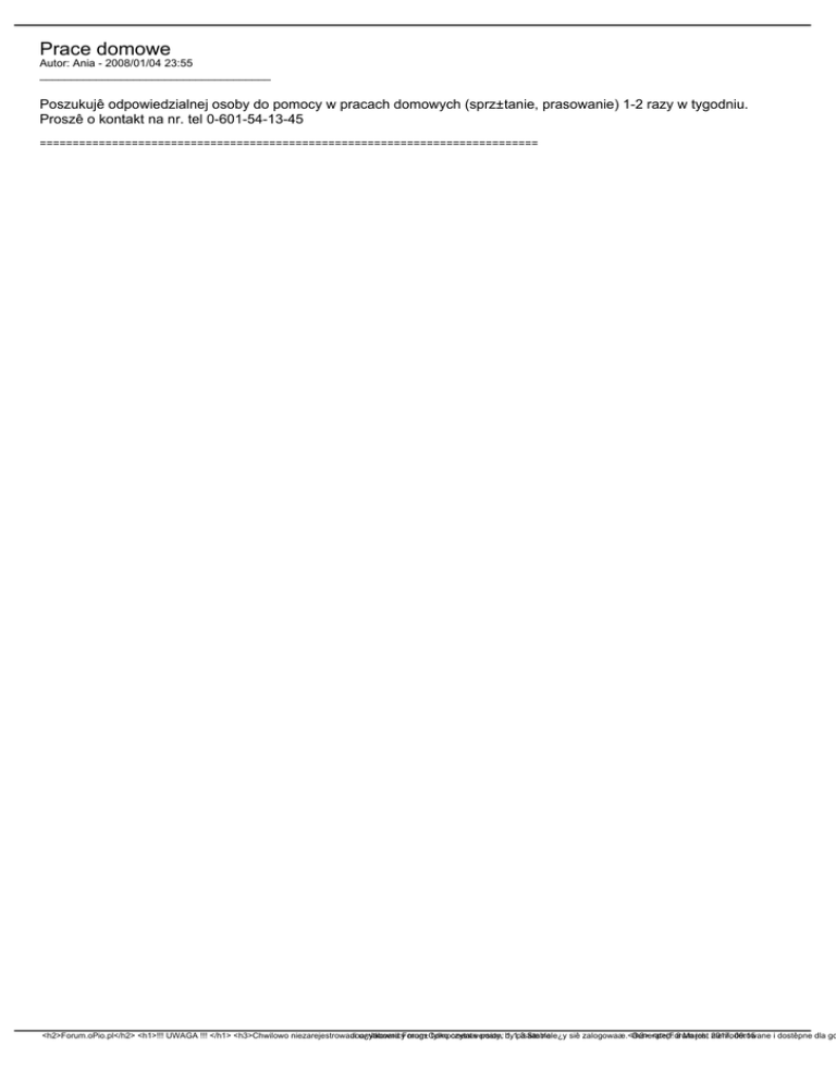 Prace domowe Autor: Ania - 2008/01/04 23:55 _____________________________________ Poszukujê odpowiedzialnej osoby do pomocy w pracach domowych (sprz±tanie, prasowanie) 1-2 razy w tygodniu. Proszê o kontakt na nr. tel 0-601-54-13-45 ============================================================================ <h2>Forum.oPio.pl</h2> <h1>!!! UWAGA !!! </h1> <h3>Chwilowo niezarejestrowani Joomlaboard u¿ytkownicyForum mog±Component tylko czytaæversion: posty, by 1.1.3 pisaæ Stable nale¿y siê zalogowaæ.</h3> Generated: <p>(Forum 8 March, jest 2017, niemoderowane 09:15 i dostêpne dla go