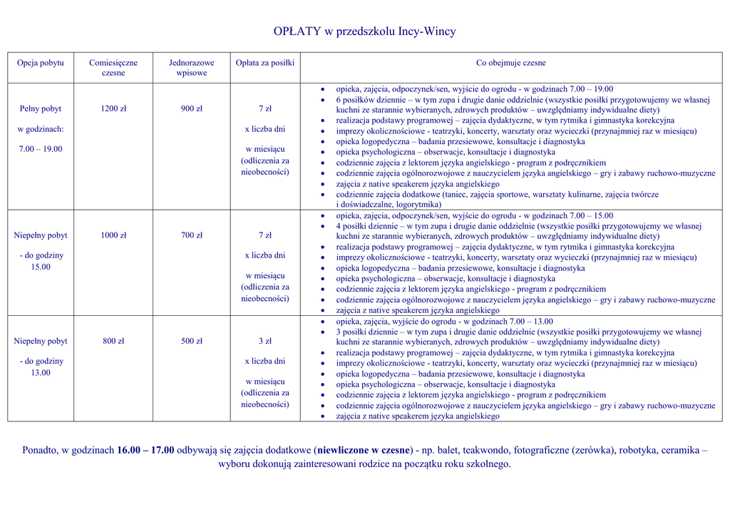 OPŁATY w przedszkolu Incy-Wincy Opcja pobytu Pełny pobyt Comiesięczne czesne 1200 zł Jednorazowe wpisowe 900 zł Opłata za posiłki 7 zł w godzinach: x liczba dni 7.00 – 19.00 w miesiącu (odliczenia za nieobecności) Niepełny pobyt 1000 zł 700 zł - do godziny 15.00 Niepełny pobyt - do godziny 13.00 7 zł x liczba dni w miesiącu (odliczenia za nieobecności) 800 zł 500 zł 3 zł x liczba dni w miesiącu (odliczenia za nieobecności) Co obejmuje czesne opieka, zajęcia, odpoczynek/sen, wyjście do ogrodu - w godzinach 7.00 – 19.00 6 posiłków dziennie – w tym zupa i drugie danie oddzielnie (wszystkie posiłki przygotowujemy we własnej kuchni ze starannie wybieranych, zdrowych produktów – uwzględniamy indywidualne diety) realizacja podstawy programowej – zajęcia dydaktyczne, w tym rytmika i gimnastyka korekcyjna imprezy okolicznościowe - teatrzyki, koncerty, warsztaty oraz wycieczki (przynajmniej raz w miesiącu) opieka logopedyczna – badania przesiewowe, konsultacje i diagnostyka opieka psychologiczna – obserwacje, konsultacje i diagnostyka codziennie zajęcia z lektorem języka angielskiego - program z podręcznikiem codziennie zajęcia ogólnorozwojowe z nauczycielem języka angielskiego – gry i zabawy ruchowo-muzyczne zajęcia z native speakerem języka angielskiego codziennie zajęcia dodatkowe (taniec, zajęcia sportowe, warsztaty kulinarne, zajęcia twórcze i doświadczalne, logorytmika) opieka, zajęcia, odpoczynek/sen, wyjście do ogrodu - w godzinach 7.00 – 15.00 4 posiłki dziennie – w tym zupa i drugie danie oddzielnie (wszystkie posiłki przygotowujemy we własnej kuchni ze starannie wybieranych, zdrowych produktów – uwzględniamy indywidualne diety) realizacja podstawy programowej – zajęcia dydaktyczne, w tym rytmika i gimnastyka korekcyjna imprezy okolicznościowe - teatrzyki, koncerty, warsztaty oraz wycieczki (przynajmniej raz w miesiącu) opieka logopedyczna – badania przesiewowe, konsultacje i diagnostyka opieka psychologiczna – obserwacje, konsultacje i diagnostyka codziennie zajęcia z lektorem języka angielskiego - program z podręcznikiem codziennie zajęcia ogólnorozwojowe z nauczycielem języka angielskiego – gry i zabawy ruchowo-muzyczne zajęcia z native speakerem języka angielskiego opieka, zajęcia, wyjście do ogrodu - w godzinach 7.00 – 13.00 3 posiłki dziennie – w tym zupa i drugie danie oddzielnie (wszystkie posiłki przygotowujemy we własnej kuchni ze starannie wybieranych, zdrowych produktów – uwzględniamy indywidualne diety) realizacja podstawy programowej – zajęcia dydaktyczne, w tym rytmika i gimnastyka korekcyjna imprezy okolicznościowe - teatrzyki, koncerty, warsztaty oraz wycieczki (przynajmniej raz w miesiącu) opieka logopedyczna – badania przesiewowe, konsultacje i diagnostyka opieka psychologiczna – obserwacje, konsultacje i diagnostyka codziennie zajęcia z lektorem języka angielskiego - program z podręcznikiem codziennie zajęcia ogólnorozwojowe z nauczycielem języka angielskiego – gry i zabawy ruchowo-muzyczne zajęcia z native speakerem języka angielskiego Ponadto, w godzinach 16.00 – 17.00 odbywają się zajęcia dodatkowe (niewliczone w czesne) - np. balet, teakwondo, fotograficzne (zerówka), robotyka, ceramika – wyboru dokonują zainteresowani rodzice na początku roku szkolnego.
