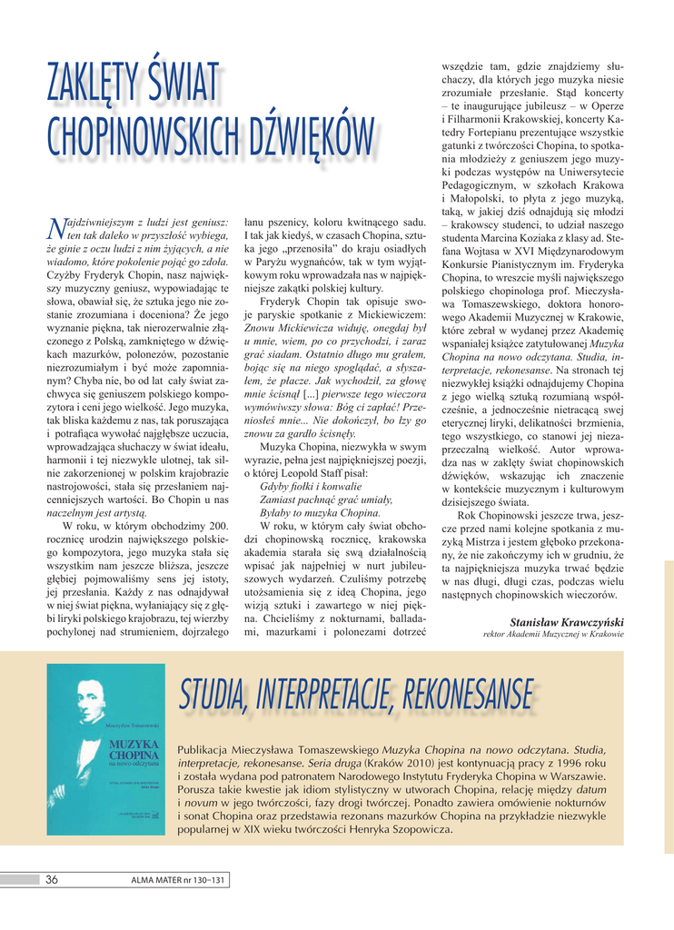 ZAKLĘTY ŚWIAT CHOPINOWSKICH DŹWIĘKÓW N ajdziwniejszym z ludzi jest geniusz: ten tak daleko w przyszłość wybiega, że ginie z oczu ludzi z nim żyjących, a nie wiadomo, które pokolenie pojąć go zdoła. Czyżby Fryderyk Chopin, nasz największy muzyczny geniusz, wypowiadając te słowa, obawiał się, że sztuka jego nie zostanie zrozumiana i doceniona? Że jego wyznanie piękna, tak nierozerwalnie złączonego z Polską, zamkniętego w dźwiękach mazurków, polonezów, pozostanie niezrozumiałym i być może zapomnianym? Chyba nie, bo od lat cały świat zachwyca się geniuszem polskiego kompozytora i ceni jego wielkość. Jego muzyka, tak bliska każdemu z nas, tak poruszająca i potrafiąca wywołać najgłębsze uczucia, wprowadzająca słuchaczy w świat ideału, harmonii i tej niezwykle ulotnej, tak silnie zakorzenionej w polskim krajobrazie nastrojowości, stała się przesłaniem najcenniejszych wartości. Bo Chopin u nas naczelnym jest artystą. W roku, w którym obchodzimy 200. rocznicę urodzin największego polskiego kompozytora, jego muzyka stała się wszystkim nam jeszcze bliższa, jeszcze głębiej pojmowaliśmy sens jej istoty, jej przesłania. Każdy z nas odnajdywał w niej świat piękna, wyłaniający się z głębi liryki polskiego krajobrazu, tej wierzby pochylonej nad strumieniem, dojrzałego łanu pszenicy, koloru kwitnącego sadu. I tak jak kiedyś, w czasach Chopina, sztuka jego „przenosiła” do kraju osiadłych w Paryżu wygnańców, tak w tym wyjątkowym roku wprowadzała nas w najpiękniejsze zakątki polskiej kultury. Fryderyk Chopin tak opisuje swoje paryskie spotkanie z Mickiewiczem: Znowu Mickiewicza widuję, onegdaj był u mnie, wiem, po co przychodzi, i zaraz grać siadam. Ostatnio długo mu grałem, bojąc się na niego spoglądać, a słyszałem, że płacze. Jak wychodził, za głowę mnie ścisnął [...] pierwsze tego wieczora wymówiwszy słowa: Bóg ci zapłać! Przeniosłeś mnie... Nie dokończył, bo łzy go znowu za gardło ścisnęły. Muzyka Chopina, niezwykła w swym wyrazie, pełna jest najpiękniejszej poezji, o której Leopold Staff pisał: Gdyby fiołki i konwalie Zamiast pachnąć grać umiały, Byłaby to muzyka Chopina. W roku, w którym cały świat obchodzi chopinowską rocznicę, krakowska akademia starała się swą działalnością wpisać jak najpełniej w nurt jubileuszowych wydarzeń. Czuliśmy potrzebę utożsamienia się z ideą Chopina, jego wizją sztuki i zawartego w niej piękna. Chcieliśmy z nokturnami, balladami, mazurkami i polonezami dotrzeć wszędzie tam, gdzie znajdziemy słuchaczy, dla których jego muzyka niesie zrozumiałe przesłanie. Stąd koncerty – te inaugurujące jubileusz – w Operze i Filharmonii Krakowskiej, koncerty Katedry Fortepianu prezentujące wszystkie gatunki z twórczości Chopina, to spotkania młodzieży z geniuszem jego muzyki podczas występów na Uniwersytecie Pedagogicznym, w szkołach Krakowa i Małopolski, to płyta z jego muzyką, taką, w jakiej dziś odnajdują się młodzi – krakowscy studenci, to udział naszego studenta Marcina Koziaka z klasy ad. Stefana Wojtasa w XVI Międzynarodowym Konkursie Pianistycznym im. Fryderyka Chopina, to wreszcie myśli największego polskiego chopinologa prof. Mieczysława Tomaszewskiego, doktora honorowego Akademii Muzycznej w Krakowie, które zebrał w wydanej przez Akademię wspaniałej książce zatytułowanej Muzyka Chopina na nowo odczytana. Studia, interpretacje, rekonesanse. Na stronach tej niezwykłej książki odnajdujemy Chopina z jego wielką sztuką rozumianą współcześnie, a jednocześnie nietracącą swej eterycznej liryki, delikatności brzmienia, tego wszystkiego, co stanowi jej niezaprzeczalną wielkość. Autor wprowadza nas w zaklęty świat chopinowskich dźwięków, wskazując ich znaczenie w kontekście muzycznym i kulturowym dzisiejszego świata. Rok Chopinowski jeszcze trwa, jeszcze przed nami kolejne spotkania z muzyką Mistrza i jestem głęboko przekonany, że nie zakończymy ich w grudniu, że ta najpiękniejsza muzyka trwać będzie w nas długi, długi czas, podczas wielu następnych chopinowskich wieczorów. Stanisław Krawczyński rektor Akademii Muzycznej w Krakowie STUDIA, INTERPRETACJE, REKONESANSE Publikacja Mieczysława Tomaszewskiego Muzyka Chopina na nowo odczytana. Studia, interpretacje, rekonesanse. Seria druga (Kraków 2010) jest kontynuacją pracy z 1996 roku i została wydana pod patronatem Narodowego Instytutu Fryderyka Chopina w Warszawie. Porusza takie kwestie jak idiom stylistyczny w utworach Chopina, relację między datum i novum w jego twórczości, fazy drogi twórczej. Ponadto zawiera omówienie nokturnów i sonat Chopina oraz przedstawia rezonans mazurków Chopina na przykładzie niezwykle popularnej w XIX wieku twórczości Henryka Szopowicza. 36 ALMA MATER nr 130–131