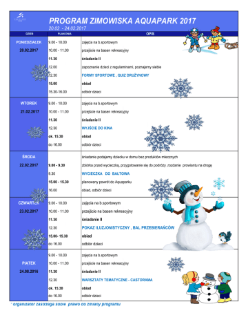 PROGRAM ZIMOWISKA AQUAPARK 2017 20.02 - 24.02.2017 DZIEŃ PLAN DNIA OPIS PONIEDZIAŁEK 9.00 - 10.00 zajęcia na b.sportowym 20.02.2017 10.00 - 11.00 przejście na basen rekreacyjny 11.30 śniadanie II 12.00 zapoznanie dzieci z regulaminami, poznajemy siebie 12.30 FORMY SPORTOWE , QUIZ DRUŻYNOWY 15.00 obiad 15.30-16.00 odbiór dzieci WTOREK 9.00 - 10.00 zajęcia na b.sportowym 21.02.2017 10.00 - 11.00 przejście na basen rekreacyjny 11.30 śniadanie II 12.30 WYJŚCIE DO KINA ok. 15.30 obiad do 16.00 odbiór dzieci ŚRODA 22.02.2017 śniadanie podajemy dziecku w domu bez produktów mlecznych 9.00 - 9.30 zbiórka przed wycieczką, przygotowanie się do podróży ,rozdanie prowiantu na drogę 9.30 WYCIECZKA DO BAŁTOWA 15.00 - 15.30 planowany powrót do Aquaparku 16.00 obiad, odbiór dzieci CZWARTEK 9.00 - 10.00 zajęcia na b.sportowym 23.02.2017 10.00 - 11.00 przejście na basen rekreacyjny 11.30 śniadanie II 12.30 POKAZ ILUZJONISTYCZNY , BAL PRZEBIERAŃCÓW 15.00- 15.30 obiad do 16.00 odbiór dzieci 9.00 - 10.00 zajęcia na b.sportowym 10.00 - 11.00 przejście na basen rekreacyjny 11.30 śniadanie II 12.30 WARSZTATY TEMATYCZNE - CASTORAMA ok. 15.30 obiad do 16.00 odbiór dzieci PIĄTEK 24.08.2016 * organizator zastrzega sobie prawo do zmiany programu