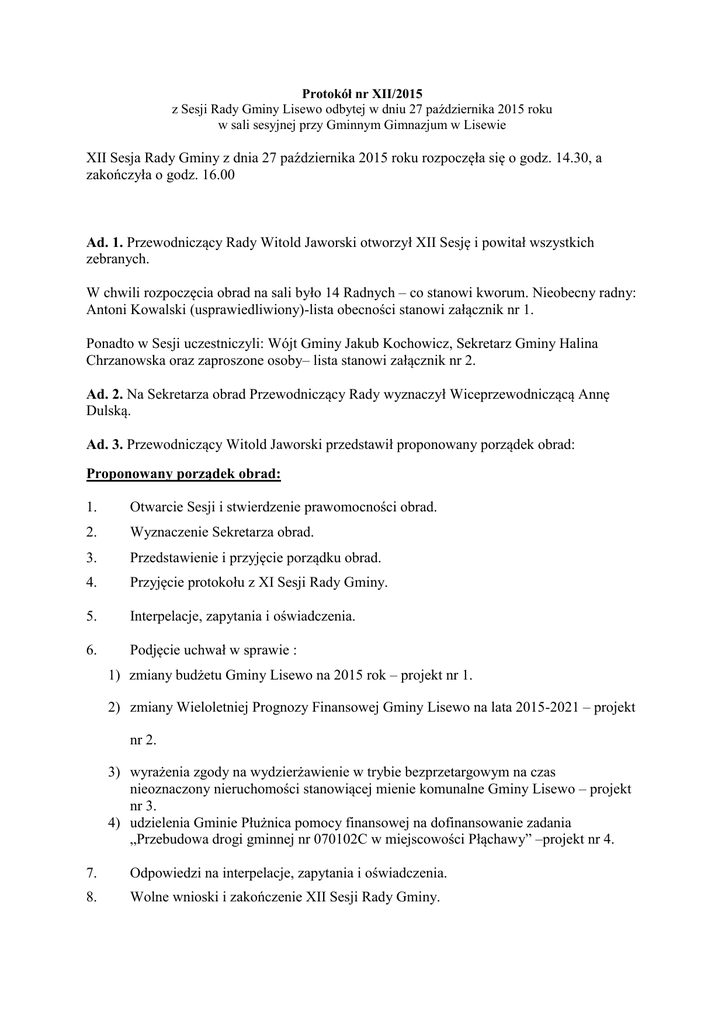 Protokół nr XII/2015 z Sesji Rady Gminy Lisewo odbytej w dniu 27 października 2015 roku w sali sesyjnej przy Gminnym Gimnazjum w Lisewie XII Sesja Rady Gminy z dnia 27 października 2015 roku rozpoczęła się o godz. 14.30, a zakończyła o godz. 16.00 Ad. 1. Przewodniczący Rady Witold Jaworski otworzył XII Sesję i powitał wszystkich zebranych. W chwili rozpoczęcia obrad na sali było 14 Radnych – co stanowi kworum. Nieobecny radny: Antoni Kowalski (usprawiedliwiony)-lista obecności stanowi załącznik nr 1. Ponadto w Sesji uczestniczyli: Wójt Gminy Jakub Kochowicz, Sekretarz Gminy Halina Chrzanowska oraz zaproszone osoby– lista stanowi załącznik nr 2. Ad. 2. Na Sekretarza obrad Przewodniczący Rady wyznaczył Wiceprzewodniczącą Annę Dulską. Ad. 3. Przewodniczący Witold Jaworski przedstawił proponowany porządek obrad: Proponowany porządek obrad: 1. Otwarcie Sesji i stwierdzenie prawomocności obrad. 2. Wyznaczenie Sekretarza obrad. 3. Przedstawienie i przyjęcie porządku obrad. 4. Przyjęcie protokołu z XI Sesji Rady Gminy. 5. Interpelacje, zapytania i oświadczenia. 6. Podjęcie uchwał w sprawie : 1) zmiany budżetu Gminy Lisewo na 2015 rok – projekt nr 1. 2) zmiany Wieloletniej Prognozy Finansowej Gminy Lisewo na lata 2015-2021 – projekt nr 2. 3) wyrażenia zgody na wydzierżawienie w trybie bezprzetargowym na czas nieoznaczony nieruchomości stanowiącej mienie komunalne Gminy Lisewo – projekt nr 3. 4) udzielenia Gminie Płużnica pomocy finansowej na dofinansowanie zadania „Przebudowa drogi gminnej nr 070102C w miejscowości Płąchawy” –projekt nr 4. 7. Odpowiedzi na interpelacje, zapytania i oświadczenia. 8. Wolne wnioski i zakończenie XII Sesji Rady Gminy. Głosowanie: 14 za. Porządek został przyjęty jednogłośnie. Ad. 4 Przewodniczący Rady Gminy poddał pod głosowanie przyjęcie protokołu z XI Sesji RG. Głosowanie : 14 za Protokół został przyjęty jednogłośnie. Ad. 5 Radny Edmund Szymborski zapytał Wójta Gminy o powołanie obwodowych komisji wyborczych i procedurę losowania. Ponadto zapytał czy są planowane obchody święta 11 listopada br. Poprosił o wystąpienie do Zarządcy drogi o wykoszenie poboczy w Kornatowie. Zaproponował zorganizowanie orszaku na Trzech Króli. Zapytał czy coś wiadomo na temat wykonania zejścia z peronu. Zwrócił się z zapytaniem do Przewodniczącego Rady Gminy w jakim celu pracownik Biura Rady zbiera informacje na temat działalności radnych poza RG. Ad. 6 a) Skarbnik Gminy Henryka Świątkowska przedstawiła projekt uchwały w sprawie zmian budżetu Gminy Lisewo na 2015 rok wraz z uzasadnieniem - załącznik nr 3. Projekt uchwały został wyświetlony na slajdzie. Radna Anna Dulska zapytała o opłatę za wyłączenie z produkcji rolne. Wójt Gminy Jakub Łochowicz poinformował, że sprawa trwa trzeci rok. Wyświetlił działkę po firmie SKANSKA. Starostwo naliczyło opłaty z tytułu wyłączenia działki. Gmina toczyła spór ze starostwem. Dostaliśmy nakaz zapłaty z Urzędu Marszałkowskiego. Poprosiliśmy o opinię p. Mecenas, która uznała , że nie ma podstaw prawnych żeby nie płacić. Rocznie 12 tys. zł plus odsetki. W tym roku jesteśmy zobowiązani zapłacić ponad 40 tys zł. Jest aneks podpisany przez poprzednika w którym firma SKANSKA zwolniona jest z rekultywacji gruntu. Opłata będzie naliczana jeszcze przez 15 lat. Trzeba zastanowić się nad dalszym zagospodarowaniem tego placu. Przewodniczący Rady Gminy zapytał dlaczego nie było płacone sukcesywnie. Wójt Gminy odpowiedział, że jest to pytanie do poprzednika. Skarbnik Gminy Henryka Świątkowska odpowiedziała, ze były prowadzone rozmowy ze Starostwem. Opinia radcy była, że gmina nie powinna płacić. Nie miałam polecenia zapłaty. Radna Anna Dulska zapytała o godziny otwarcia świetlicy i sens zwiększenia etatu. Szukamy oszczędności a zatrudniana jest osoba na cały etat bez uzasadnienia. Wójt Gminy Jakub Kochowicz powiedział, że nie zna grafiku na pamięć. Można to wypracować i np. część etatu może dopełniać pracą w np. w GCI. Jednak trzeba to przemyśleć i przedyskutować. Nie jest to decyzja na dziś. Radna Anna Dulska powiedziała, że zwiększany jest etat bez sprawdzenia. Wójt Gminy Jakub Kochowicz powiedział, że pani w świetlicy ma tez inne obowiązki. Radny Edmund Szymborski zgłosił wniosek o wykreślenie zapisu z uchwały o zwiększeniu etatu. Radny Marek Szpręglewski powiedział, że osoba która wnioskowała o zwiększenie etatu powinna to uzasadnić. Wójt Gminy Jakub Kochowicz poinformował, że pani w świetlicy zostało zwiększone 8 godzin w świetlicy szkolnej. Skarbnik Gminy poinformowała, że zwiększenie etatu nastąpiło od 1 września. W związku z tym tej pani trzeba wypłacić wynagrodzenie. Radna Anna Dulska powiedziała, ze ta pani pracuje w świetlicy środowiskowej od 10 - 13 nie mając dzieci, od 13-15 w świetlicy szkolnej i później wraca do świetlicy środowiskowej. Wójt Gminy poinformował, że świetlicę szkolną ma w różnych godzinach. Dodał, że etat został zwiększony o 1/4 ponieważ zwiększono ilość godzin pracy. Radna Anna Dulska powiedziała, że ta pani miała 3/4 etatu i pracowała od 13-tej i to miało większy sens bo dzieci mogły przyjść po szkole . Natomiast od 10 -tej czynna świetlica środowiskowa jest nieuzasadniona. Chyba, że wykonuje inne obowiązki. Świetlica środowiskowa dla sadowiska nie dla szkoły. Wójt Gminy Jakub Kochowicz powiedział, że jeśli ta pani dostała dodatkowe obowiązki i godziny pracy to uzasadnione jest zwiększenie etatu. Przewod. Rady Gminy Witold Jaworski zapytał czy p. Agata jest nauczycielem i czy korzysta z Karty nauczyciela. Wójt Gminy odpowiedział, że jest pedagogiem i nie korzysta z karty nauczyciela. Radna Anna Dulska powiedziała, że świetlica środowiskowa ma sens w godzinach od 13-tej wtedy kiedy dzieci kończą lekcje. Przewodniczący Rady Gminy zapytał p. Skar
