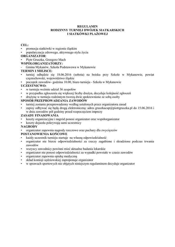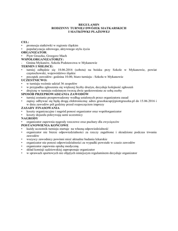 REGULAMIN RODZINNY TURNIEJ DWÓJEK SIATKARSKICH I SIATKÓWKI PLAŻOWEJ CEL: • promocja siatkówki w regionie śląskim • popularyzacja zdrowego, aktywnego stylu życia ORGANIZATOR: • Piotr Gruszka, Grzegorz Mach WSPÓŁORGANIZATORZY: - Gmina Mykanów, Szkoła Podstawowa w Mykanowie TERMIN I MIEJSCE: • turniej odbędzie się 18.06.2016 (sobota) na boisku przy Szkole w Mykanowie, powiat częstochowski, województwo śląskie • początek zawodów- godzina 10.00, biuro turnieju - Szkoła w Mykanowie UCZESTNICWO: • w turnieju weźmie udział 36 zespołów • w przypadku zgłoszenia się większej liczby drużyn, decyduje kolejność zgłoszeń • drużynę w turnieju rodzinnym tworzą dwie spokrewnione ze sobą osoby SPOSÓB PRZEPROWADZANIA ZAWODÓW • turniej zostanie przeprowadzony według ustalonych przez organizatora zasad • zapisy odbywać się będą drogą elektroniczną: adres [email protected] do 15.06.2016 i w dniu zawodów pół godziny przed rozpoczęciem imprezy ZASADY FINASOWANIA • koszty organizacyjne i nagród ponosi organizator oraz współorganizator • koszty dojazdu pokrywają sami uczestnicy NAGRODY • organizator zapewnia nagrody rzeczowe oraz puchary dla zwycięzców POSTANOWIENIA KOŃCOWE • każdy uczestnik turnieju startuje na własną odpowiedzialność • organizator nie bierze odpowiedzialności za rzeczy zagubione i skradzione podczas trwania zawodów • wszyscy zawodnicy powinni mieć aktualne badania lekarskie • organizator nie ponosi odpowiedzialności za wypadki powstałe w czasie zawodów • organizator zapewnia opiekę medyczną • skład komisji sędziowskiej zaproponuje organizator • w sprawach sportowych nie objętych niniejszym regulaminem decyduje organizator