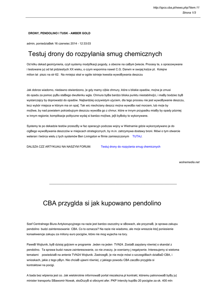http://spcs.cba.pl/news.php?item.11 Strona 1/3 DRONY, PENDOLINO I TUSK - AMBER GOLD admin, poniedziaBek 16 czerwiec 2014 - 12:33:03 Testuj drony do rozpylania smug chemicznych Od kilku dekad geoin|ynieria, czyli systemy modyfikacji pogody, s obecne na caBym [wiecie. Procesy te, s opracowywane i testowane ju| od lat pidziesitych XX wieku, o czym wspomina nawet C.G. Darwin w swojej ksi|ce pt. Kolejne milion lat piszc na str 62. Na mniejsz skal w ogóle istnieje kwestia wywoBywania deszczu Jak dobrze wiadomo, niedawno stwierdzono, |e gdy mamy ci|kie chmury, które s bliskie opadów, mo|na je zmusi do opadu za pomoc pyBu staBego dwutlenku wgla. Chmura byBa bardzo bliska punktu niestabilno[ci, i maBy bodziec byB wystarczajcy by doprowadzi do opadów. Najbardziej oczywistym u|yciem, dla tego procesu nie jest wywoBywanie deszczu, lecz wybór miejsca w którym ma on spa[. Tak wic niechciany deszcz mo|na wywoBa nad morzem, lub mo|e by mo|liwe, by nad powiatem potrzebujcym deszczu wywoBa go z chmur, które w innym przypadku miaBy by opady pózniej w innym regionie; komplikacje polityczne wydaj si bardzo mo|liwe, je[li byBoby to wykonywane. Systemy te po dekadzie testów przeszBy w faz operacyjn podczas wojny w Wietnamie gdzie wykorzystywano je do cigBego wywoBywania deszczów w miejscach strategicznych, by m.in. zatrzymywa dostawy broni. Mówi o tym otwarcie weteran i twórca wielu z tych systemów Ben Livingston w filmie zamieszczonym DALSZA CZZ ARTYKUAU NA NASZYM FORUM: TUTAJ. Testuj drony do rozpylania smug chemicznych wolnemedia.net _______________________________________________________________________________ CBA przyglda si jak kupowano pendolino Szef Centralnego Biura Antykorupcyjnego na razie jest bardzo oszczdny w sBowach, ale przyznaB, |e sprawa zakupu pendolino budzi zainteresowanie CBA. Co to oznacza? Na razie nie wiadomo, ale mo|e wreszcie kto[ poniesienie konsekwencje zakupu za miliony euro pocigów, które nie mog wyjecha na tory. PaweB Wojtunik, byB dzisiaj go[ciem w programie Jeden na jeden TVN24. ZostaB zapytany równie| o skandal z pendolino. Ta sprawa budzi nasze zainteresowanie, co nie znaczy, |e oceniamy j negatywnie. Interesujemy si wieloma tematami powiedziaB na antenie TVN24 Wojtunik. ZastrzegB, |e nie mo|e mówi o szczegóBach dziaBaD CBA, i wnioskach, jakie z tego pByn. Nie chciaB ujawni równie|, z jakiego powodu CBA zaczBo przyglda si kontraktowi na pocigi. A bada bez wtpienia jest co. Jak wielokrotnie informowaB portal niezalezna.pl kontrakt, któremu patronowaB byBy ju| minister transportu SBawomir Nowak, skoDczyB si olbrzymi afer. PKP Intercity kupiBo 20 pocigów za ok. 400 mln http://spcs.cba.pl/news.php?item.11 Strona 2/3 euro. Kontrakt o warto[ci 665 mln euro obejmuje tak|e budow zaplecza technicznego w Warszawie oraz koszty utrzymania technicznego pocigów przez 17 lat. A pendolino poza próbny jazdami nie wyjechaBo na tory, i szybko to si nie stanie, bo brakuje homologacji pozwalajcej na poruszanie si pocigów z prdko[ci do 250 km/h. W poBowie maja ostro skandalu wypowiedziaB si nawet wicepremier i minister gospodarki Janusz PiechociDski, który stwierdziB: Ten kontrakt skoDczy si konfliktem. Nie zostaBy speBnione warunki zamówienia. wolnemedia.net _______________________________________________________________________________ Tusk od dawna wiedziaB o aferze Amber Gold Publikujemy nowe fragmenty stenogramów z ujawnionych przez tygodnik Wprost nagraD. ByBy wiceminister finansów, a od 2013 roku wiceprezes zarzdu ds. korporacyjnych PGNiG Andrzej Parafianowicz, rozmawiajc ze SBawomirem Nowakiem otwarcie przyznaje, |e podpisane zostaBy niekorzystne umowy ws. budowy gazoportu w Zwinouj[ciu i nale|y spodziewa si du|ych opóznieD. Specustawa, na podstawie której powstaje terminal skroplonego gazu LNG, obowizuje od piciu lat, a inwestycja realizowana jest od trzech. Przez te wszystkie lata rzd Donalda Tuska nie zadbaB, |eby przywo|ony z Kataru i skBadowany w Zwinouj[ciu gaz mo|na byBo sprawnie rozprowadzi po kraju. Jeszcze w marcu rzd zabiegaB o uproszczenie procedur, które pozwol w przy[pieszonym tempie budowa potrzebne gazocigi. Bez tego [winoujska inwestycja nie bdzie mogBa speBnia swojej roli, czyli zagwarantowa Polsce gazowego bezpieczeDstwa. Nowe [wiatBo na budow gazocigu rzucaj kolejne fragmenty ujawnionych przez Wprost nagraD. Andrzej Parafianowicz w rozmowie ze SBawomirem Nowakiem przyznaje, |e sytuacja nie tylko jego, ale tak|e pozostaBych czBonków zarzdu PGNiG jest bardzo trudna. Wszystko przez kontrowersje zwizane z dostawami katarskiego gazu. Poni|ej publikujemy nowe fragmenty stenogramów z ujawnionych przez Wprost nagraD: ANDRZEJ PARAFIANOWICZ: Mówi ci, jest co robi, tylko |e nas za chwil wymiot za kaftan. SAAWOMIR NOWAK: Dlaczego? ANDRZEJ PARAFIANOWICZ: A gdzie rozBadowa tankowce? SAAWOMIR NOWAK: No, no w Zwinouj[ciu (tam powstaje terminal LNG red.), nie? ANDRZEJ PARAFIANOWICZ: A jest? SAAWOMIR NOWAK: No s [...] troch opóznienia. http://spcs.cba.pl/news.php?item.11 Strona 3/3 ANDRZEJ PARAFIANOWICZ: Oni (poprzednicy red.) podpisali takie niekorzystne umowy, co pozwala WBochom [firmie stojcej na czele konsorcjum budowy LNG - red.] si bezkarnie opóznia. KONTYNUACJA ARTYKUAU NA NASZYM FORUM: Tusk od dawna wiedziaB o aferze Amber Gold wolnemedia.net