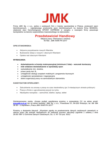 Firma JMK Sp. z o.o., jedna z czołowych firm z branży oponiarskiej w Polsce, producent opon bieżnikowanych, – największego producenta opon bieżnikowanych na świecie firmy BANDAG, właściciel sieci franchisingowej OPONY EXPRESS w związku z rozwojem firmy poszukuje kandydatów na terenie województwa mazowieckiego na stanowisko: Przedstawiciel Handlowy Miejsce pracy: Warszawa (i okolice) Nr Ref.: JMK WAR PH 2017 OPIS STANOWISKA: Aktywne pozyskiwanie nowych Klientów Budowanie relacji z nowymi i obecnymi Klientami Opieka nad obecnymi Klientami WYMAGANIA: doświadczenie w branży motoryzacyjnej (minimum 2 lata) – warunek konieczny mile widziane doświadczenie w sprzedaży opon wykształcenie min. średnie, prawo jazdy kat. B., umiejętność obsługi urządzeń mobilnych i programów biurowych umiejętności sprzedażowe i negocjacyjne dobra organizacji pracy na samodzielnym stanowisku KANDYDATOM OFERUJEMY: Zatrudnienie na umowę o pracę na czas nieokreślony (po 3 miesięcznym okresie próbnym) Pracę w firmie o ugruntowanej pozycji na rynku Niezbędne narzędzia – samochód, telefon, laptop, tablet Zainteresowane osoby, chcące podjąć współpracę prosimy o przesyłanie CV na adres email: [email protected] lub na adres siedziby: JMK Sp. z o.o., Powodowo 51, 64-200 Wolsztyn, tel. 68/ 384 38 56 – z dopiskiem „Praca JMK WAR PH 2017” Prosimy o dopisanie klauzuli: „Wyrażam zgodę na przetwarzanie danych osobowych zawartych w ofercie pracy dla potrzeb niezbędnych do realizacji procesu rekrutacji (zgodnie z ustawą z dnia 29.08.1997 o Ochronie Danych Osobowych, Dz. U. Nr 133 poz. 833)”.
