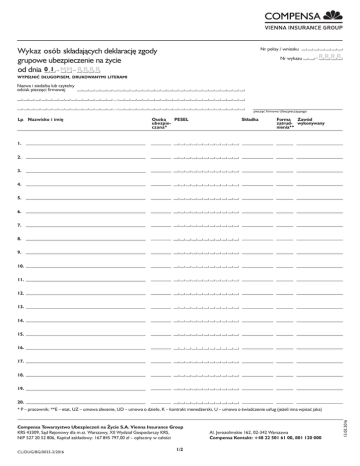 Wykaz osób składających deklarację zgody grupowe ubezpieczenie na życie od dnia 0 1 MM R R R R Nr polisy / wniosku Nr wykazu RRRR WYPEŁNIĆ GRANATOWYM DŁUGOPISEM, DRUKOWANYMI WYPE¸NIĆ LUB CZARNYM LITERAMI D¸UGOPISEM, DRUKOWANYMI LITERAMI Nazwa i siedziba lub czytelny odcisk pieczęci firmowej pieczęć firmowa Ubezpieczającego Lp. Nazwisko i imię Osoba PESEL ubezpieczana* Sk∏adka Forma Zawód zatrud- wykonywany nienia** 1. 1. 2. 2. 3. 3. 4. 4. 5. 5. 6. 6. 7. 7. 8. 8. 9. 9. 10. 10. 11. 11. 12. 12. 13. 13. 14. 14. 15. 15. 16. 16. 17. * P – pracownik, M – ma∏żonek, PA – partner D – dziecko; ** E – etat, UZ – umowa zlecenie, UD – umowa o dzie∏o, K – kontrakt menedżerski, U – umowa o świadczenie us∏ug (jeżeli inna wpisać jaka) OŚWIADCZENIA UBEZPIECZAJĄCEGO 18. 1. Oświadczam, że ww. osoby miały możliwość zapoznania się z ogólnymi warunkami grupowego ubezpieczenia na życie, ubezpieczeń dodatkowych, z zakresem ochrony ubezpieczeniowej, z wysokością sum ubezpieczeń, przed wyrażeniem zgody na zastrzeżenie na ich rzecz ochrony ubezpieczeniowej. 19. 2. Oświadczam, że ww. osoby udzieliły zgody na zastrzeżenie na ich rzecz ochrony ubezpieczeniowej, co jest równoznaczne z udzieleniem zgody na objęcie ochroną ubezpieczeniową, w tym na wysokość sum ubezpieczeń. 20. * P – pracownik; **E – etat, UZ – umowa zlecenie, UD – umowa o dzieło, K – kontrakt menedżerski, U – umowa o świadczenie usług (jeżeli inna wpisać jaka) data, pieczęć i podpis pracownika Compensy przyjmującego wykaz Compensa Towarzystwo Ubezpieczeń na Życie S.A. Vienna Insurance Group KRS 43309, Sąd Rejonowy dla m.st. Warszawy, XII Wydział Wydzia∏ Gospodarczy KRS, KRS, Kapita∏ zakładowy: zak∏adowy: 167 167.845.797,00 op∏acony w ca∏ości NIP 527 20 52 806, Kapitał 845 797,00 zł – opłacony całości CL/DUG/BG/0033-1/2012 CL/DUG/BG/0033-2/2016 1/2 1/1 Al.Al.Jerozolimskie Jerozolimskie162, 162,02-342 02-342Warszawa Warszawa Compensa CompensaKontakt: Kontakt:+48 +482222501 501616100, 00,801 801120 120000 000 15.03.2016 data, pieczęć i podpis Reprezentanta Ubezpieczającego Wykaz osób składających deklarację zgody grupowe ubezpieczenie na życie Wykaz składających Lp. Nazwisko Osoba ubezpieczana* 0 i1imięMM R R R R deklarację zgody od dnia osób grupowe ubezpieczenie na życie WYPE¸NIĆ GRANATOWYM LUB CZARNYM D¸UGOPISEM, DRUKOWANYMI LITERAMI 0 1 MM R R R R od dnia Nazwa i siedziba lub czytelny Nr polisy / wniosku PESEL Nr wykazu Nr polisy / wniosku RRRR Składka Nr wykazu RRRR odcisk pieczęci firmowej 1. WYPE¸NIĆ GRANATOWYM LUB CZARNYM D¸UGOPISEM, DRUKOWANYMI LITERAMI Nazwa i siedziba lub czytelny odcisk pieczęci firmowej 2. pieczęć firmowa Ubezpieczającego 3. Lp. Nazwisko i imię 4. Lp. Nazwisko i imię 1. 5. 2. 1. 6. 3. 7. 2. 4. 8. 3. 9. 5. 4. 10. 6. 5. 11. 7. 6. 12. 8. 7. 13. 9. 8. 14. 10. 9. 15. 11. 10. 16. 12. 11. 17. 13. 12. 18. 14. 13. 19. 15. 14. Osoba PESEL ubezpieczana* Sk∏adka Osoba PESEL ubezpieczana* Sk∏adka Forma zatrud- Zawód wykonywany pieczęć firmowa Ubezpieczającego nienia** Forma Zawód zatrud- wykonywany nienia** 20. 16. 15. – małżonek, PA – partner, D – dziecko *M * P – pracownik, M – ma∏żonek, PA – partner D – dziecko; ** E – etat, UZ – umowa zlecenie, UD – umowa o dzie∏o, K – kontrakt menedżerski, U – umowa o świadczenie us∏ug (jeżeli inna wpisać jaka) 16. OŚWIADCZENIA UBEZPIECZAJĄCEGO * P – pracownik, M – ma∏żonek, PA – partner D – dziecko; ** E – etat, UZ – umowa zlecenie, UD – umowa o dzie∏o, K – kontrakt menedżerski, U – umowa o Oświadczam, osobom umowy ubezpieczenia przed udzieleniem przez nieubezpieczenia zgody na zastrzeżenie na ich rzecz dodatkowych, ochrony ubezpieczeniowej 1. Oświadczam, ww. osoby miały możliwość się z ogólnymi warunkami grupowego na życie, ubezpieczeń z zakresem świadczenie us∏ugże(jeżeli innaprzystępującym wpisać jaka) do zapoznania doręczono następujące dokumenty: ogólne warunki grupowegoprzed ubezpieczenia na życie, odpowiednie ogólnena warunki ubezpieczeń umowę ubezpieczenia*, ochrony ubezpieczeniowej, z wysokością sum ubezpieczeń, wyrażeniem zgody na zastrzeżenie ich rzecz ochrony dodatkowych, ubezpieczeniowej. OŚWIADCZENIA UBEZPIECZAJĄCEGO specyfikację istotnych warunków zamówienia*, Compensa na Towarzystwo Ubezpieczeń na Życie S.A. Vienna Group z załącznikami*, pytania 2. Oświadczam, że ww. osoby udzieliły zgodyofertę na zastrzeżenie ich rzecz ochrony ubezpieczeniowej, co jestInsurance równoznaczne udzieleniem zgody na składane objęcie przez wykonawców w procesie postępowania o udzielenie zamówienia publicznego orazgrupowego odpowiedziubezpieczenia ubezpieczającego na te pytania*. ochroną ubezpieczeniową, w tym namożliwość wysokość sum ubezpieczeń. 1. Oświadczam, że ww. osoby miały zapoznania się z ogólnymi warunkami na życie, ubezpieczeń dodatkowych, z zakresem 2. Oświadczam, że ww. osoby udzieliły zgody zastrzeżenie przed na ich wyrażeniem rzecz ochronyzgody ubezpieczeniowej, cona jestichrównoznaczne z udzieleniem zgody na objęcie ochroną ochrony ubezpieczeniowej, z wysokością sumnaubezpieczeń, na zastrzeżenie rzecz ochrony ubezpieczeniowej. ubezpieczeniową, w ww. tym na wysokość sumzgody ubezpieczeń i zakres ochrony ubezpieczeniowej. 2. Oświadczam, że osoby udzieliły na zastrzeżenie na ich rzecz ochrony ubezpieczeniowej, co jest równoznaczne z udzieleniem zgody na objęcie ochroną ubezpieczeniową, w tym na wysokość sum ubezpieczeń. data, pieczęć i podpis Reprezentanta Ubezpieczającego data, pieczęć i podpis pracownika Compensy przyjmującego wykaz Compensa Towarzystwo Ubezpieczeń na Życie S.A. Vienna Insurance Group data, pieczęć i podpis pracownika Compensy przyjmującego wykaz XII Wydzia∏ Gospodarczy KRS, Al. Jerozolimskie 162, 02-342 Warszawa NIP 527 20 52 806, Kapita∏ zak∏adowy: 