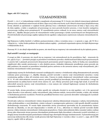 Sygn. akt XI C 2251/13 UZASADNIENIE Powód (...).à r.l. w Luksemburgu wniósł o zasądzenie od pozwanego W. S. kwoty 200 złotych stanowiącej należność główną wraz z odsetkami ustawowymi od dnia 2 lipca 2013 roku oraz kwoty 19,87 złotych stanowiącej skapitalizowaną kwotę odsetek za opóźnienie w zapłacie kwoty głównej wraz z odsetkami ustawowymi od dnia 2 lipca 2013 roku do dnia zapłaty, a także o zasądzenie od pozwanego na rzecz powoda kosztów procesu, w tym kosztów zastępstwa procesowego według norm przepisanych. W uzasadnieniu pozwu wskazał, że na mocy umowy cesji wierzytelności nabył od (...)Spółka Akcyjna prawa do wierzytelności wobec pozwanego z tytułu wystawionych not obciążeniowych. Powód dochodzi od pozwanego zapłaty żądanej kwoty zgodnie z załączonym częściowym wykazem wierzytelności (k. 19). Sąd Rejonowy Lublin-Zachód w Lublinie postanowieniem z dnia 2 września 2013 r. w sprawie o sygn. akt VI Nc-e 1784979/13 – wobec braku podstaw do wydania nakazu zapłaty – przekazał rozpoznanie sprawy do Sądu Rejonowego w Białymstoku (k.6). Pozwany W. S. nie złożył odpowiedzi na pozew, nie stawił się na rozprawę i nie ustosunkował się do żądania pozwu. Sąd ustalił i zważył, co następuje: Z uwagi na fakt, iż pozwany nie stawił się na rozprawę i nie ustosunkował się do powództwa, Sąd – stosownie do art. 339 § 2 k.p.c. – powinien przyjąć za prawdziwe twierdzenie powoda o okolicznościach faktycznych przytoczonych w pozwie lub w pismach procesowych doręczonych pozwanemu przed rozprawą, chyba że budzą one uzasadnione wątpliwości albo zostały przytoczone w celu obejścia prawa. Jednakże dokumenty przedłożone przez powoda nie dały podstawy do uznania za prawdziwe twierdzeń pozwu zarówno co do zawarcia umowy cesji wierzytelności, jak i istnienia wierzytelności wobec pozwanego. Legitymację czynną do dochodzenia roszczeń wynikających z umowy o świadczenie usług abonamentowych zawartej rzekomo przez pozwanego z (...)Spółka Akcyjna, powód wywodzi z umowy cesji wierzytelności zawartej z wyżej wymienioną spółką w dniu 28 września 2012 roku. Umowa ta miała obejmować wierzytelność wobec pozwanego W. S.. W celu udowodnienia zawarcia umowy powód przedłożył jej kserokopię, która była nieczytelna z uwagi na zamieszczenie na jednej karcie trzech stron umowy (k. 13v). Biorąc powyższe pod uwagę Sąd uznał, iż powód nie udowodnił zawarcia umowy cesji wierzytelności, a tym samym nie wykazał legitymacji czynnej do dochodzenia roszczenia wobec W. S.. W ocenie Sadu, strona powodowa w żaden sposób nie wykazała również (a na niej zgodnie z art. 6 kc spoczywał ciężar dowodu w tym zakresie), ażeby wierzytelność, jaką rzekomo nabyła, rzeczywiście istniała, a także, aby istniała w dochodzonej pozwem wysokości. Powód nie przedłożył bowiem wraz z pozwem dowodów wykazujących wysokość wymagalnej należności. Powód jako nabywca wierzytelności winien dysponować całością dokumentacji związanej z nabytą wierzytelnością i jako profesjonalista w swej dziedzinie, winien wykazać w postępowaniu sądowym w jaki sposób określił wysokość dochodzonego roszczenia. W ocenie Sądu stanowisko strony powodowej sprowadza się do przeniesienia ciężaru dowodu na dłużnika, co nie jest dopuszczalne w świetle art. 6 k.c., albowiem to właśnie powód wywodzi skutki prawne z faktu istnienia wierzytelności i dokonania jej przelewu. Ciężar udowodnienia faktu rozumieć należy z jednej strony jako obarczenie strony procesu obowiązkiem przekonania Sądu dowodami o słuszności swoich twierdzeń, a z drugiej strony konsekwencjami poniechania realizacji tego obowiązku lub jego nieskuteczności. Tą konsekwencją jest zazwyczaj niekorzystny dla strony wynik procesu (tak Sąd Najwyższy w wyroku z dnia 7.11.2007 r., sygn. akt II CSK 293/07, opubl. LEX nr 487510). Biorąc powyższe pod uwagę, na mocy powołanych przepisów, należało orzec jak w sentencji. Stosownie do art. 339 § 1 k.p.c. wyrok ma charakter zaoczny.