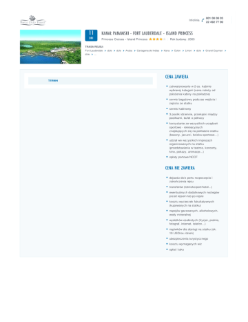 Infolinia 11 KANAŁ PANAMSKI - FORT LAUDERDALE - ISLAND PRINCESS DNI Princess Cruises - Island Princess 801 08 08 03 22 492 77 90 | Rok budowy: 2003 TRASA REJSU: Fort Lauderdale dzie TERMIN dzie dzie Aruba Cartagena de Indias Kana Colon Limon dzie Grand Cayman ... CENA ZAWIERA zakwaterowanie w 2-os. kabinie wybranej kategorii (cena zależy od położenia kabiny na pokładzie) serwis bagażowy podczas wejścia i zejścia ze statku serwis kabinowy 3 posiłki dziennie, przekąski między posiłkami, bufet o północy korzystanie ze wszystkich urządzeń sportowo - rekreacyjnych znajdujących się na pokładzie statku (baseny, jacuzzi, boiska sportowe…) udział we wszystkich imprezach organizowanych na statku (przedstawienia w teatrze, koncerty, kino, pokazy, animacje...) opłaty portowe NCCF CENA NIE ZAWIERA dojazdu do/z portu rozpoczęcia i zakończenia rejsu transferów (lotnisko/port/hotel...) ewentualnych dodatkowych noclegów przed rejsem lub po rejsie kosztu wycieczek fakultatywnych (kupowanych na statku) napojów gazowanych, alkoholowych, wody mineralnej wydatków osobistych (fryzjer, pralnia, fotograf, internet, telefon...) napiwków dla obsługi na statku (ok. 10 USD/os./dzień) ubezpieczenia turystycznego kosztu wymaganych wiz opłat i taks