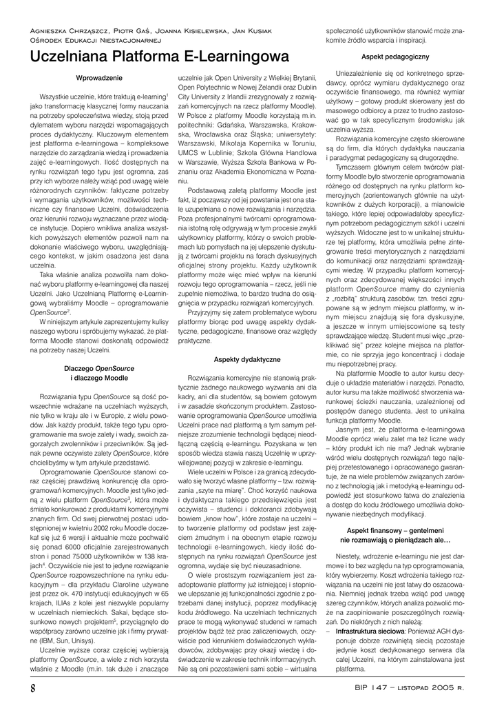 Agnieszka Chrząszcz, Piotr Gaś, Joanna Kisielewska, Jan Kusiak Ośrodek Edukacji Niestacjonarnej Uczelniana Platforma E-Learningowa Wprowadzenie Wszystkie uczelnie, które traktują e-learning1 jako transformację klasycznej formy nauczania na potrzeby społeczeństwa wiedzy, stoją przed dylematem wyboru narzędzi wspomagających proces dydaktyczny. Kluczowym elementem jest platforma e-learningowa – kompleksowe narzędzie do zarządzania wiedzą i prowadzenia zajęć e-learningowych. Ilość dostępnych na rynku rozwiązań tego typu jest ogromna, zaś przy ich wyborze należy wziąć pod uwagę wiele różnorodnych czynników: faktyczne potrzeby i wymagania użytkowników, możliwości techniczne czy finansowe Uczelni, doświadczenia oraz kierunki rozwoju wyznaczane przez wiodące instytucje. Dopiero wnikliwa analiza wszystkich powyższych elementów pozwoli nam na dokonanie właściwego wyboru, uwzględniającego kontekst, w jakim osadzona jest dana uczelnia. Taka właśnie analiza pozwoliła nam dokonać wyboru platformy e-learningowej dla naszej Uczelni. Jako Uczelnianą Platformę e-Learningową wybraliśmy Moodle – oprogramowanie OpenSource2. W niniejszym artykule zaprezentujemy kulisy naszego wyboru i spróbujemy wykazać, że platforma Moodle stanowi doskonałą odpowiedź na potrzeby naszej Uczelni. uczelnie jak Open University z Wielkiej Brytanii, Open Polytechnic w Nowej Zelandii oraz Dublin City University z Irlandii zrezygnowały z rozwiązań komercyjnych na rzecz platformy Moodle). W Polsce z platformy Moodle korzystają m.in. politechniki: Gdańska, Warszawska, Krakowska, Wrocławska oraz Śląska; uniwersytety: Warszawski, Mikołaja Kopernika w Toruniu, UMCS w Lublinie; Szkoła Główna Handlowa w Warszawie, Wyższa Szkoła Bankowa w Poznaniu oraz Akademia Ekonomiczna w Poznaniu. Podstawową zaletą platformy Moodle jest fakt, iż począwszy od jej powstania jest ona stale uzupełniana o nowe rozwiązania i narzędzia. Poza profesjonalnymi twórcami oprogramowania istotną rolę odgrywają w tym procesie zwykli użytkownicy platformy, którzy o swoich problemach lub pomysłach na jej ulepszenie dyskutują z twórcami projektu na forach dyskusyjnych oficjalnej strony projektu. Każdy użytkownik platformy może więc mieć wpływ na kierunki rozwoju tego oprogramowania – rzecz, jeśli nie zupełnie niemożliwa, to bardzo trudna do osiągnięcia w przypadku rozwiązań komercyjnych. Przyjrzyjmy się zatem problematyce wyboru platformy biorąc pod uwagę aspekty dydaktyczne, pedagogiczne, finansowe oraz względy praktyczne. Aspekty dydaktyczne Dlaczego OpenSource i dlaczego Moodle Rozwiązania typu OpenSource są dość powszechnie wdrażane na uczelniach wyższych, nie tylko w kraju ale i w Europie, z wielu powodów. Jak każdy produkt, także tego typu oprogramowanie ma swoje zalety i wady, swoich zagorzałych zwolenników i przeciwników. Są jednak pewne oczywiste zalety OpenSource, które chcielibyśmy w tym artykule przedstawić. Oprogramowanie OpenSource stanowi coraz częściej prawdziwą konkurencję dla oprogramowań komercyjnych. Moodle jest tylko jedną z wielu platform OpenSource3, która może śmiało konkurować z produktami komercyjnymi znanych firm. Od swej pierwotnej postaci udostępnionej w kwietniu 2002 roku Moodle doczekał się już 6 wersji i aktualnie może pochwalić się ponad 6000 oficjalnie zarejestrowanych stron i ponad 75 000 użytkowników w 138 krajach4. Oczywiście nie jest to jedyne rozwiązanie OpenSource rozpowszechnione na rynku edukacyjnym – dla przykładu Claroline używane jest przez ok. 470 instytucji edukacyjnych w 65 krajach, ILIAs z kolei jest niezwykle popularny w uczelniach niemieckich. Sakai, będące stosunkowo nowych projektem5, przyciągnęło do współpracy zarówno uczelnie jak i firmy prywatne (IBM, Sun, Unisys). Uczelnie wyższe coraz częściej wybierają platformy OpenSource, a wiele z nich korzysta właśnie z Moodle (m.in. tak duże i znaczące 8 Rozwiązania komercyjne nie stanowią praktycznie żadnego naukowego wyzwania ani dla kadry, ani dla studentów, są bowiem gotowym i w zasadzie skończonym produktem. Zastosowanie oprogramowania OpenSource umożliwia Uczelni prace nad platformą a tym samym pełniejsze zrozumienie technologii będącej nieodłączną częścią e-learningu. Pozyskana w ten sposób wiedza stawia naszą Uczelnię w uprzywilejowanej pozycji w zakresie e-learningu. Wiele uczelni w Polsce i za granicą zdecydowało się tworzyć własne platformy – tzw. rozwiązania „szyte na miarę”. Choć korzyść naukowa i dydaktyczna takiego przedsięwzięcia jest oczywista – studenci i doktoranci zdobywają bowiem „know how”, które zostaje na uczelni – to tworzenie platformy od podstaw jest zajęciem żmudnym i na obecnym etapie rozwoju technologii e-learningowych, kiedy ilość dostępnych na rynku rozwiązań OpenSource jest ogromna, wydaje się być nieuzasadnione. O wiele prostszym rozwiązaniem jest zaadoptowanie platformy już istniejącej i stopniowe ulepszanie jej funkcjonalności zgodnie z potrzebami danej instytucji, poprzez modyfikację kodu źródłowego. Na uczelniach technicznych prace te mogą wykonywać studenci w ramach projektów bądź też prac zaliczeniowych, oczywiście pod kierunkiem doświadczonych wykładowców, zdobywając przy okazji wiedzę i doświadczenie w zakresie technik informacyjnych. Nie są oni pozostawieni sami sobie – wirtualna społeczność użytkowników stanowić może znakomite źródło wsparcia i inspiracji. Aspekt pedagogiczny Uniezależnienie się od konkretnego sprzedawcy, oprócz wymiaru dydaktycznego oraz oczywiście finansowego, ma również wymiar użytkowy – gotowy produkt skierowany jest do masowego odbiorcy a przez to trudno zastosować go w tak specyficznym środowisku jak uczelnia wyższa. Rozwiązania komercyjne często skierowane są do firm, dla których dydaktyka nauczania i paradygmat pedagogiczny są drugorzędn