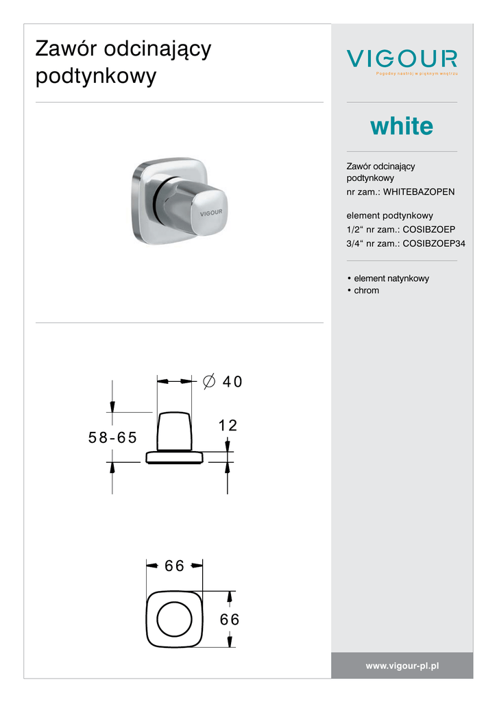 Zawór odcinający podtynkowy white Zawór odcinający podtynkowy nr zam.: WHITEBAZOPEN element podtynkowy 1/2“ nr zam.: COSIBZOEP 3/4“ nr zam.: COSIBZOEP34 •element natynkowy •chrom www.vigour-pl.pl