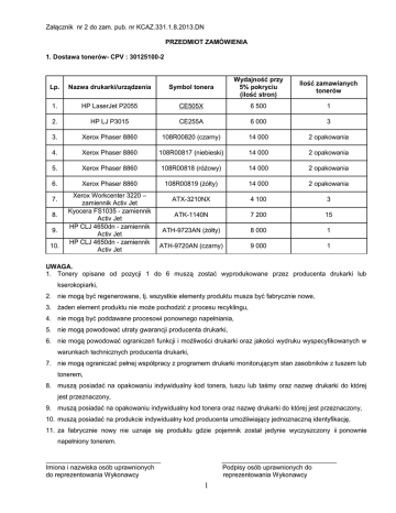 Załącznik nr 2 do zam. pub. nr KCAZ.331.1.8.2013.DN PRZEDMIOT ZAMÓWIENIA 1. Dostawa tonerów- CPV : 30125100-2 Lp. Nazwa drukarki/urządzenia Symbol tonera Wydajność przy 5% pokryciu (ilość stron) Ilość zamawianych tonerów 1. HP LaserJet P2055 CE505X 6 500 1 2. HP LJ P3015 CE255A 6 000 3 3. Xerox Phaser 8860 108R00820 (czarny) 14 000 2 opakowania 4. Xerox Phaser 8860 108R00817 (niebieski) 14 000 2 opakowania 5. Xerox Phaser 8860 108R00818 (różowy) 14 000 2 opakowania 6. Xerox Phaser 8860 108R00819 (żółty) 14 000 2 opakowania ATX-3210NX 4 100 3 ATK-1140N 7 200 15 ATH-9723AN (żółty) 8 000 1 ATH-9720AN (czarny) 9 000 1 7. 8. 9. 10. Xerox Workcenter 3220 – zamiennik Activ Jet Kyocera FS1035 - zamiennik Activ Jet HP CLJ 4650dn - zamiennik Activ Jet HP CLJ 4650dn - zamiennik Activ Jet UWAGA. 1. Tonery opisane od pozycji 1 do 6 muszą zostać wyprodukowane przez producenta drukarki lub kserokopiarki, 2. nie mogą być regenerowane, tj. wszystkie elementy produktu musza być fabrycznie nowe, 3. żaden element produktu nie może pochodzić z procesu recyklingu, 4. nie mogą być poddawane procesowi ponownego napełniania, 5. nie mogą powodować utraty gwarancji producenta drukarki, 6. nie mogą powodować ograniczeń funkcji i możliwości drukarki oraz jakości wydruku wyspecyfikowanych w warunkach technicznych producenta drukarki, 7. nie mogą ograniczać pełnej współpracy z programem drukarki monitorującym stan zasobników z tuszem lub tonerem, 8. muszą posiadać na opakowaniu indywidualny kod tonera, tuszu lub taśmy oraz nazwę drukarki do której jest przeznaczony, 9. muszą posiadać na opakowaniu indywidualny kod tonera oraz nazwę drukarki do której jest przeznaczony, 10. muszą posiadać na produkcie indywidualny kod producenta umożliwiający jednoznaczną identyfikację, 11. za fabrycznie nowy nie uznaje się produktu gdzie pojemnik został jedynie wyczyszczony ii ponownie napełniony tonerem. ________________________________ Imiona i nazwiska osób uprawnionych do reprezentowania Wykonawcy ________________________________ Podpisy osób uprawnionych do reprezentowania Wykonawcy 1