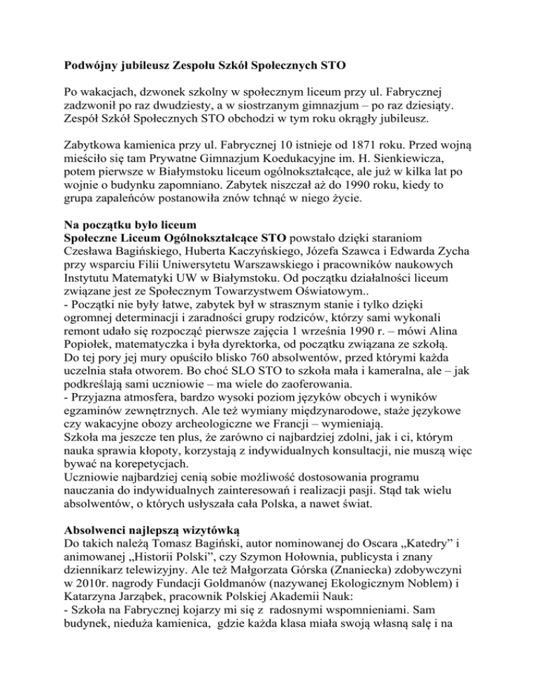 Podwójny jubileusz Zespołu Szkół Społecznych STO Po wakacjach, dzwonek szkolny w społecznym liceum przy ul. Fabrycznej zadzwonił po raz dwudziesty, a w siostrzanym gimnazjum – po raz dziesiąty. Zespół Szkół Społecznych STO obchodzi w tym roku okrągły jubileusz. Zabytkowa kamienica przy ul. Fabrycznej 10 istnieje od 1871 roku. Przed wojną mieściło się tam Prywatne Gimnazjum Koedukacyjne im. H. Sienkiewicza, potem pierwsze w Białymstoku liceum ogólnokształcące, ale już w kilka lat po wojnie o budynku zapomniano. Zabytek niszczał aż do 1990 roku, kiedy to grupa zapaleńców postanowiła znów tchnąć w niego życie. Na początku było liceum Społeczne Liceum Ogólnokształcące STO powstało dzięki staraniom Czesława Bagińskiego, Huberta Kaczyńskiego, Józefa Szawca i Edwarda Zycha przy wsparciu Filii Uniwersytetu Warszawskiego i pracowników naukowych Instytutu Matematyki UW w Białymstoku. Od początku działalności liceum związane jest ze Społecznym Towarzystwem Oświatowym.. - Początki nie były łatwe, zabytek był w strasznym stanie i tylko dzięki ogromnej determinacji i zaradności grupy rodziców, którzy sami wykonali remont udało się rozpocząć pierwsze zajęcia 1 września 1990 r. – mówi Alina Popiołek, matematyczka i była dyrektorka, od początku związana ze szkołą. Do tej pory jej mury opuściło blisko 760 absolwentów, przed którymi każda uczelnia stała otworem. Bo choć SLO STO to szkoła mała i kameralna, ale – jak podkreślają sami uczniowie – ma wiele do zaoferowania. - Przyjazna atmosfera, bardzo wysoki poziom języków obcych i wyników egzaminów zewnętrznych. Ale też wymiany międzynarodowe, staże językowe czy wakacyjne obozy archeologiczne we Francji – wymieniają. Szkoła ma jeszcze ten plus, że zarówno ci najbardziej zdolni, jak i ci, którym nauka sprawia kłopoty, korzystają z indywidualnych konsultacji, nie muszą więc bywać na korepetycjach. Uczniowie najbardziej cenią sobie możliwość dostosowania programu nauczania do indywidualnych zainteresowań i realizacji pasji. Stąd tak wielu absolwentów, o których usłyszała cała Polska, a nawet świat. Absolwenci najlepszą wizytówką Do takich należą Tomasz Bagiński, autor nominowanej do Oscara „Katedry” i animowanej „Historii Polski”, czy Szymon Hołownia, publicysta i znany dziennikarz telewizyjny. Ale też Małgorzata Górska (Znaniecka) zdobywczyni w 2010r. nagrody Fundacji Goldmanów (nazywanej Ekologicznym Noblem) i Katarzyna Jarząbek, pracownik Polskiej Akademii Nauk: - Szkoła na Fabrycznej kojarzy mi się z radosnymi wspomnieniami. Sam budynek, nieduża kamienica, gdzie każda klasa miała swoją własną salę i na przerwach można było zaparzyć herbatę był czymś zupełnie nowym od tego, czego doświadczyłam w przeludnionej i hałaśliwej szkole podstawowej. Kameralna atmosfera dawała poczucie wspólnoty, ale i sprzyjała kreowaniu indywidualności. Otwartość grona pedagogicznego na nasze często zupełnie zwariowane pomysły, a także dbałość o to, żebyśmy mogli rozwijać również swoje zainteresowania, dawały poczucie wyjątkowości. Mogę być tylko bardzo wdzięczna pedagogom i wychowawcom tej szkoły za solidne wykształcenie, za wrażliwość i życzliwość, a nauka do dziś została dla mnie czymś przyjemnym i odkrywczym. Młodszy brat - gimnazjum W 2000 r. na bazie istniejącego od 10 lat liceum, powstało Społeczne Gimnazjum nr 8 STO. Społeczność szkół chętnie wita pierwszoklasistów, organizuje się im doskonałą zabawę na otrzęsinach w czasie integracyjnego biwaku. Gimnazjaliści uczestniczą w wymianach międzynarodowych z Francją, Rumunią, Niemcami. Byli w Hiszpanii, Walii i Belgii. Wyjeżdżają na wycieczki, zwiedzając region i kraj, razem odwiedzają kina, teatry, muzea. Mogą liczyć na bogatą ofertę zajęć pozalekcyjnych i rozwijać swoje zainteresowania. Społeczne Gimnazjum STO to też prawdziwa kuźnia finalistów i laureatów konkursów przedmiotowych i olimpiad. Wyniki egzaminu gimnazjalnego rokrocznie należą do najwyższych w Białymstoku. Galeria za płotem Z okazji 15-lecia istnienia w czerwcu 2005 Społeczne Liceum Ogólnokształcące STO otworzyło „Galerię na płocie” inspirowaną książką „Metafizyka prowincji”, autorstwa Jana Kamińskiego, literata i jednego z pierwszych nauczycieli szkoły. Wtedy na płocie przed szkołą zaprezentowano fotografie Piotra Malczewskiego. Tradycja „Galerii na płocie” jest kontynuowana do dziś, a szanse na zaprezentowanie swoich zdjęć ma każdy, kto tylko zainteresuje nimi organizatorów. W 2006 r. formuła wystawy została poszerzona o „Galerię na II piętrze”. We wrześniu tego roku ruszyła VI jubileuszowa edycja galerii, a jej gwiazdą jest Nelly Kamińska, córka Jana Kamińskiego - podróżniczka, reporterka i fotoreporterka Gazety Wyborczej, zafascynowana innego rodzaju prowincją – Bliskiego i Dalekiego Wschodu. Obok jej zdjęć, w ramach tzw. „Galerii Młodych” przedstawione są interesujące prace absolwenta architektury PB – Krystiana Karpiuka, a także absolwentki SLO STO – Igi Drobisz oraz Białostoczanki - Małgorzaty Polakowskiej.