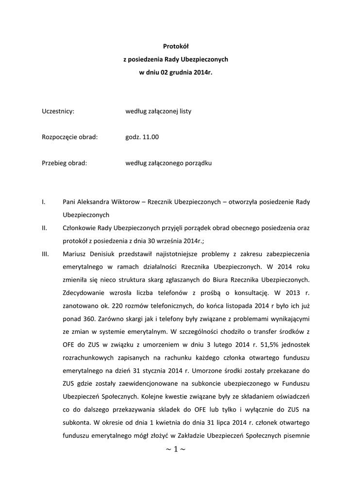 Protokół z posiedzenia Rady Ubezpieczonych w dniu 02 grudnia 2014r. Uczestnicy: według załączonej listy Rozpoczęcie obrad: godz. 11.00 Przebieg obrad: według załączonego porządku I. Pani Aleksandra Wiktorow – Rzecznik Ubezpieczonych – otworzyła posiedzenie Rady Ubezpieczonych II. Członkowie Rady Ubezpieczonych przyjęli porządek obrad obecnego posiedzenia oraz protokół z posiedzenia z dnia 30 września 2014r.; III. Mariusz Denisiuk przedstawił najistotniejsze problemy z zakresu zabezpieczenia emerytalnego w ramach działalności Rzecznika Ubezpieczonych. W 2014 roku zmieniła się nieco struktura skarg zgłaszanych do Biura Rzecznika Ubezpieczonych. Zdecydowanie wzrosła liczba telefonów z prośbą o konsultację. W 2013 r. zanotowano ok. 220 rozmów telefonicznych, do końca listopada 2014 r było ich już ponad 360. Zarówno skargi jak i telefony były związane z problemami wynikającymi ze zmian w systemie emerytalnym. W szczególności chodziło o transfer środków z OFE do ZUS w związku z umorzeniem w dniu 3 lutego 2014 r. 51,5% jednostek rozrachunkowych zapisanych na rachunku każdego członka otwartego funduszu emerytalnego na dzień 31 stycznia 2014 r. Umorzone środki zostały przekazane do ZUS gdzie zostały zaewidencjonowane na subkoncie ubezpieczonego w Funduszu Ubezpieczeń Społecznych. Kolejne kwestie związane były ze składaniem oświadczeń co do dalszego przekazywania skladek do OFE lub tylko i wyłącznie do ZUS na subkonta. W okresie od dnia 1 kwietnia do dnia 31 lipca 2014 r. członek otwartego funduszu emerytalnego mógł złożyć w Zakładzie Ubezpieczeń Społecznych pisemnie ~1~ lub w formie dokumentu elektronicznego - uwierzytelnionego z wykorzystaniem kwalifikowanego certyfikatu, profilu zaufanego ePUAP, lub innych technologii umożliwiających identyfikację, zgodne ze wzorem oświadczenie o przekazywaniu do otwartego funduszu emerytalnego składki emerytalnej. Pierwszą składką odprowadzaną zgodnie z oświadczeniem, była składka należna za lipiec 2014 r. W przypadku gdy ubezpieczony nie złożył powyższego oświadczenia, wówczas składka do otwartego funduszu emerytalnego w całości będzie ewidencjonowana na subkoncie w Zakładzie Ubezpieczeń Społecznych. Forma oświadczenia została określona Rozporządzeniem Rady Ministrów z dnia 27 stycznia 2014 r. w sprawie określenia wzoru oświadczenia członka otwartego funduszu emerytalnego o przekazywaniu składki do otwartego funduszu emerytalnego oraz o zapoznaniu się z informacją dotyczącą powszechnego systemu emerytalnego oraz informacją dotyczącą otwartych funduszy emerytalnych. Oświadczenie to zawiera informację o decyzji ubezpieczonego co do dalszego przekazywania składki do otwartego funduszu emerytalnego oraz o zapoznaniu się z przygotowaną przez ministra właściwego do spraw zabezpieczenia społecznego w porozumieniu z ministrem właściwym do spraw finansów publicznych informacją dotyczącą powszechnego systemu emerytalnego oraz informacją dotyczącą poszczególnych otwartych funduszy emerytalnych. Pojawiały się również skargi które nie były bezpośrednio związane ze zmianami systemu emerytalnego, aczkolwiek zmiany tych przepisów wpłynęły na ich pojawienie się. Problemy te związane są z dziedziczeniem środków w związku ze śmiercią członka OFE a także podziału środków w związku z rozwodem. Aktualnie są to dominujące skargi. Nowa grupa skarg to kwestie związane z otwieraniem subkont, przekazywaniem środków na subkonta i dalsze oszczędzanie w OFE lub ZUS. Cały czas istnieje bardzo duże niedoinformowanie osób ubezpieczonych co do istoty zmian, które weszły w tym roku w życie. Bardzo często są to skargi osób które złożyły oświadczenie o przekazywaniu składki do ZUS i są zaskoczone faktem, że wciąż pozostają członkami OFE. Jest to ok. 80% skarg w ramach rozmów telefonicznych w sprawach subkonta. Rozmówcy zawsze powtarzają że są zaskoczeni swoim członkowstwem w OFE, ponieważ było dla nich oczywiste że składane oświadczenia dotyczyły wszystkich składek które do tej pory były zgromadzone na rachunku w OFE. ~2~ Pojawił się również problem odrzucenia oświadczenia o przekazywaniu składki do OFE przez osoby, które mają mniej niż 10 lat do emerytury. Oświadczenia składane przez Ubezpieczonych mających do emerytury mniej niż dziesięć lat, były odrzucane ze względu na tzw. suwak emerytalny czyli stopniowe przekazywanie aktywów z OFE do ZUS zaczynające się dziesięć lat przed emeryturą. Tymczasem twierdzenie to było błędne, ponieważ z nowej ustawy emerytalnej wynika, iż ten tzw. suwak zaczął funkcjonować dopiero z końcem października br. Co oznacza że jeśli członek OFE, który ma do emerytury dziesięć lub mniej lat, złożył deklarację o chęci pozostania w OFE, to część jego składki emerytalnej (1/7) wciąż powinna być przekazywana do OFE do 31 października 2014 r. Natomiast nie złożenie takiej deklaracji skutkuje tym, że składki w całości powinny trafić do ZUS już od lipca 2014r. O zasadach związanych z tzw. suwakiem emerytalnym ubezpieczeni nie mają wiedzy. W skargach i rozmowach telefonicznych pojawia się ciągle kwestia możliwości wystąpienia z OFE. Klimat i logika zmian w systemie emerytalnym sprawiają, że ubezpieczeni coraz mniej wierzą w sens przekazywania środków do OFE i coraz chętniej chcieliby te środki z OFE wycofywać. Dosyć liczna grupa skarg dotyczyła funkcjonowania PPE. Na pojawienie się tych skarg ma wpływ sytuacja na rynku pracy i generalnie sytuacja gospodarcza. Pytania dotyczyły zawieszenia składek przekazywanych na program emerytalny, obniżenia składki przekazywanej do programu, zasadności tego zawieszenia lub zmniejszenia, ewentualnie tego w jakiej formie to mogło by być robione. Zniknęła dosyć liczna do tej pory grupa skarg związanych z akwizycją. Zaskakujący jest też brak skarg na transfer