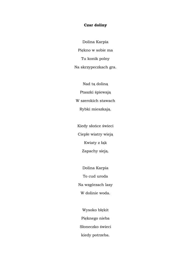 Czar doliny Dolina Karpia Piękno w sobie ma Tu konik polny Na skrzypeczkach gra. Nad tą doliną Ptaszki śpiewają W szerokich stawach Rybki mieszkają. Kiedy słońce świeci Ciepłe wiatry wieją Kwiaty z łąk Zapachy sieją. Dolina Karpia To cud uroda Na wzgórzach lasy W dolinie woda. Wysoko błękit Pięknego nieba Słoneczko świeci kiedy potrzeba. Warto przyjeżdżać Odpocząć sobie Dolina Karpia Da zdrowie Tobie Sebastian Mruczek Szkoła Podstawowa w Spytkowicach