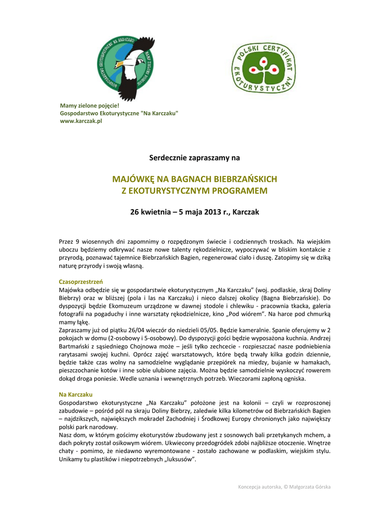 Mamy zielone pojęcie! Gospodarstwo Ekoturystyczne "Na Karczaku" www.karczak.pl Serdecznie zapraszamy na MAJÓWKĘ NA BAGNACH BIEBRZAŃSKICH Z EKOTURYSTYCZNYM PROGRAMEM 26 kwietnia – 5 maja 2013 r., Karczak Przez 9 wiosennych dni zapomnimy o rozpędzonym świecie i codziennych troskach. Na wiejskim uboczu będziemy odkrywać nasze nowe talenty rękodzielnicze, wypoczywać w bliskim kontakcie z przyrodą, poznawać tajemnice Biebrzańskich Bagien, regenerować ciało i duszę. Zatopimy się w dziką naturę przyrody i swoją własną. Czasoprzestrzeń Majówka odbędzie się w gospodarstwie ekoturystycznym „Na Karczaku” (woj. podlaskie, skraj Doliny Biebrzy) oraz w bliższej (pola i las na Karczaku) i nieco dalszej okolicy (Bagna Biebrzańskie). Do dyspozycji będzie Ekomuzeum urządzone w dawnej stodole i chlewiku - pracownia tkacka, galeria fotografii na pogaduchy i inne warsztaty rękodzielnicze, kino „Pod wiórem”. Na harce pod chmurką mamy łąkę. Zapraszamy już od piątku 26/04 wieczór do niedzieli 05/05. Będzie kameralnie. Spanie oferujemy w 2 pokojach w domu (2-osobowy i 5-osobowy). Do dyspozycji gości będzie wyposażona kuchnia. Andrzej Bartmański z sąsiedniego Chojnowa może – jeśli tylko zechcecie - rozpieszczać nasze podniebienia rarytasami swojej kuchni. Oprócz zajęć warsztatowych, które będą trwały kilka godzin dziennie, będzie także czas wolny na samodzielne wyglądanie przepiórek na miedzy, bujanie w hamakach, pieszczochanie kotów i inne sobie ulubione zajęcia. Można będzie samodzielnie wyskoczyć rowerem dokąd droga poniesie. Wedle uznania i wewnętrznych potrzeb. Wieczorami zapłoną ogniska. Na Karczaku Gospodarstwo ekoturystyczne „Na Karczaku” położone jest na kolonii – czyli w rozproszonej zabudowie – pośród pól na skraju Doliny Biebrzy, zaledwie kilka kilometrów od Biebrzańskich Bagien – najdzikszych, największych mokradeł Zachodniej i Środkowej Europy chronionych jako największy polski park narodowy. Nasz dom, w którym gościmy ekoturystów zbudowany jest z sosnowych bali przetykanych mchem, a dach pokryty został osikowym wiórem. Ukwiecony przedogródek zdobi najbliższe otoczenie. Wnętrze chaty - pomimo, że niedawno wyremontowane - zostało zachowane w podlaskim, wiejskim stylu. Unikamy tu plastików i niepotrzebnych „luksusów”. Koncepcja autorska, © Małgorzata Górska Mamy zielone pojęcie! Gospodarstwo Ekoturystyczne "Na Karczaku" www.karczak.pl Dwie przytulne sypialnie dla gości zostały przygotowane na poddaszu chaty. Jedna ugości 2 osoby (2 pojedyncze łóżka), druga – 5 osób (1 podwójne łóżko i 3 pojedyncze). Łazienka i kuchnia są wspólnie dzielone przez domowników i gości. Można też nocować we wspólnej przestrzeni Ekomuzem na własnych materacach/karimatach lub w namiotach. Do nieodpłatnej dyspozycji naszych gości są: hamaki, wyposażona kuchnia, bogata biblioteczka przewodników i atlasów, internet (tylko dla nałogowców w ograniczonych ilościach), łąka na harce pod chmurką. Jest możliwość wypożyczenia rowerów. Zapraszamy na ekoturystyczny szlak! Jesteśmy świadomi tego, że żadna forma turystyki nie jest obojętna dla środowiska. Dlatego staramy się wraz z naszymi gośćmi poprzez nasze ekologiczne, świadome zachowania w gospodarstwie agroturystycznym „Na Karczaku”, a także na biebrzańskich szlakach, eliminować a przynajmniej zmniejszać takie oddziaływania niekorzystne i wzmacniać te pozytywne. Od maja 2012 r. posiadamy oficjalny Polski Certyfikat Ekoturystyczny. Jego przyznanie potwierdza, że spełniamy szczegółowe wymagania dotyczące ochrony środowiska naturalnego, przyrody, dziedzictwa kulturowego. Podczas majówki będziemy się kierować ekologicznymi zasadami: http://karczak.pl/ekoturystyka/ekoturystyczne-zalecenia/ Program na minimum 4 dni: 1. Wprowadzenie do ekoturystyki 2. Warsztaty tkackie (swoje dzieła - szmaciane pasiaste chodniczki - będzie można zabrać do domu) lub zajęcia wspinaczki linowej 3. Całodzienna wycieczka samochodowa wokół Dolnego Basenu Biebrzy (naszym samochodem) lub spływ kajakowy Biebrzą 4. Pokaz tańca z ogniem 5. Wyprawa na oglądanie łosi 6. Pokazy filmów przyrodniczych w „Kinie pod wiórem” i wystawa fotografii oraz 5 maja – Biebrzańskie Targi Twórczości i Sztuki Ludowej „Sto pomysłów dla Biebrzy” w OsowcuTwierdzy i zwiedzanie Twierdzy Osowiec. Dodatkowo polecamy: 7. Poranna wycieczka na obserwacje ptaków na Bagnach Biebrzańskich 8. Spływ kajakowy Biebrzą 9. Spływ katamaranem Narwią 10. Wyprawy przyrodnicze, np. na bobry. 11. Zwiedzanie Tykocina i Podlaskiej Wsi Bocianiej Koncepcja autorska, © Małgorzata Górska Mamy zielone pojęcie! Gospodarstwo Ekoturystyczne "Na Karczaku" www.karczak.pl Możliwość zamówienia pysznych obiadów/ obiadokolacji w pobliskim Chojnowie. Więcej informacji: Gospodarstwo Ekoturystyczne „Na Karczaku” - www.karczak.pl, [email protected], tel. 605 070 001 Zainteresowane osoby prosimy o kontakt – wtedy podamy cenę i sposób rezerwacji. Koncepcja autorska, © Małgorzata Górska