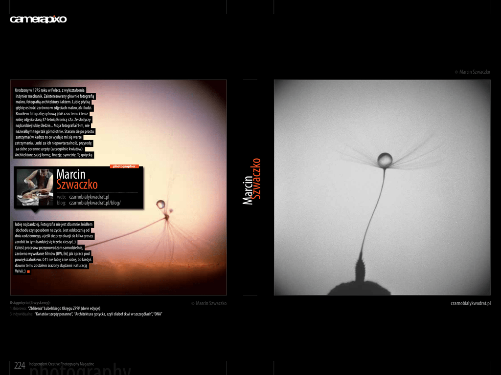 © Marcin Szwaczko Marcin Szwaczko Marcin Szwaczko Urodzony w 1975 roku w Polsce, z wykształcenia inżynier mechanik. Zainteresowany głownie fotografią makro, fotografią architektury i aktem. Lubię płytką głębię ostrości zarówno w zdjęciach makro jak i ludzi. Rzuciłem fotografię cyfrową jakiś czas temu i teraz robię zdjęcia starą 37-letnią Bronicą s2a. Ze słodyczy najbardziej lubię śledzie... Moja fotografia? Hm, nie nazwałbym tego tak górnolotnie. Staram sie po prostu zatrzymać w kadrze to co wydaje mi się warte zatrzymania. Ludzi za ich niepowtarzalność, przyrodę za ciche poranne szepty (szczególnie kwiatów). Architekturę za jej formę, finezję, symetrię. Tę gotycką photographer web: czarnobialykwadrat.pl blog: czarnobialykwadrat.pl/blog/ lubię najbardziej. Fotografia nie jest dla mnie źródłem dochodu czy sposobem na życie. Jest odskocznią od dnia codziennego, a jeśli się przy okazji da kilka groszy zarobić to tym bardziej się trzeba cieszyć ;) Całość procesów przeprowadzam samodzielnie, zarówno wywołanie filmów (BW, E6) jak i praca pod powiększalnikiem. C41 nie lubię i nie robię, bo kiedyś dawno temu zostałem zrażony slajdami i saturacją Velvii ;) Osiągnięcia (4 wystawy): 1 zbiorowa: “Zbliżenia” Lubelskiego Okręgu ZPFP (dwie edycje) 3 indywidualne: “Kwiatów szepty poranne”, “Architektura gotycka, czyli diabeł tkwi w szczegółach”, “ONA” 224 Independent Creative Photography Magazine © Marcin Szwaczko czarnobialykwadrat.pl Marcin Szwaczko Marcin Szwaczko © czarnobialykwadrat.pl © Marcin Szwaczko We are on Facebook.com/photopixo Inspiration. Business. Marketing. Knowladge 225 Marcin Szwaczko Marcin Szwaczko © © 226 Independent Creative Photography Magazine Marcin Szwaczko czarnobialykwadrat.pl Marcin Szwaczko Marcin Szwaczko © czarnobialykwadrat.pl © Marcin Szwaczko We are on Facebook.com/photopixo Inspiration. Business. Marketing. Knowladge 227 Marcin Szwaczko Marcin Szwaczko © © 228 Independent Creative Photography Magazine Marcin Szwaczko czarnobialykwadrat.pl Marcin Szwaczko Marcin Szwaczko © czarnobialykwadrat.pl © Marcin Szwaczko We are on Facebook.com/photopixo Inspiration. Business. Marketing. Knowladge 229 Marcin Szwaczko Marcin Szwaczko © © 230 Independent Creative Photography Magazine Marcin Szwaczko czarnobialykwadrat.pl Marcin Szwaczko Marcin Szwaczko © czarnobialykwadrat.pl © Marcin Szwaczko We are on Facebook.com/photopixo Inspiration. Business. Marketing. Knowladge 231 Marcin Szwaczko Marcin Szwaczko © © 232 Independent Creative Photography Magazine Marcin Szwaczko czarnobialykwadrat.pl Marcin Szwaczko Marcin Szwaczko © czarnobialykwadrat.pl © Marcin Szwaczko We are on Facebook.com/photopixo Inspiration. Business. Marketing. Knowladge 233