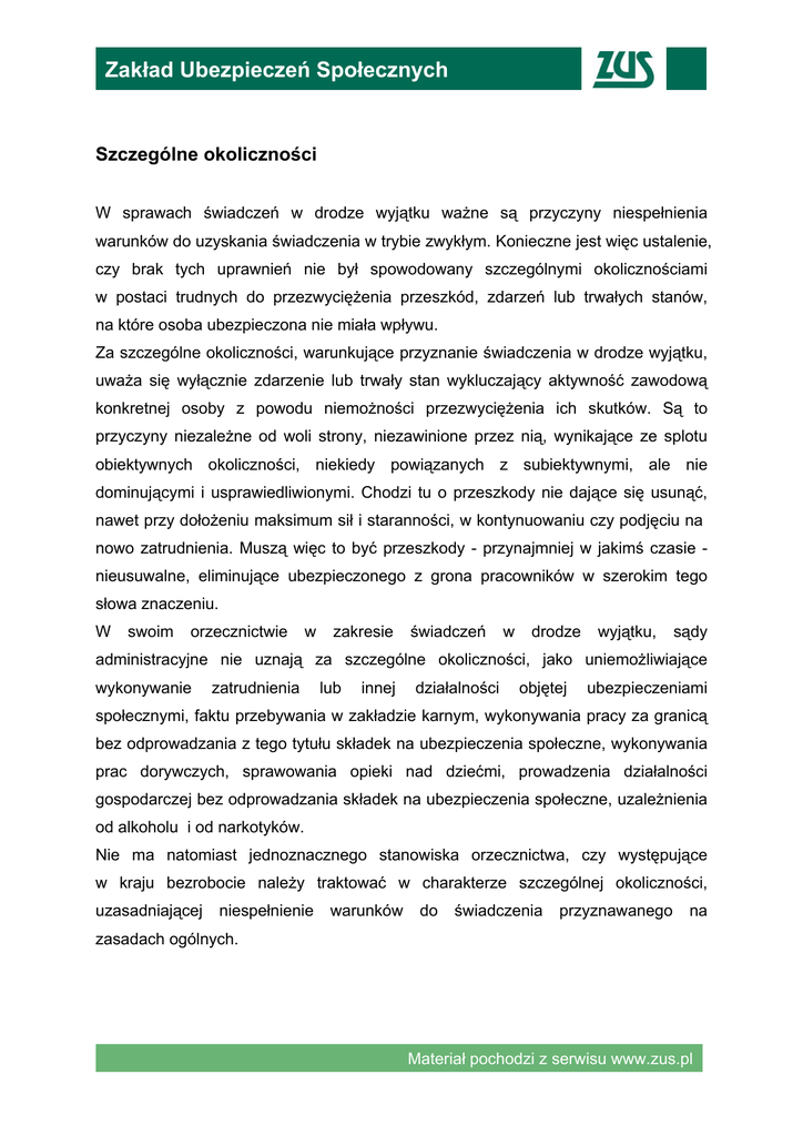 Zakład Ubezpieczeń Społecznych Szczególne okoliczności W sprawach świadczeń w drodze wyjątku ważne są przyczyny niespełnienia warunków do uzyskania świadczenia w trybie zwykłym. Konieczne jest więc ustalenie, czy brak tych uprawnień nie był spowodowany szczególnymi okolicznościami w postaci trudnych do przezwyciężenia przeszkód, zdarzeń lub trwałych stanów, na które osoba ubezpieczona nie miała wpływu. Za szczególne okoliczności, warunkujące przyznanie świadczenia w drodze wyjątku, uważa się wyłącznie zdarzenie lub trwały stan wykluczający aktywność zawodową konkretnej osoby z powodu niemożności przezwyciężenia ich skutków. Są to przyczyny niezależne od woli strony, niezawinione przez nią, wynikające ze splotu obiektywnych okoliczności, niekiedy powiązanych z subiektywnymi, ale nie dominującymi i usprawiedliwionymi. Chodzi tu o przeszkody nie dające się usunąć, nawet przy dołożeniu maksimum sił i staranności, w kontynuowaniu czy podjęciu na nowo zatrudnienia. Muszą więc to być przeszkody - przynajmniej w jakimś czasie nieusuwalne, eliminujące ubezpieczonego z grona pracowników w szerokim tego słowa znaczeniu. W swoim orzecznictwie w zakresie świadczeń w drodze wyjątku, sądy administracyjne nie uznają za szczególne okoliczności, jako uniemożliwiające wykonywanie zatrudnienia lub innej działalności objętej ubezpieczeniami społecznymi, faktu przebywania w zakładzie karnym, wykonywania pracy za granicą bez odprowadzania z tego tytułu składek na ubezpieczenia społeczne, wykonywania prac dorywczych, sprawowania opieki nad dziećmi, prowadzenia działalności gospodarczej bez odprowadzania składek na ubezpieczenia społeczne, uzależnienia od alkoholu i od narkotyków. Nie ma natomiast jednoznacznego stanowiska orzecznictwa, czy występujące w kraju bezrobocie należy traktować w charakterze szczególnej okoliczności, uzasadniającej niespełnienie warunków do świadczenia przyznawanego na zasadach ogólnych. www.zus.pl Materiał pochodzi z serwisu www.zus.pl Zakład Ubezpieczeń Społecznych Bezrobocie jest uznawane za okoliczność, która uniemożliwiała podejmowanie zatrudnienia głównie w przypadkach, gdy ubezpieczony jest lub był osobą starszą i miał problemy zdrowotne oraz wówczas, gdy aktywnie poszukiwał pracy. Nie traktuje się natomiast w orzecznictwie występującego w kraju bezrobocia jako szczególnej okoliczności w sytuacji, gdy ubezpieczony jest lub był osobą młodą i zdolną do pracy oraz jeżeli nie wykazywał żadnej aktywności w poszukiwaniu zatrudnienia. www.zus.pl Materiał pochodzi z serwisu www.zus.pl