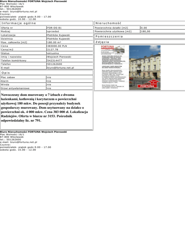 Biuro Nieruchomości FORTUNA Wojciech Pierowski Plac Wolności 16/1 87-800 Włocławek tel.: 501262600 e-mail: [email protected] Czynne: poniedziałek- piątek godz.9.00 - 17.00 sobota godz. 10.00 - 12.00 Informacje ogólne Nieruchomość Oferta nr FOR-DS-81 Powierzchnia działki [m2] 0.00 Rodzaj sprzedaż Powierzchnia użytkowa [m2] 180,00 Lokalizacja Piotrków Kujawski Dzielnica Piotrków Kujawski Pow. całkowita [m2] 180.00 m² Cena 383000.00 PLN Cena/m2 2127.78 Status aktualna Imię i nazwisko Wojciech Pierowski Telefon komórkowy 542314477 Telefon 501262600 E-mail [email protected] Opis Plac zabaw nie Alarm nie Winda nie Drzwi antywłamaniowe nie Nowoczesny dom murowany o 7 izbach z dwoma łazienkami, kotłownią i korytarzem o powierzchni użytkowej 180 mkw. Do posesji przynależy budynek gospodarczy murowany. Dom usytuowany na działce o powierzchni ok. 4 000 mkw. Cena 383 000 zł. Lokalizacja Radziejów. Oferta w biurze nr 3153. Pośrednik odpowiedzialny lic. nr 791. Biuro Nieruchomości FORTUNA Wojciech Pierowski Plac Wolności 16/1 87-800 Włocławek tel.: 501262600 e-mail: [email protected] Czynne: poniedziałek- piątek godz.9.00 - 17.00 sobota godz. 10.00 - 12.00 Pomieszczenia Zdjęcia