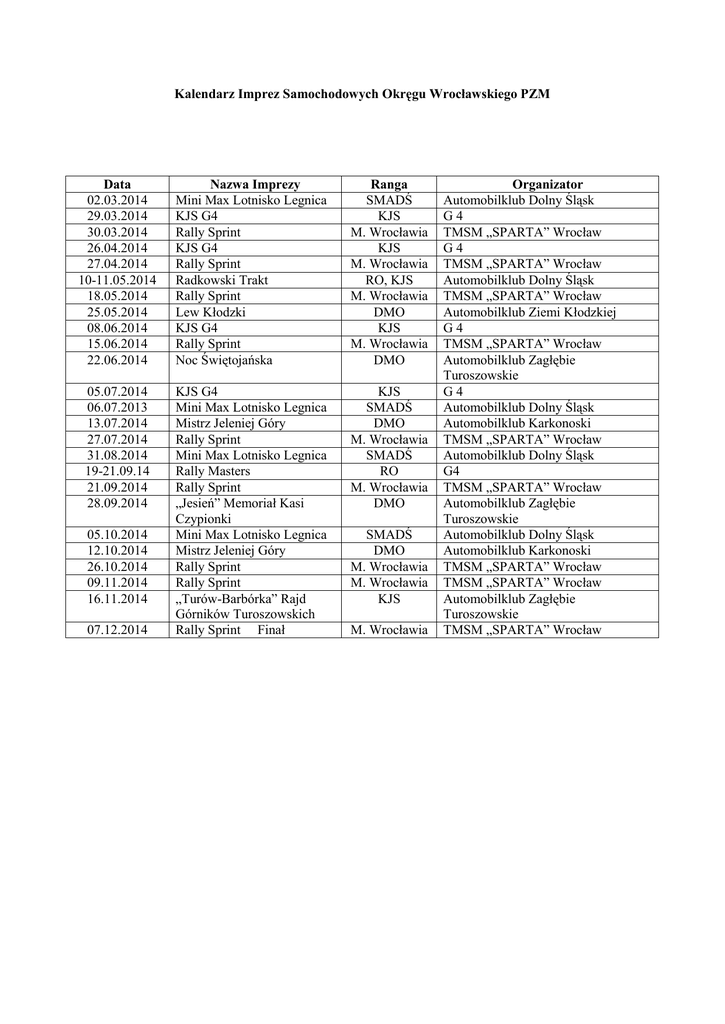 Kalendarz Imprez Samochodowych Okręgu Wrocławskiego PZM Data 02.03.2014 29.03.2014 30.03.2014 26.04.2014 27.04.2014 10-11.05.2014 18.05.2014 25.05.2014 08.06.2014 15.06.2014 22.06.2014 Nazwa Imprezy Mini Max Lotnisko Legnica KJS G4 Rally Sprint KJS G4 Rally Sprint Radkowski Trakt Rally Sprint Lew Kłodzki KJS G4 Rally Sprint Noc Świętojańska Ranga SMADŚ KJS M. Wrocławia KJS M. Wrocławia RO, KJS M. Wrocławia DMO KJS M. Wrocławia DMO 05.07.2014 06.07.2013 13.07.2014 27.07.2014 31.08.2014 19-21.09.14 21.09.2014 28.09.2014 KJS G4 Mini Max Lotnisko Legnica Mistrz Jeleniej Góry Rally Sprint Mini Max Lotnisko Legnica Rally Masters Rally Sprint „Jesień” Memoriał Kasi Czypionki Mini Max Lotnisko Legnica Mistrz Jeleniej Góry Rally Sprint Rally Sprint „Turów-Barbórka” Rajd Górników Turoszowskich Rally Sprint Finał KJS SMADŚ DMO M. Wrocławia SMADŚ RO M. Wrocławia DMO 05.10.2014 12.10.2014 26.10.2014 09.11.2014 16.11.2014 07.12.2014 SMADŚ DMO M. Wrocławia M. Wrocławia KJS M. Wrocławia Organizator Automobilklub Dolny Śląsk G4 TMSM „SPARTA” Wrocław G4 TMSM „SPARTA” Wrocław Automobilklub Dolny Śląsk TMSM „SPARTA” Wrocław Automobilklub Ziemi Kłodzkiej G4 TMSM „SPARTA” Wrocław Automobilklub Zagłębie Turoszowskie G4 Automobilklub Dolny Śląsk Automobilklub Karkonoski TMSM „SPARTA” Wrocław Automobilklub Dolny Śląsk G4 TMSM „SPARTA” Wrocław Automobilklub Zagłębie Turoszowskie Automobilklub Dolny Śląsk Automobilklub Karkonoski TMSM „SPARTA” Wrocław TMSM „SPARTA” Wrocław Automobilklub Zagłębie Turoszowskie TMSM „SPARTA” Wrocław