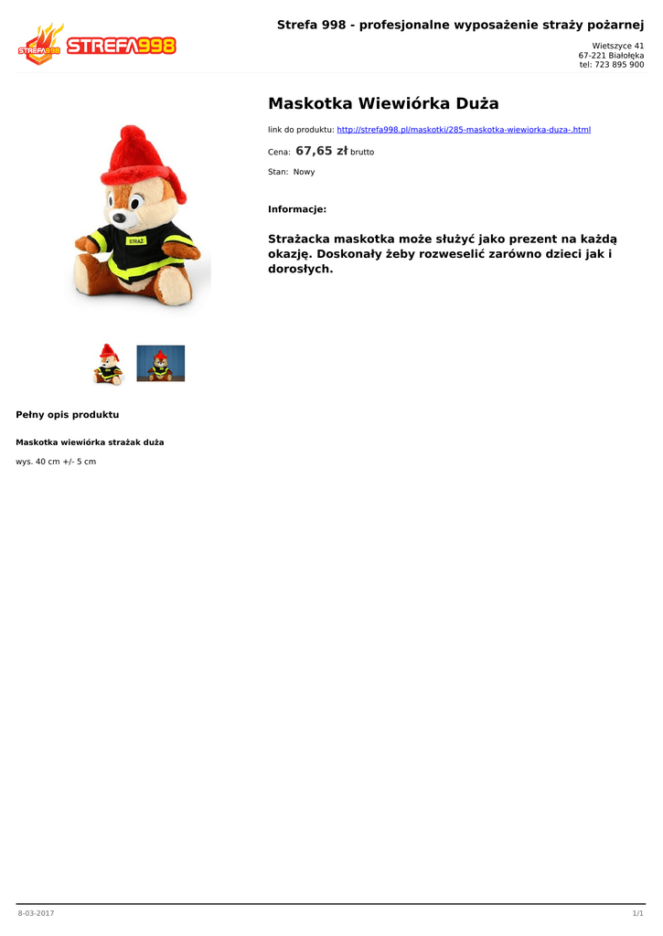 Strefa 998 - profesjonalne wyposażenie straży pożarnej Wietszyce 41 67-221 Białołęka tel: 723 895 900 Maskotka Wiewiórka Duża link do produktu: http://strefa998.pl/maskotki/285-maskotka-wiewiorka-duza-.html Cena: 67,65 zł brutto Stan: Nowy Informacje: Strażacka maskotka może służyć jako prezent na każdą okazję. Doskonały żeby rozweselić zarówno dzieci jak i dorosłych. Pełny opis produktu Maskotka wiewiórka strażak duża wys. 40 cm +/- 5 cm 8-03-2017 1/1