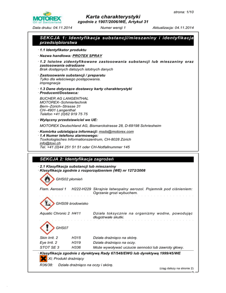 strona: 1/10 Karta charakterystyki zgodnie z 1907/2006/WE, Artykuł 31 Data druku: 04.11.2014 Numer wersji 1 Aktualizacja: 04.11.2014 SEKCJA 1: Identyfikacja substancji/mieszaniny i identyfikacja przedsiębiorstwa · 1.1 Identyfikator produktu · Nazwa handlowa: PROTEX SPRAY · 1.2 Istotne zidentyfikowane zastosowania substancji lub mieszaniny oraz zastosowania odradzane Brak dostępnych dalszych istotnych danych · Zastosowanie substancji / preparatu Tylko dla właściwego postępowania. impregnacja · 1.3 Dane dotyczące dostawcy karty charakterystyki · Producent/Dostawca: BUCHER AG LANGENTHAL MOTOREX–Schmiertechnik Bern–Zürich–Strasse 31 CH–4901 Langenthal Telefon +41 (0)62 919 75 75 · Wyłączny przedstawiciel we UE: MOTOREX Deutschland AG, Bismarckstrasse 28, D-69198 Schriesheim · Komórka udzielająca informacji: [email protected] · 1.4 Numer telefonu alarmowego: Toxikologisches Informationszentrum, CH-8028 Zürich [email protected] Tel. +41 (0)44 251 51 51 oder CH-Notfallnummer 145 SEKCJA 2: Identyfikacja zagrożeń · 2.1 Klasyfikacja substancji lub mieszaniny · Klasyfikacja zgodnie z rozporządzeniem (WE) nr 1272/2008 GHS02 płomień Flam. Aerosol 1 H222-H229 Skrajnie łatwopalny aerozol. Pojemnik pod ciśnieniem: Ogrzanie grozi wybuchem. GHS09 środowisko Aquatic Chronic 2 H411 Działa toksycznie na organizmy wodne, powodując długotrwałe skutki. GHS07 Skin Irrit. 2 Eye Irrit. 2 STOT SE 3 H315 H319 H336 Działa drażniąco na skórę. Działa drażniąco na oczy. Może wywoływać uczucie senności lub zawroty głowy. · Klasyfikacja zgodnie z dyrektywą Rady 67/548/EWG lub dyrektywą 1999/45/WE Xi; Produkt drażniący R36/38: Działa drażniąco na oczy i skórę. (ciąg dalszy na stronie 2) PL 39.0 strona: 2/10 Karta charakterystyki zgodnie z 1907/2006/WE, Artykuł 31 Data druku: 04.11.2014 Numer wersji 1 Aktualizacja: 04.11.2014 Nazwa handlowa: PROTEX SPRAY (ciąg dalszy od strony 1) F+; Produkt skrajnie łatwopalny Produkt skrajnie łatwopalny. R12: N; Produkt niebezpieczny dla środowiska R51/53: Działa toksycznie na organizmy wodne; może powodować długo utrzymujące się niekorzystne zmiany w środowisku wodnym. R67: Pary mogą wywoływać uczucie senności i zawroty głowy. · Szczególne wskazówki o zagrożeniu dla człowieka i środowiska: Produkt podlega obowiązkowi oznakowania na podstawie metody obliczania "Ogólnej wytycznej klasyfikowania preparatów w UE" w jej ostatnio ważnej wersji. Uwaga! Pojemnik pod ciśnieniem. · System klasyfikacji: Klasyfikacja odpowiada aktualnym listom Wspólnoty Europejskiej, jednak jest uzupełniona danymi z literatury fachowej i danymi firmowymi. · 2.2 Elementy oznakowania · Oznakowanie zgodnie z rozporządzeniem (WE) nr 1272/2008 Produkt jest klasyfikowany i oznakowany zgodnie z przepisami CLP. · Piktogramy wskazujące rodzaj zagrożenia GHS02 GHS07 GHS09 · Hasło ostrzegawcze Niebezpieczeństwo · Składniki określające niebezpieczeństwo do etykietowania: Węglowodory C6, C7, n-alkany, izoalkany, cykloalkeny, <5% n-heksanu · Zwroty wskazujące rodzaj zagrożenia H222-H229 Skrajnie łatwopalny aerozol. Pojemnik pod ciśnieniem: Ogrzanie grozi wybuchem. H315 Działa drażniąco na skórę. H319 Działa drażniąco na oczy. H336 Może wywoływać uczucie senności lub zawroty głowy. H411 Działa toksycznie na organizmy wodne, powodując długotrwałe skutki. · Zwroty wskazujące środki ostrożności P101 W razie konieczności zasięgnięcia porady lekarza należy pokazać pojemnik lub etykietę. P102 Chronić przed dziećmi. P103 Przed użyciem przeczytać etykietę. P210 Przechowywać z dala od źródeł ciepła/iskrzenia/otwartego ognia/ gorących powierzchni. Palenie wzbronione. P251 Pojemnik pod ciśnieniem. Nie przekłuwać ani nie spalać, nawet po zużyciu. P305+P351+P338 W PRZYPADKU DOSTANIA SIĘ DO OCZU: Ostrożnie płukać wodą przez kilka minut. Wyjąć soczewki kontaktowe, jeżeli są i można je łatwo usunąć. Nadal płukać. P405 Przechowywać pod zamknięciem. P410+P412 Chronić przed światłem słonecznym. Nie wystawiać na działanie temperatury przekraczającej 50 °C/122 °F. P501 Zawartość / pojemnik usuwać zgodnie z przepisami miejscowymi / regionalnymi / narodowymi / międzynarodowymi. (ciąg dalszy na stronie 3) PL 39.0 strona: 3/10 Karta charakterystyki zgodnie z 1907/2006/WE, Artykuł 31 Data druku: 04.11.2014 Numer wersji 1 Aktualizacja: 04.11.2014 Nazwa handlowa: PROTEX SPRAY (ciąg dalszy od strony 2) · Dane dodatkowe: Pojemnik pod ciśnieniem. Chronić przed słońcem i temperaturą powyżej 50 °C. Nie przekłuwać i nie palić - nawet po zużyciu. Nie rozpylać w kierunku płomienia lub rozgrzanych materiałów. Trzymać z dala od źródeł zapłonu - Palenie wzbronione. · 2.3 Inne zagrożenia · Wyniki oceny właściwości PBT i vPvB · PBT: Nie występuje · vPvB: Nie występuje SEKCJA 3: Skład/informacja o składnikach · 3.2 Charakterystyka chemiczna: Mieszaniny · Opis: Mieszanka z niżej wymienionych składników z bezpiecznymi domieszkami. · Składniki niebezpieczne: CAS: 64742-49-0 Węglowodory C6, C7, n-alkany, izoalkany, cykloalkeny, 25-50% Numer WE: 921-024-6 <5% n-heksanu Xn R65; Xi R38; F R11; N R51/53 R67 Flam. Liq. 2, H225; Asp. Tox. 1, H304; Aquatic Chronic 2, H411; Skin Irrit. 2, H315; STOT SE 3, H336 CAS: 106-97-8 butan 25-50% EINECS: 203-448-7 F+ R12 Flam. Gas 1, H220; Press. Gas, H280 CAS: 67-63-0 propan-2-ol 10-25% EINECS: 200-661-7 Xi R36; F R11 R67 Flam. Liq. 2, H225; Eye Irrit. 2, H319; STOT SE 3, H336 CAS: 74-98-6 propan 5-10% EINECS: 200-827-9 F+ R12 Flam. Gas 1, H220; Press. Gas, H280 CAS: 108-21-4 octan izopropylu 2,5-7,5% Xi R36; F R11 EINECS: 203-561-1 R66-67 Flam. Liq. 2, H225; Eye Irrit. 2, H319; STOT SE 3, H336 CAS: 78-78-4 i 2-metylobutan 0,25-1% Xn R65; F+ R12; N R51/53 EINECS: 201-142-8 R66-67 Flam. Liq. 1, H224; Asp. Tox. 1, H304; Aquatic Chronic 2, H411; STOT SE 3, H336 · Wskazówki dodatkowe: Pełna treść przytoczonyc