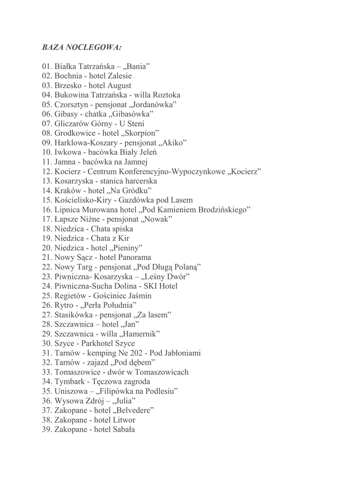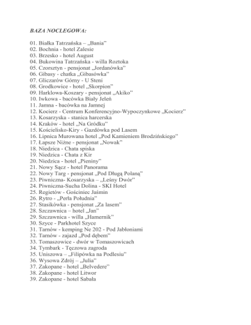 BAZA NOCLEGOWA: 01. Białka Tatrzańska – „Bania” 02. Bochnia - hotel Zalesie 03. Brzesko - hotel August 04. Bukowina Tatrzańska - willa Roztoka 05. Czorsztyn - pensjonat „Jordanówka” 06. Gibasy - chatka „Gibasówka” 07. Gliczarów Górny - U Steni 08. Grodkowice - hotel „Skorpion” 09. Harklowa-Koszary - pensjonat „Akiko” 10. Iwkowa - bacówka Biały Jeleń 11. Jamna - bacówka na Jamnej 12. Kocierz - Centrum Konferencyjno-Wypoczynkowe „Kocierz” 13. Kosarzyska - stanica harcerska 14. Kraków - hotel „Na Gródku” 15. Kościelisko-Kiry - Gazdówka pod Lasem 16. Lipnica Murowana hotel „Pod Kamieniem Brodzińskiego” 17. Łapsze NiŜne - pensjonat „Nowak” 18. Niedzica - Chata spiska 19. Niedzica - Chata z Kir 20. Niedzica - hotel „Pieniny” 21. Nowy Sącz - hotel Panorama 22. Nowy Targ - pensjonat „Pod Długą Polaną” 23. Piwniczna- Kosarzyska – „Leśny Dwór” 24. Piwniczna-Sucha Dolina - SKI Hotel 25. Regietów - Gościniec Jaśmin 26. Rytro - „Perła Południa” 27. Stasikówka - pensjonat „Za lasem” 28. Szczawnica – hotel „Jan” 29. Szczawnica - willa „Hamernik” 30. Szyce - Parkhotel Szyce 31. Tarnów - kemping Ne 202 - Pod Jabłoniami 32. Tarnów - zajazd „Pod dębem” 33. Tomaszowice - dwór w Tomaszowicach 34. Tymbark - Tęczowa zagroda 35. Uniszowa – „Filipówka na Podlesiu” 36. Wysowa Zdrój – „Julia” 37. Zakopane - hotel „Belvedere” 38. Zakopane - hotel Litwor 39. Zakopane - hotel Sabała