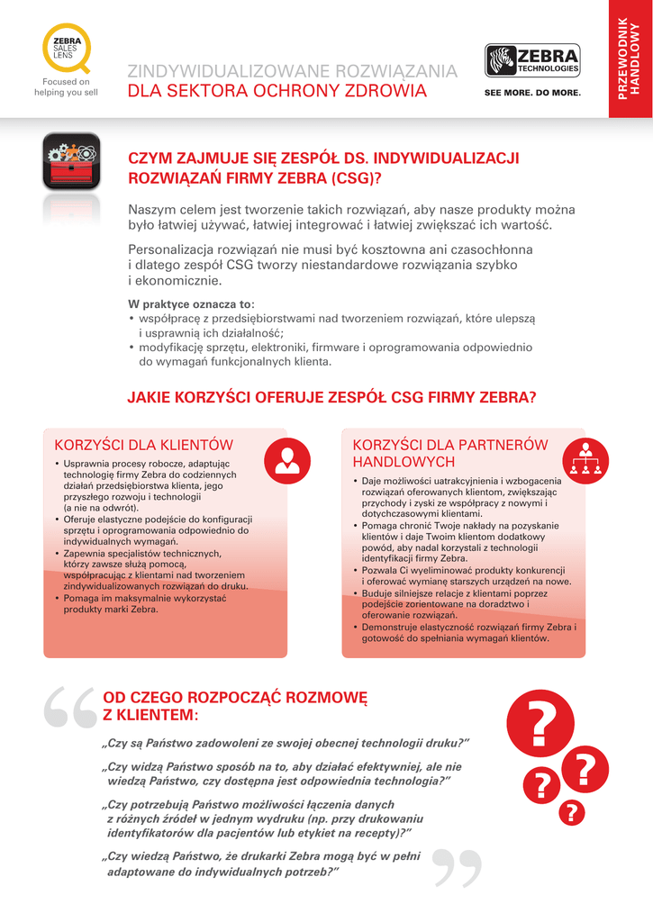 ZINDYWIDUALIZOWANE ROZWIĄZANIA DLA SEKTORA OCHRONY ZDROWIA CZYM ZAJMUJE SIĘ ZESPÓŁ DS. INDYWIDUALIZACJI ROZWIĄZAŃ FIRMY ZEBRA (CSG)? Naszym celem jest tworzenie takich rozwiązań, aby nasze produkty można było łatwiej używać, łatwiej integrować i łatwiej zwiększać ich wartość. Personalizacja rozwiązań nie musi być kosztowna ani czasochłonna i dlatego zespół CSG tworzy niestandardowe rozwiązania szybko i ekonomicznie. W praktyce oznacza to: •współpracę z przedsiębiorstwami nad tworzeniem rozwiązań, które ulepszą i usprawnią ich działalność; •modyfikację sprzętu, elektroniki, firmware i oprogramowania odpowiednio do wymagań funkcjonalnych klienta. JAKIE KORZYŚCI OFERUJE ZESPÓŁ CSG FIRMY ZEBRA? KORZYŚCI DLA KLIENTÓW • Usprawnia procesy robocze, adaptując technologię firmy Zebra do codziennych działań przedsiębiorstwa klienta, jego przyszłego rozwoju i technologii (a nie na odwrót). • Oferuje elastyczne podejście do konfiguracji sprzętu i oprogramowania odpowiednio do indywidualnych wymagań. • Zapewnia specjalistów technicznych, którzy zawsze służą pomocą, współpracując z klientami nad tworzeniem zindywidualizowanych rozwiązań do druku. • Pomaga im maksymalnie wykorzystać produkty marki Zebra. KORZYŚCI DLA PARTNERÓW HANDLOWYCH • Daje możliwości uatrakcyjnienia i wzbogacenia rozwiązań oferowanych klientom, zwiększając przychody i zyski ze współpracy z nowymi i dotychczasowymi klientami. • Pomaga chronić Twoje nakłady na pozyskanie klientów i daje Twoim klientom dodatkowy powód, aby nadal korzystali z technologii identyfikacji firmy Zebra. • Pozwala Ci wyeliminować produkty konkurencji i oferować wymianę starszych urządzeń na nowe. • Buduje silniejsze relacje z klientami poprzez podejście zorientowane na doradztwo i oferowanie rozwiązań. • Demonstruje elastyczność rozwiązań firmy Zebra i gotowość do spełniania wymagań klientów. OD CZEGO ROZPOCZĄĆ ROZMOWĘ Z KLIENTEM: „Czy są Państwo zadowoleni ze swojej obecnej technologii druku?” „Czy widzą Państwo sposób na to, aby działać efektywniej, ale nie wiedzą Państwo, czy dostępna jest odpowiednia technologia?” „Czy potrzebują Państwo możliwości łączenia danych z różnych źródeł w jednym wydruku (np. przy drukowaniu identyfikatorów dla pacjentów lub etykiet na recepty)?” „Czy wiedzą Państwo, że drukarki Zebra mogą być w pełni adaptowane do indywidualnych potrzeb?” PRZEWODNIK HANDLOWY Focused on helping you sell USŁUGI INDYWIDUALIZACJI ROZWIĄZAŃ: KORZYŚCI DLA TWOJEGO KLIENTA MODYFIKACJA KORZYŚCI DLA KLIENTÓW DBP Drukowanie bez podkładu Druk najbardziej ekonomiczny i przyjazny dla środowiska. Lepszy wizerunek firmy na rynku. ZBI ZBI Wprowadzane dane (z dowolnego urządzenia) mogą być analizowane i przetwarzane w celu wydrukowania z wykorzystaniem otwartego oprogramowania. Drukowanie z wielu urządzeń. FW Firmware Dodatki lub rozszerzenia do funkcji operacyjnych, takie jak nowe konfiguracje menu, kody kreskowe, interfejsy. Dostosowanie drukarki do konkretnego zastosowania w celu przyspieszenia pracy. E Modyfikacje elektryczne Modyfikacje elektrycznych elementów produktów w celu spełnienia specjalistycznych wymagań. Poszerzona funkcjonalność ulepszająca pracę w określonych zastosowaniach. M Modyfikacje mechaniczne Modyfikacje fizycznej konstrukcji produktu – w rezultacie powstaje produkt unikatowy. Przygotowanie drukarki do pracy w określonych środowiskach roboczych. ZK Zindywidualizowana konfiguracja Specjalistyczna konfiguracja ustawień i tworzenie zestawów do masowego wdrażania. Ekonomiczna instalacja sprzętu. Oprogramowanie i systemy druku w przedsiębiorstwie Zmiany w systemach operacyjnych i integracja ze sterownikami. Łatwiejsza integracja z aplikacjami klientów. ODP Zapytaj klientów, przed jakimi problemami stoją lub jakie możliwości handlowe być może utracili z powodu braku elastycznego rozwiązania do druku. Wykorzystaj jeden z „problemów klientów”, aby pokazać, jak moglibyśmy pokonać te trudności w przyszłości. JAK CSG MOŻE POMÓC PROBLEMY KLIENTÓW ZINDYWIDUALIZOWANE ROZWIĄZANIE KORZYŚCI Liczne fundusze zdrowia w Wielkiej Brytanii przechowują dane w różnych formatach. Niespójność formatów oznacza, że standaryzacja danych jest trudna. Za pomocą ZBI zmodyfikowaliśmy nasze drukarki opasek na rękę, aby identyfikowały właściwe dane i wstawiały je w odpowiednim formacie lub szablonie do wydrukowania na opaskach identyfikacyjnych pacjentów. Tańsze rozwiązanie, gdyż drukarki Zebra przetwarzają dane w celu poprawnego wydrukowania na opaskach na rękę. Rozwiązanie nie wymaga modyfikacji systemów użytkownika końcowego. Stworzony został zindywidualizowany sterownik z certyfikatem MS, załadowane zostały ustawienia szpitala i wykorzystano program do automatycznej instalacji. Po podłączeniu drukarki sterownik instalowany jest automatycznie z odpowiednimi ustawieniami. Dzięki temu zmniejszono potrzeby użytkownika końcowego w zakresie pomocy informatycznej i zwiększono zadowolenie klienta końcowego. Stworzyliśmy drukarkę z zamykaną na klucz pokrywą oraz zamocowanie drukarki do biurka. Drukarki nie można usunąć z biurka. Do znajdujących się w drukarce etykiet na recepty dostęp mają tylko upoważnione osoby posiadające klucz. ZBI ZK Lokalnemu szpitalowi zależało, aby jego użytkownicy nie musieli konfigurować sterowników drukarek za każdym razem, gdy instalowana była drukarka. ODP Klient chciał zabezpieczyć etykiety na recepty przed kradzieżą. M ODPIERANIE ZASTRZEŻEŃ I CZĘSTO ZADAWANE PYTANIA To wydaje się drogie. Usługi indywidualizacji rozwiązań świadczone są indywidualnie dla poszczególnych klientów po omówieniu ich potrzeb z partnerem Zebry. Nie są to gotowe dodatki, ale usługi wzbogacające istniejące urządzenia i maksymalizujące wydajność przedsiębiorstwa klienta. 