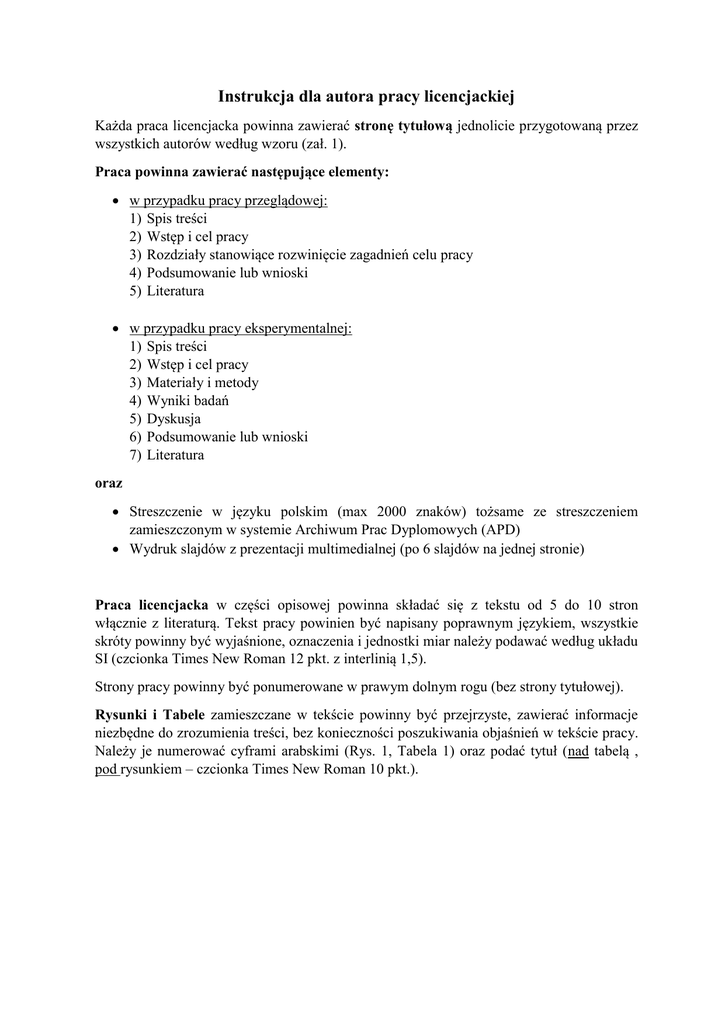 Instrukcja dla autora pracy licencjackiej Każda praca licencjacka powinna zawierać stronę tytułową jednolicie przygotowaną przez wszystkich autorów według wzoru (zał. 1). Praca powinna zawierać następujące elementy: w przypadku pracy przeglądowej: 1) Spis treści 2) Wstęp i cel pracy 3) Rozdziały stanowiące rozwinięcie zagadnień celu pracy 4) Podsumowanie lub wnioski 5) Literatura w przypadku pracy eksperymentalnej: 1) Spis treści 2) Wstęp i cel pracy 3) Materiały i metody 4) Wyniki badań 5) Dyskusja 6) Podsumowanie lub wnioski 7) Literatura oraz Streszczenie w języku polskim (max 2000 znaków) tożsame ze streszczeniem zamieszczonym w systemie Archiwum Prac Dyplomowych (APD) Wydruk slajdów z prezentacji multimedialnej (po 6 slajdów na jednej stronie) Praca licencjacka w części opisowej powinna składać się z tekstu od 5 do 10 stron włącznie z literaturą. Tekst pracy powinien być napisany poprawnym językiem, wszystkie skróty powinny być wyjaśnione, oznaczenia i jednostki miar należy podawać według układu SI (czcionka Times New Roman 12 pkt. z interlinią 1,5). Strony pracy powinny być ponumerowane w prawym dolnym rogu (bez strony tytułowej). Rysunki i Tabele zamieszczane w tekście powinny być przejrzyste, zawierać informacje niezbędne do zrozumienia treści, bez konieczności poszukiwania objaśnień w tekście pracy. Należy je numerować cyframi arabskimi (Rys. 1, Tabela 1) oraz podać tytuł (nad tabelą , pod rysunkiem – czcionka Times New Roman 10 pkt.). Literatura Pozycje literaturowe należy cytować w tekście poprzez przyporządkowanie im kolejnych cyfr arabskich umieszczonych w nawiasach kwadratowych, wg wzorów: [1, 5, 7] dla prac 1, 5 i 7 lub [1-5, 7] dla prac 1, 2, 3, 4, 5 oraz 7. Koniec zdania oznaczamy kropką postawioną za nawiasem kwadratowym, a nie przed nawiasem np. „Cechą charakterystyczną roślin wodnych jest miękisz powietrzny (aerenchyma) [1, 2-4]. Cytowane powyżej prace powinny pojawić się w spisie literatury (Literatura) w kolejności wystąpienia w tekście. Ich liczba nie może przekraczać 20. W spisie literatury należy stosować czcionkę Times New Roman 11 pkt., interlinia 1. Dopuszcza się 5 kategorii cytowanej literatury. Poniżej przedstawiono sposób cytowania każdej z nich: [1] Porcal P., Koprivnjak J-F., Molot L.A., Dillon P.J. (2009) Humic substances – part 7: the biogeochemistry of dissolved organic carbon and its interactions with climate change. Environmental Science and Pollution Research 16(6): 714-726. artykuł w czasopiśmie [2] Kojło A. (2005) Chemiluminescencja w analizie przepływowej. [W:] Kościelniak P., Trojanowicz M. (red.). Analiza przepływowa. Metody i zastosowania. Wyd. UJ, Kraków, 81-98. rozdział w monografii [3] Puzanowska-Tarasiewicz H., Kuźmicka M., Tarasiewicz M. (2001) Wstęp do chemii nieorganicznej. Wyd. UwB, Białystok. książka/podręcznik [4] Rozporządzenie Ministra Rolnictwa i Rozwoju Wsi z dnia 9 marca 2015 r. w sprawie wyznaczenia trwałych użytków zielonych wartościowych pod względem środowiskowym. Dziennik Ustaw 2015, poz. 348. akt prawny [5] http://www.wigry.org.pl/glowne/ochrona_zwierzat.htm; 17.01.2017 strona internetowa wraz z datą korzystania z tej strony przez studenta strony internetowe proszę cytować tylko w uzasadnionych przypadkach
