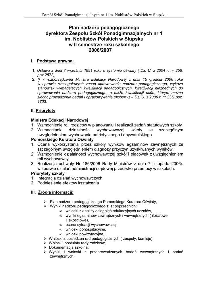Plan nadzoru pedagogicznego dyrektora Zespołu Szkół