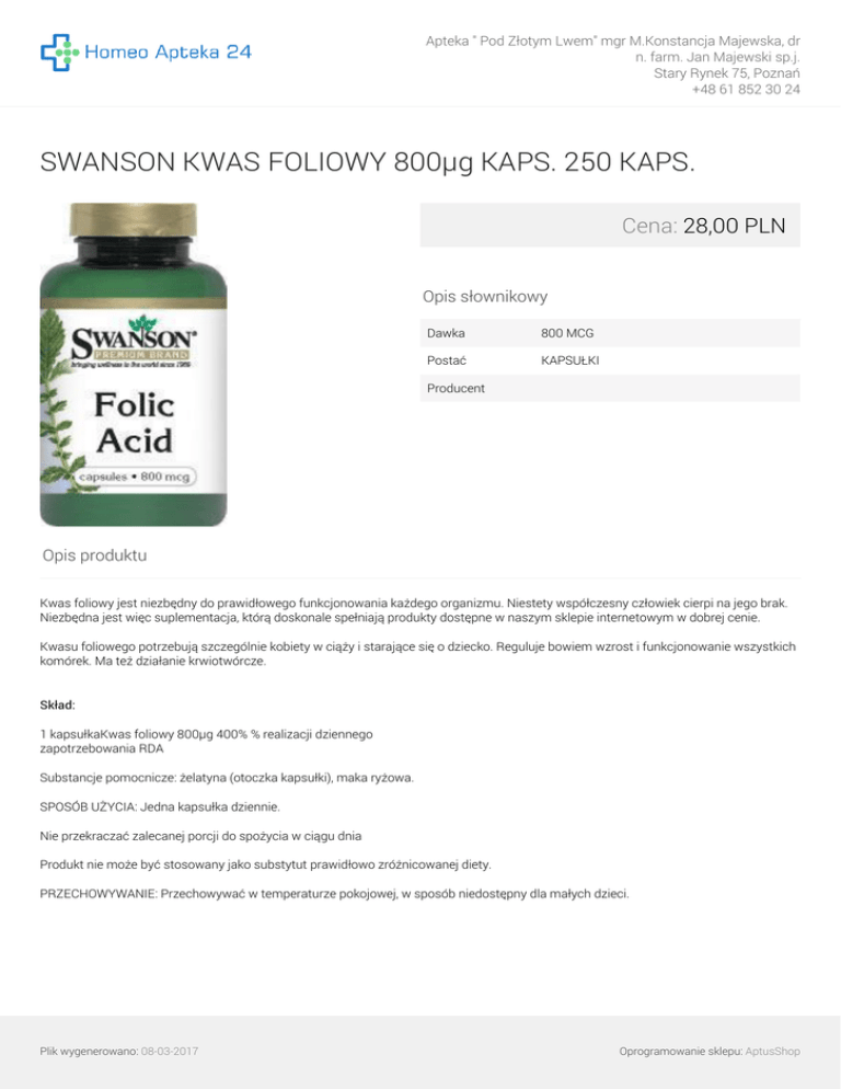Apteka " Pod Złotym Lwem" mgr M.Konstancja Majewska, dr n. farm. Jan Majewski sp.j. Stary Rynek 75, Poznań +48 61 852 30 24 SWANSON KWAS FOLIOWY 800µg KAPS. 250 KAPS. Cena: 28,00 PLN Opis słownikowy Dawka 800 MCG Postać KAPSUŁKI Producent Opis produktu Kwas foliowy jest niezbędny do prawidłowego funkcjonowania każdego organizmu. Niestety współczesny człowiek cierpi na jego brak. Niezbędna jest więc suplementacja, którą doskonale spełniają produkty dostępne w naszym sklepie internetowym w dobrej cenie. Kwasu foliowego potrzebują szczególnie kobiety w ciąży i starające się o dziecko. Reguluje bowiem wzrost i funkcjonowanie wszystkich komórek. Ma też działanie krwiotwórcze. Skład: 1 kapsułkaKwas foliowy 800µg 400% % realizacji dziennego zapotrzebowania RDA Substancje pomocnicze: żelatyna (otoczka kapsułki), maka ryżowa. SPOSÓB UŻYCIA: Jedna kapsułka dziennie. Nie przekraczać zalecanej porcji do spożycia w ciągu dnia Produkt nie może być stosowany jako substytut prawidłowo zróżnicowanej diety. PRZECHOWYWANIE: Przechowywać w temperaturze pokojowej, w sposób niedostępny dla małych dzieci. Plik wygenerowano: 08-03-2017 Powered by TCPDF (www.tcpdf.org) Oprogramowanie sklepu: AptusShop