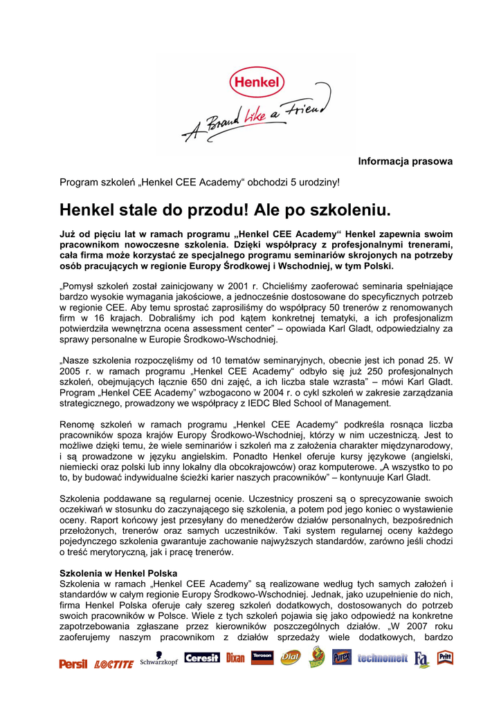 Informacja prasowa Program szkoleń „Henkel CEE Academy“ obchodzi 5 urodziny! Henkel stale do przodu! Ale po szkoleniu. Już od pięciu lat w ramach programu „Henkel CEE Academy“ Henkel zapewnia swoim pracownikom nowoczesne szkolenia. Dzięki współpracy z profesjonalnymi trenerami, cała firma może korzystać ze specjalnego programu seminariów skrojonych na potrzeby osób pracujących w regionie Europy Środkowej i Wschodniej, w tym Polski. „Pomysł szkoleń został zainicjowany w 2001 r. Chcieliśmy zaoferować seminaria spełniające bardzo wysokie wymagania jakościowe, a jednocześnie dostosowane do specyficznych potrzeb w regionie CEE. Aby temu sprostać zaprosiliśmy do współpracy 50 trenerów z renomowanych firm w 16 krajach. Dobraliśmy ich pod kątem konkretnej tematyki, a ich profesjonalizm potwierdziła wewnętrzna ocena assessment center” – opowiada Karl Gladt, odpowiedzialny za sprawy personalne w Europie Środkowo-Wschodniej. „Nasze szkolenia rozpoczęliśmy od 10 tematów seminaryjnych, obecnie jest ich ponad 25. W 2005 r. w ramach programu „Henkel CEE Academy“ odbyło się już 250 profesjonalnych szkoleń, obejmujących łącznie 650 dni zajęć, a ich liczba stale wzrasta” – mówi Karl Gladt. Program „Henkel CEE Academy” wzbogacono w 2004 r. o cykl szkoleń w zakresie zarządzania strategicznego, prowadzony we współpracy z IEDC Bled School of Management. Renomę szkoleń w ramach programu „Henkel CEE Academy“ podkreśla rosnąca liczba pracowników spoza krajów Europy Środkowo-Wschodniej, którzy w nim uczestniczą. Jest to możliwe dzięki temu, że wiele seminariów i szkoleń ma z założenia charakter międzynarodowy, i są prowadzone w języku angielskim. Ponadto Henkel oferuje kursy językowe (angielski, niemiecki oraz polski lub inny lokalny dla obcokrajowców) oraz komputerowe. „A wszystko to po to, by budować indywidualne ścieżki karier naszych pracowników” – kontynuuje Karl Gladt. Szkolenia poddawane są regularnej ocenie. Uczestnicy proszeni są o sprecyzowanie swoich oczekiwań w stosunku do zaczynającego się szkolenia, a potem pod jego koniec o wystawienie oceny. Raport końcowy jest przesyłany do menedżerów działów personalnych, bezpośrednich przełożonych, trenerów oraz samych uczestników. Taki system regularnej oceny każdego pojedynczego szkolenia gwarantuje zachowanie najwyższych standardów, zarówno jeśli chodzi o treść merytoryczną, jak i pracę trenerów. Szkolenia w Henkel Polska Szkolenia w ramach „Henkel CEE Academy” są realizowane według tych samych założeń i standardów w całym regionie Europy Środkowo-Wschodniej. Jednak, jako uzupełnienie do nich, firma Henkel Polska oferuje cały szereg szkoleń dodatkowych, dostosowanych do potrzeb swoich pracowników w Polsce. Wiele z tych szkoleń pojawia się jako odpowiedź na konkretne zapotrzebowania zgłaszane przez kierowników poszczególnych działów. „W 2007 roku zaoferujemy naszym pracownikom z działów sprzedaży wiele dodatkowych, bardzo specyficznych szkoleń, dostosowanych do konkretnych wymagań, jakie stawia przed nimi codzienna praca. Wśród nich pojawią się między innymi: „Negocjacje inteligentne emocjonalnie”, „Negocjacje zaawansowane”, „Negocjacje z kupcem”, „Biznes Plan dla Partnera”, czy „Coaching w polu” – wyjaśnia Bogdan Bajak, odpowiedzialny w Henkel Polska za program szkoleń pracowniczych. Dział Personalny Henkel Polska śledzi uważnie rynek i corocznie wzbogaca swoją ofertę o nowości szkoleniowe. Dla przykładu w 2004 roku odbyło się kilka szkoleń z zakresu negocjacji z elementami NLP, w 2005 roku „Finanse dla Nie-finansistów”, a w 2006 roku szkolenia z zakresu zarządzania zmianą, które wyszły naprzeciw reorganizacjom struktury w niektórych działach firmy. W uzasadnionych przypadkach Henkel oferuje także szkolenia dostosowane do indywidualnych potrzeb poszczególnych managerów, w związku z ich promocjami czy istotnymi zmianami zakresu ich obowiązków. Warszawa, 3 października 2006 r. .......................................................................................................................................................... Henkel to wiodące marki i technologie, które czynią życie ludzkie łatwiejszym, lepszym i piękniejszym Henkel to firma międzynarodowa, obecna na ponad 125 rynkach całego świata i zatrudniająca ponad 50 tysięcy pracowników, wiodący producent środków piorących i czystości, kosmetyków do pielęgnacji włosów i ciała, klejów konsumenckich, chemii budowlanej oraz technologii przemysłowych. W Polsce Henkel działa od 16 lat. Uruchomił 6 ośrodków produkcyjnych: w Raciborzu, Stąporkowie, Wrzącej, Dzierżoniowie, Ciechanowie i Bielsku-Białej, produkujących zarówno na potrzeby rynku polskiego, jak i na eksport. Zatrudnia w Polsce ponad 1100 pracowników. Kontakt: Dorota Strosznajder PR Manager, Henkel Polska Sp. z o.o. [email protected] tel: (+22) 565 66 65 Magda Gieorgica Mmd Poland - Corporate, Public Affairs & Public Relations Consultants [email protected] tel: (+22) 536 04 63 2