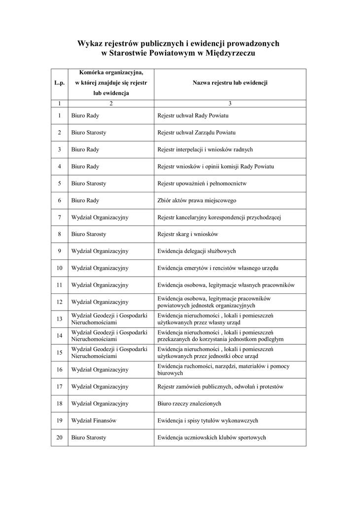 Wykaz rejestrów publicznych i ewidencji prowadzonych w Starostwie Powiatowym w Międzyrzeczu Komórka organizacyjna, L.p. w której znajduje się rejestr Nazwa rejestru lub ewidencji lub ewidencja 1 2 3 1 Biuro Rady Rejestr uchwał Rady Powiatu 2 Biuro Starosty Rejestr uchwał Zarządu Powiatu 3 Biuro Rady Rejestr interpelacji i wniosków radnych 4 Biuro Rady Rejestr wniosków i opinii komisji Rady Powiatu 5 Biuro Starosty Rejestr upoważnień i pełnomocnictw 6 Biuro Rady Zbiór aktów prawa miejscowego 7 Wydział Organizacyjny Rejestr kancelaryjny korespondencji przychodzącej 8 Biuro Starosty Rejestr skarg i wniosków 9 Wydział Organizacyjny Ewidencja delegacji służbowych 10 Wydział Organizacyjny Ewidencja emerytów i rencistów własnego urzędu 11 Wydział Organizacyjny Ewidencja osobowa, legitymacje własnych pracowników 12 Wydział Organizacyjny Ewidencja osobowa, legitymacje pracowników powiatowych jednostek organizacyjnych 13 Wydział Geodezji i Gospodarki Nieruchomościami Ewidencja nieruchomości , lokali i pomieszczeń użytkowanych przez własny urząd 14 Wydział Geodezji i Gospodarki Nieruchomościami Ewidencja nieruchomości , lokali i pomieszczeń przekazanych do korzystania jednostkom podległym 15 Wydział Geodezji i Gospodarki Nieruchomościami Ewidencja nieruchomości , lokali i pomieszczeń użytkowanych przez jednostki obce urząd 16 Wydział Organizacyjny Ewidencja ruchomości, narzędzi, materiałów i pomocy biurowych 17 Wydział Organizacyjny Rejestr zamówień publicznych, odwołań i protestów 18 Wydział Organizacyjny Biuro rzeczy znalezionych 19 Wydział Finansów Ewidencja i spisy tytułów wykonawczych 20 Biuro Starosty Ewidencja uczniowskich klubów sportowych 21 Biuro Starosty Ewidencja klubów sportowych nieprowadzących działalności gospodarczej 22 Biuro Starosty Ewidencja stowarzyszeń zwykłych 23 Biuro Starosty Ewidencja stowarzyszeń działających na terenie powiatu 24 Biuro Starosty Ewidencja fundacji 25 Wydział Edukacji, Spraw Społecznych i Promocji Rejestr pozwoleń na założenie szkoły lub placówki publicznej 26 Wydział Edukacji, Spraw Społecznych i Promocji Ewidencja szkół i placówek niepublicznych 27 Wydział Komunikacji i Dróg Ewidencja i rejestracja pojazdów samochodowych 28 Wydział Komunikacji i Dróg Ewidencja innych pojazdów 29 Wydział Komunikacji i Dróg Akta ewidencyjne osób, którym wydano prawo jazdy lub świadectwo kwalifikacyjne 30 Wydział Komunikacji i Dróg Rejestry wydanych koncesji 31 Wydział Komunikacji i Dróg Ewidencja instruktorów 32 Wydział Komunikacji i Dróg Rejestr przedsiębiorców prowadzących ośrodek szkolenia kierowców 33 Wydział Komunikacji i Dróg Rejestr przedsiębiorców prowadzących stacje kontroli pojazdów 34 Wydział Rolnictwa i Ochrony Środowiska Rejestr sprzętu pływającego służącego do połowu ryb 35 Wydział Rolnictwa i Ochrony Środowiska 36 Wydział Rolnictwa i Ochrony Środowiska 37 Wydział Rolnictwa i Ochrony Środowiska 38 Wydział Rolnictwa i Ochrony Środowiska Rejestr przetrzymywanych zwierząt 39 Wydział Geodezji i Gospodarki Nieruchomościami Ewidencja nieruchomości 40 Wydział Geodezji i Gospodarki Nieruchomościami Ewidencja gruntów i budynków 41 Wydział Geodezji i Gospodarki Nieruchomościami Ewidencja gruntów rolnych, zmiana i aktualizacja 42 Wydział Edukacji, Spraw Społecznych i Promocji Rejestr instytucji kultury Rejestr wniosków dotyczących przeznaczenia gruntów rolnych do zalesienia Rejestr zawierający informacje o terenach zagrożonych ruchami masowymi ziemi oraz terenach, na których występują te ruchy Rejestr posiadaczy odpadów zwolnionych z obowiązku uzyskiwania zezwolenia na prowadzenie działalności w zakresie zbierania lub transportu odpadów, odzysku lub unieszkodliwiania odpadów 2 Wykaz archiwów prowadzonych w Starostwie Powiatowym w Międzyrzeczu Komórka organizacyjna, L.p. w której znajduje Nazwa archiwum się archiwum 1 2 3 1 Wydział Organizacyjny Archiwum zakładowe 2 Wydział Architektury i Budownictwa Archiwum (wewnętrzne) dokumentacji budowlanej 3 Wydział Komunikacji i Dróg Archiwum (wewnętrzne) praw jazdy i rejestracji pojazdów 4 Wydział Geodezji i Gospodarki Nieruchomościami Archiwum (wewnętrzne) Powiatowego Ośrodka Dokumentacji Geodezyjnej i Kartograficznej 3