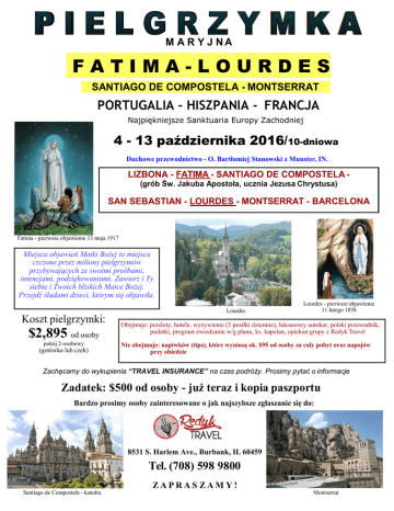 M A R Y J NA FATIMA-LOURDES SANTIAGO DE COMPOSTELA - MONTSERRAT PORTUGALIA - HISZPANIA - FRANCJA Najpiękniejsze Sanktuaria Europy Zachodniej 4 - 13 października 2016/10-dniowa Duchowe przewodnictwo - O. Bartłomiej Stanowski z Munster, IN. LIZBONA - FATIMA - SANTIAGO DE COMPOSTELA (grób Św. Jakuba Apostoła, ucznia Jezusa Chrystusa) SAN SEBASTIAN - LOURDES - MONTSERRAT - BARCELONA Fatima - pierwsze objawienie 13 maja 1917 Miejsca objawień Matki Bożej to miejsca czczone przez miliony pielgrzymów przybywających ze swoimi prośbami, intencjami, podziękowaniami. Zawierz i Ty siebie i Twoich bliskich Matce Bożej. Przejdź śladami dzieci, którym się objawiła. Lourdes Koszt pielgrzymki: $2,895 od osoby pokój 2-osobowy (gotówka lub czek) Lourdes - pierwsze objawienie 11 lutego 1858 Obejmuje: przeloty, hotele, wyżywienie (2 posiłki dziennie), luksusowy autokar, polski przewodnik, podatki, program zwiedzania w/g planu, ks. kapelan, opiekun grupy z Redyk Travel Nie obejmuje: napiwków (tips), które wyniosą ok. $95 od osoby za cały pobyt oraz napojów przy obiedzie Zachęcamy do wykupienia “TRAVEL INSURANCE” na czas podróży. Prosimy pytać o informacje Zadatek: $500 od osoby - już teraz i kopia paszportu Bardzo prosimy osoby zainteresowane o jak najszybsze zgłaszanie się do: 8531 S. Harlem Ave., Burbank, IL 60459 Tel. (708) 598 9800 ZAPRAS ZAMY! Santiago de Compostela - katedra Montserrat