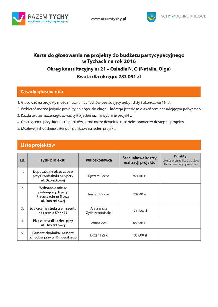 Karta do głosowania na projekty do budżetu partycypacyjnego w Tychach na rok 2016 Okręg konsultacyjny nr 21 – Osiedla N, O (Natalia, Olga) Kwota dla okręgu: 283 091 zł Zasady głosowania 1. Głosować na projekty może mieszkaniec Tychów posiadający pobyt stały i ukończone 16 lat. 2. Wybierać można jedynie projekty należące do okręgu, którego jest się mieszkańcem posiadającym pobyt stały. 3. Każda osoba może zagłosować tylko jeden raz na wybrane projekty. 4. Głosującemu przysługuje 10 punktów, które może dowolnie rozdzielić pomiędzy dostępne projekty. 5. Możliwe jest oddanie całej puli punktów na jeden projekt. Lista projektów Lp. Tytuł projektu Wnioskodawca Szacunkowe koszty realizacji projektu 1. Doposażenie placu zabaw przy Przedszkolu nr 5 przy ul. Orzeszkowej Ryszard Gołba 97 000 zł 2. Wykonanie miejsc parkingowych przy Przedszkolu nr 5 przy ul. Orzeszkowej Ryszard Gołba 70 000 zł 3. Edukacyjna strefa gier i sportu na terenie SP nr 35 Aleksandra Zych-Krzemińska 176 228 zł 4. Plac zabaw dla dzieci przy ul. Orzeszkowej Zofia Góra 85 586 zł 5. Remont chodnika i remont schodów przy ul. Dmowskiego Bożena Żak 100 000 zł Punkty (proszę wpisać ilość puktów dla wskazanego projektu) Dane obowiązkowe głosującego: Numer PESEL: Nazwisko rodowe (panieńskie) matki: Oświadczenie Wyrażam zgodę na przetwarzanie moich danych osobowych dla potrzeb niezbędnych do realizacji procedury Budżetu Partycypacyjnego zgodnie z ustawą z dnia 29 sierpnia 1997 r. o ochronie danych osobowych (Dz.U.2014.1182 z późn. zm.). Administratorem danych osobowych jest Prezydent Miasta Tychy z siedzibą w Tychach, al. Niepodległości 49. Data ........................................... Podpis głosującego ...........................................................................................................