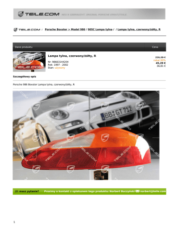 Porsche Boxster > Model 986 / 905C Lampa tylna / / Lampa tylna, czerwony/żółty, R Dane produktu Cena Lampa tylna, czerwony/żółty, R Nr: 98663144204 Rok: 1997 - 2002 Stan: używany 226,38 € rabat 80% 45,28 € 36,81 € Szczegółowy opis Porsche 986 Boxster Lampa tylna, czerwony/żółty, R masz pytanie? 1 Prosimy o kontakt z opiekunem tego produktu: Norbert Buczyński [email protected]