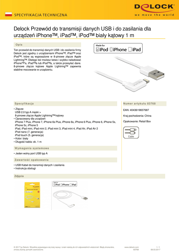 Delock Przewód do transmisji danych USB i do zasilania dla urządzeń iPhone™, iPad™, iPod™ biały kątowy 1 m Opis Ten przewód do transmisji danych USB i do zasilania firmy Delock jest zgodny z urządzeniami iPhone™, iPad™ oraz iPod™, które są wyposażone w 8-pinowe złącze Apple Lightning™. Dlatego też możesz łatwo i szybko naładować iPhone™’a, iPad™a lub iPod™a, a także przesyłać dane. 8-pinowe złącze kątowe Apple Lightning™ zapewnia stabilne mocowanie w urządzeniu. Specyfikacja • Złącze: USB 2.0 typ A męski > 8-pinowe złącze Apple Lightning™ kątowy • Opracowany dla urządzeń iPhone 7 Plus, iPhone 7, iPhone 6s Plus, iPhone 6s, iPhone 6 Plus, iPhone 6, iPhone 5s, iPhone 5c, iPhone 5 iPad, iPad mini, iPad mini 2, iPad mini 3, iPad mini 4, iPad Air, iPad Air 2 iPod nano (7. generacja) iPod touch (5. generacja) • Kolor: biały • Długość kabla: ok. 1 m Numer artykułu 83768 EAN: 4043619837687 Kraj pochodzenia: China Opakowanie: Retail Box Wymagania systemowe • Jeden wolny port USB typ A Zawartość opakowania • USB Kabel do transmisji danych i zasilania • Instrukcja obsługi Zdjęcia © 2017 by Delock. Wszelkie pojawiające się tutaj nazwy i znaki należą do ich odpowiednich właścicieli. Błędy drukarskie, zmiany & pomyłki zastrzeżone. Powered by TCPDF (www.tcpdf.org) www.delock.com 83768 1/1 08.03.2017