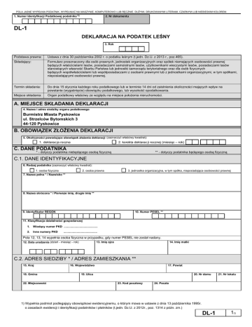 POLA JASNE WYPEŁNIA PODATNIK. WYPEŁNIAĆ NA MASZYNIE, KOMPUTEROWO LUB RĘCZNIE, DUŻYMI, DRUKOWANYMI LITERAMI, CZARNYM LUB NIEBIESKIM KOLOREM. 1. Numer Identyfikacji Podatkowej podatnika 1) 2. Nr dokumentu └────┴────┴────┴────┴────┴────┴────┴────┴────┴────┴────┘ DL-1 DEKLARACJA NA PODATEK LEŚNY 3. Rok └────┴────┴────┴────┘ Podstawa prawna: Ustawa z dnia 30 października 2002 r. o podatku leśnym (t.jedn. Dz.U. z 2013 r., poz.465). Składający: Formularz przeznaczony dla osób prawnych, jednostek organizacyjnych oraz spółek niemających osobowości prawnej będących właścicielami lasów, posiadaczami samoistnymi lasów, użytkownikami wieczystymi lasów, posiadaczami lasów stanowiących własność Skarbu Państwa lub jednostki samorządu terytorialnego oraz dla osób fizycznych będących współwłaścicielami lub współposiadaczami z osobami prawnymi lub z jednostkami organizacyjnymi, w tym spółkami, nieposiadającymi osobowości prawnej. Termin składania: Do dnia 15 stycznia każdego roku podatkowego lub w terminie 14 dni od zaistnienia okoliczności mających wpływ na powstanie (wygaśnięcie) obowiązku podatkowego, lub wysokość opodatkowania. Miejsce składania: Organ podatkowy właściwy ze względu na miejsce położenia nieruchomości. A. MIEJSCE SKŁADANIA DEKLARACJI 4. Nazwa i adres siedziby organu podatkowego Burmistrz Miasta Pyskowice ul. Strzelców Bytomskich 3 44-120 Pyskowice B. OBOWIĄZEK ZŁOŻENIA DEKLARACJI 5. Okoliczności powodujące obowiązek złożenia deklaracji (zaznaczyć właściwy kwadrat): 1. deklarac ja roczna 2. korekta deklarac ji rocznej (miesiąc – rok) C. DANE PODATNIKA * - dotyczy podatnika niebędącego osobą fizyczną └────┴────┘-└────┴────┴────┴────┘ ** - dotyczy podatnika będącego osobą fizyczną C.1. DANE IDENTYFIKACYJNE 6. Rodzaj podatnika (zaznaczyć właściwy kwadrat): 1. osoba fizyczna 7. Nazwa pełna * / Nazwisko ** 2. osoba prawna 3. jednostka organizacyjna, w tym spółka, nieposiadająca osobowości prawnej 8. Nazwa skrócona * / Pierwsze imię, drugie imię ** 10. Numer PESEL ** 9. Identyfikator REGON 11. Klasyfikacja działalności gospodarczej 1. Wiodący numer PKD ......................................... 2. Inne numery PKD ......................................... Pola 12, 13, 14 wypełnia osoba fizyczna w przypadku, gdy numer PESEL nie został nadany. 13. Imię ojca 12. Data urodzenia (dzień - miesiąc - rok) 14. Imię matki └────┴────┘-└────┴────┘-└────┴────┴────┴────┘ C.2. ADRES SIEDZIBY * / ADRES ZAMIESZKANIA ** 15. Kraj 18. Gmina 22. Miejscowość 16. Województwo 17. Powiat 19. Ulica 20. Nr domu 23. Kod pocztowy 21. Nr lokalu 24. Poczta 1) Wypełnia podmiot podlegający obowiązkowi ewidencyjnemu, o którym mowa w ustawie z dnia 13 października 1995r. o zasadach ewidencji i identyfikacji podatników i płatników (t.jedn. Dz.U. z 2012r., poz. 1314 z późn. zm.) DL-1 1/3 POLA JASNE WYPEŁNIA PODATNIK. WYPEŁNIAĆ NA MASZYNIE, KOMPUTEROWO LUB RĘCZNIE, DUŻYMI, DRUKOWANYMI LITERAMI, CZARNYM LUB NIEBIESKIM KOLOREM. D. DANE DOTYCZĄCE LASÓW NIEPODLEGAJĄCYCH ZWOLNIENIU Rodzaj gruntów leśnych Powierzchnia w ha z dokładnością do czterech miejsc po przecinku 25. 1. Lasy Stawka podatku Kwota podatku zł, gr zł, 26. 27. 29. 30. 29. 32. gr ha 2. Lasy wchodzące w skład rezerwatów przyrody 28. 3. Lasy wchodzące w skład parków narodowych 31. ha ha E. ŁĄCZNA KWOTA PODATKU Kwota podatku (w pełnych złotych) W przypadku, gdy kwota podatku nie przekracza 100 zł podatek jest płatny jednorazowo w terminie płatności pierwszej raty 33. zł F. DANE O NIERUCHOMOŚCIACH LEŚNYCH PODLEGAJĄCYCH OPODATKOWANIU LUB ZWOLNIENIU F.1. POŁOŻENIE NIERUCHOMOŚCI LEŚNYCH 34. Położenie F.2. TYTUŁ PRAWNY (zaznaczyć właściwy kwadrat): 36. Rodzaj posiadania samoistnego 35. Rodzaj własności 1. własność 37. Rodzaj użytkowania 1. użytkowanie wieczyste 2. współwłasność 2. współużytkowanie 1. posiadanie 38. Rodzaj posiadania zależnego 1. posiadanie F.3. IDENTYFIKATORY GEODEZYJNE DZIAŁEK 39. Działki F.4. KSIĘGA WIECZYSTA 40. Numer księgi wieczystej (zbioru dokumentów) DL-1 2/3 41. Nazwa sądu 2. współposiadanie 2. współposiadanie POLA JASNE WYPEŁNIA PODATNIK. WYPEŁNIAĆ NA MASZYNIE, KOMPUTEROWO LUB RĘCZNIE, DUŻYMI, DRUKOWANYMI LITERAMI, CZARNYM LUB NIEBIESKIM KOLOREM. G. DANE DOTYCZĄCE ZWOLNIEŃ I ULG PODATKOWYCH WYNIKAJĄCYCH Z USTAWY LUB UCHWAŁY RADY GMINY Powierzchnia w ha z dokładnością do czterech miejsc po przecinku Tytuł prawny zwolnienia 42. 43. H. PODPIS PODATNIKA / OSOBY REPREZENTUJĄCEJ PODATNIKA 44. Imię 45. Nazwisko 46. Data wypełnienia deklaracji (dzień - miesiąc - rok) 47. Podpis (pieczęć) podatnika / osoby reprezentującej podatnika └────┴────┘-└────┴────┘-└────┴────┴────┴────┘ I. ADNOTACJE ORGANU PODATKOWEGO 48. Uwagi organu podatkowego 49. Data (dzień - miesiąc - rok) 50. Podpis przyjmującego formularz └────┴────┘-└────┴────┘-└────┴────┴────┴────┘ Pouczenie Niniejsza deklaracja stanowi podstawę do wystawienia tytułu wykonawczego, zgodnie z przepisami ustawy z dnia 17 czerwca 1966 r. o postępowaniu egzekucyjnym w administracji (t.jedn. Dz.U. z 2014r., poz. 1619 z późn. zm.). DL-1 3/3