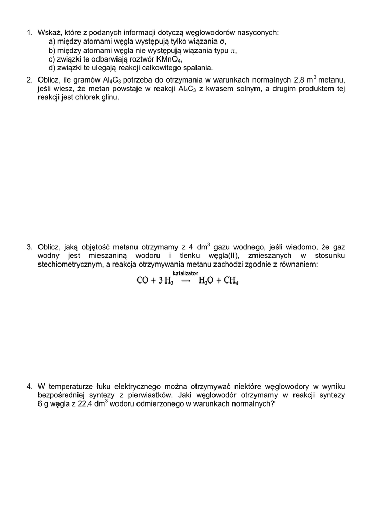 1. Wskaż, które z podanych informacji dotyczą węglowodorów nasyconych: a) między atomami węgla występują tylko wiązania σ, b) między atomami węgla nie występują wiązania typu , c) związki te odbarwiają roztwór KMnO4, d) związki te ulegają reakcji całkowitego spalania. 2. Oblicz, ile gramów Al4C3 potrzeba do otrzymania w warunkach normalnych 2,8 m 3 metanu, jeśli wiesz, że metan powstaje w reakcji Al4C3 z kwasem solnym, a drugim produktem tej reakcji jest chlorek glinu. 3. Oblicz, jaką objętość metanu otrzymamy z 4 dm3 gazu wodnego, jeśli wiadomo, że gaz wodny jest mieszaniną wodoru i tlenku węgla(II), zmieszanych w stosunku stechiometrycznym, a reakcja otrzymywania metanu zachodzi zgodnie z równaniem: 4. W temperaturze łuku elektrycznego można otrzymywać niektóre węglowodory w wyniku bezpośredniej syntezy z pierwiastków. Jaki węglowodór otrzymamy w reakcji syntezy 6 g węgla z 22,4 dm3 wodoru odmierzonego w warunkach normalnych? 5. Paliwem do kuchenek turystycznych jest mieszanina propanu z butanem. Oblicz objętość powietrza potrzebną do całkowitego spalenia 0,5 m 3 tej mieszaniny, jeżeli zawiera ona 25% objętościowych butanu. Przyjmij, że powietrze zawiera 20% objętościowych tlenu. 6. W wyniku spalenia 11,4 g alkanu otrzymano 17,92 dm 3 CO2 odmierzonego w warunkach normalnych. Ustal wzór sumaryczny tego węglowodoru. 7. W wyniku spalenia alkanu otrzymano CO i parę wodną. Stosunek objętościowy reagentów odmierzonych w tych samych warunkach temperatury i ciśnienia wynosi VCxHy : VO2 = 2:13. Wyznacz wzór sumaryczny tego alkanu. 8. Gęstość benzyny wynosi 0,7 g/cm3. Zakładając, że składa się ona tylko z izomerów oktanu, oblicz objętość CO2 (przeliczoną na warunki normalne), wydzielanego przez silnik samochodowy podczas spalania 1 dm3 benzyny. 9. Izomery różnią się od siebie: a) własnościami fizycznymi, b) strukturą cząsteczek, 10. Homologiem oktanu jest: a) C4H8 b) C3H8 c) składem chemicznym i masą cząsteczkową, d) cechami wymienionymi w punktach a) i b). c) C4H6 d) C6H12. 11. Gęstość propanu w warunkach normalnych wynosi: a) 1,96 g/dm3 b) 2,22 g/dm3 c) 3,83 g/dm3 d) 4,05 g/dm3. 12. W wyniku bromowania alkanu otrzymano monobromopochodną o masie molowej 137 g/mol. Podaj wzór sumaryczny tej monobromopochodnej alkanu. 13. Jedną z metod otrzymywania alkanów jest synteza Wurtza, przebiegająca według schematu: Uzupełnij równania następujących reakcji: 14. 15. Zaproponuj metodę otrzymywania bromoetanu z metanu z wykorzystaniem dowolnych związków nieorganicznych.