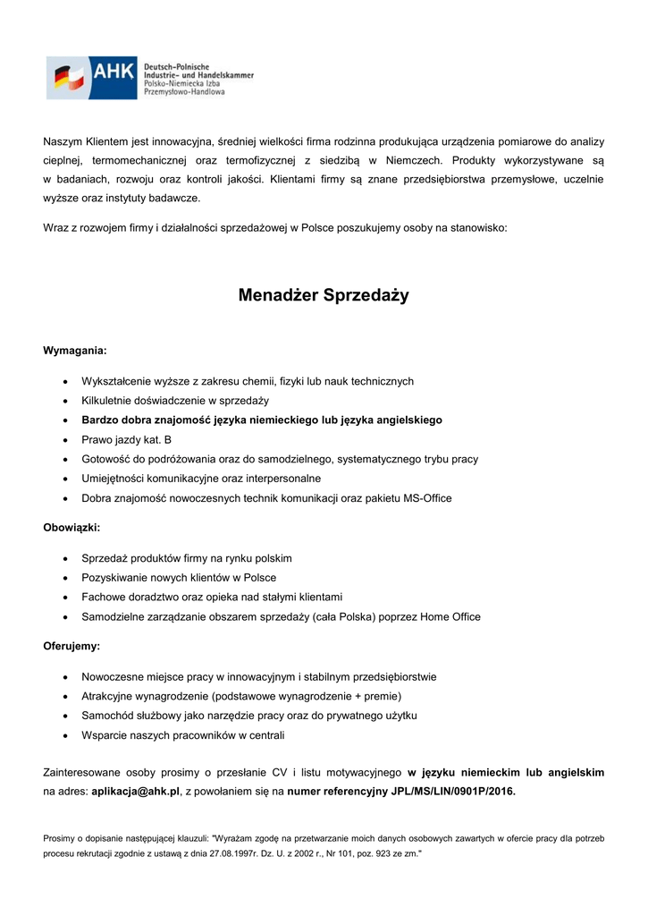 Naszym Klientem jest innowacyjna, średniej wielkości firma rodzinna produkująca urządzenia pomiarowe do analizy cieplnej, termomechanicznej oraz termofizycznej z siedzibą w Niemczech. Produkty wykorzystywane są w badaniach, rozwoju oraz kontroli jakości. Klientami firmy są znane przedsiębiorstwa przemysłowe, uczelnie wyższe oraz instytuty badawcze. Wraz z rozwojem firmy i działalności sprzedażowej w Polsce poszukujemy osoby na stanowisko: Menadżer Sprzedaży Wymagania: Wykształcenie wyższe z zakresu chemii, fizyki lub nauk technicznych Kilkuletnie doświadczenie w sprzedaży Bardzo dobra znajomość języka niemieckiego lub języka angielskiego Prawo jazdy kat. B Gotowość do podróżowania oraz do samodzielnego, systematycznego trybu pracy Umiejętności komunikacyjne oraz interpersonalne Dobra znajomość nowoczesnych technik komunikacji oraz pakietu MS-Office Obowiązki: Sprzedaż produktów firmy na rynku polskim Pozyskiwanie nowych klientów w Polsce Fachowe doradztwo oraz opieka nad stałymi klientami Samodzielne zarządzanie obszarem sprzedaży (cała Polska) poprzez Home Office Oferujemy: Nowoczesne miejsce pracy w innowacyjnym i stabilnym przedsiębiorstwie Atrakcyjne wynagrodzenie (podstawowe wynagrodzenie + premie) Samochód służbowy jako narzędzie pracy oraz do prywatnego użytku Wsparcie naszych pracowników w centrali Zainteresowane osoby prosimy o przesłanie CV i listu motywacyjnego w języku niemieckim lub angielskim na adres: [email protected], z powołaniem się na numer referencyjny JPL/MS/LIN/0901P/2016. Prosimy o dopisanie następującej klauzuli: "Wyrażam zgodę na przetwarzanie moich danych osobowych zawartych w ofercie pracy dla potrzeb procesu rekrutacji zgodnie z ustawą z dnia 27.08.1997r. Dz. U. z 2002 r., Nr 101, poz. 923 ze zm."