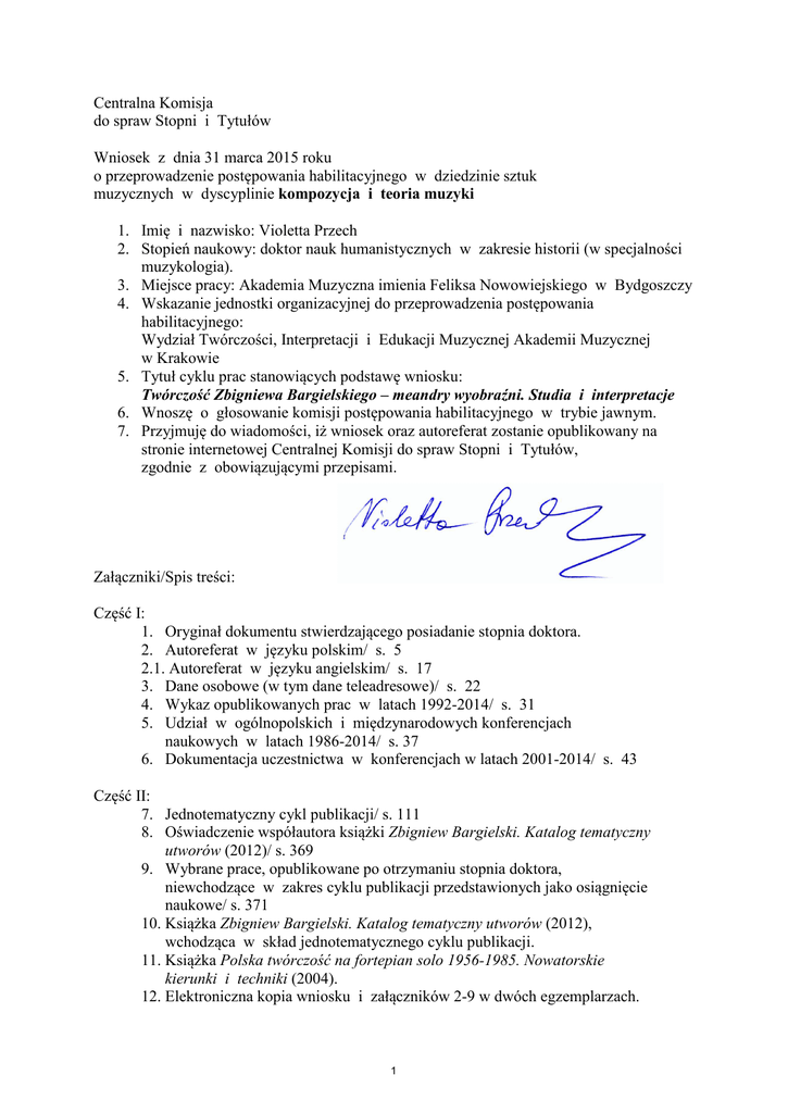 Centralna Komisja do spraw Stopni i Tytułów Wniosek z dnia 31 marca 2015 roku o przeprowadzenie postępowania habilitacyjnego w dziedzinie sztuk muzycznych w dyscyplinie kompozycja i teoria muzyki 1. Imię i nazwisko: Violetta Przech 2. Stopień naukowy: doktor nauk humanistycznych w zakresie historii (w specjalności muzykologia). 3. Miejsce pracy: Akademia Muzyczna imienia Feliksa Nowowiejskiego w Bydgoszczy 4. Wskazanie jednostki organizacyjnej do przeprowadzenia postępowania habilitacyjnego: Wydział Twórczości, Interpretacji i Edukacji Muzycznej Akademii Muzycznej w Krakowie 5. Tytuł cyklu prac stanowiących podstawę wniosku: Twórczość Zbigniewa Bargielskiego – meandry wyobraźni. Studia i interpretacje 6. Wnoszę o głosowanie komisji postępowania habilitacyjnego w trybie jawnym. 7. Przyjmuję do wiadomości, iż wniosek oraz autoreferat zostanie opublikowany na stronie internetowej Centralnej Komisji do spraw Stopni i Tytułów, zgodnie z obowiązującymi przepisami. Załączniki/Spis treści: Część I: 1. Oryginał dokumentu stwierdzającego posiadanie stopnia doktora. 2. Autoreferat w języku polskim/ s. 5 2.1. Autoreferat w języku angielskim/ s. 17 3. Dane osobowe (w tym dane teleadresowe)/ s. 22 4. Wykaz opublikowanych prac w latach 1992-2014/ s. 31 5. Udział w ogólnopolskich i międzynarodowych konferencjach naukowych w latach 1986-2014/ s. 37 6. Dokumentacja uczestnictwa w konferencjach w latach 2001-2014/ s. 43 Część II: 7. Jednotematyczny cykl publikacji/ s. 111 8. Oświadczenie współautora książki Zbigniew Bargielski. Katalog tematyczny utworów (2012)/ s. 369 9. Wybrane prace, opublikowane po otrzymaniu stopnia doktora, niewchodzące w zakres cyklu publikacji przedstawionych jako osiągnięcie naukowe/ s. 371 10. Książka Zbigniew Bargielski. Katalog tematyczny utworów (2012), wchodząca w skład jednotematycznego cyklu publikacji. 11. Książka Polska twórczość na fortepian solo 1956-1985. Nowatorskie kierunki i techniki (2004). 12. Elektroniczna kopia wniosku i załączników 2-9 w dwóch egzemplarzach. 1