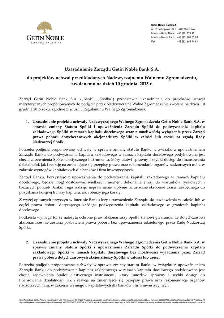 Uzasadnienie Zarządu Getin Noble Bank S.A. do projektów uchwał przedkładanych Nadzwyczajnemu Walnemu Zgromadzeniu, zwołanemu na dzień 10 grudnia 2015 r. Zarząd Getin Noble Bank S.A. („Bank”, „Spółka”) przedstawia uzasadnienie do projektów uchwał merytorycznych proponowanych do podjęcia przez Nadzwyczajne Walne Zgromadzenie zwołane na dzień 10 grudnia 2015 roku, zgodnie z §2 ust. 3 Regulaminu Walnego Zgromadzenia. 1. Uzasadnienie projektu uchwały Nadzwyczajnego Walnego Zgromadzenia Getin Noble Bank S.A. w sprawie zmiany Statutu Spółki i upoważnienia Zarządu Spółki do podwyższenia kapitału zakładowego Spółki w ramach kapitału docelowego wraz z możliwością wyłączenia przez Zarząd prawa poboru dotychczasowych akcjonariuszy Spółki w całości lub części za zgodą Rady Nadzorczej Spółki. Potrzeba podjęcia proponowanej uchwały w sprawie zmiany statutu Banku w związku z upoważnieniem Zarządu Banku do podwyższenia kapitału zakładowego w ramach kapitału docelowego podyktowana jest chęcią zapewnienia Spółce elastycznego instrumentu, który ułatwi sprawny i szybki dostęp do finansowania działalności, jak i reakcję na zmieniające się przepisy prawa oraz rekomendacje organów nadzorczych m.in. w zakresie wymogów kapitałowych dla banków i firm inwestycyjnych. Zarząd Banku, korzystając z upoważnienia do podwyższania kapitału zakładowego w ramach kapitału docelowego, będzie mógł dostosować wielkość i moment dokonania emisji do warunków rynkowych i bieżących potrzeb Banku. Tego rodzaju usprawnienie wpłynie na znaczne skrócenie czasu niezbędnego do pozyskania kolejnej transzy kapitału, jak i obniży jego koszty. Z wyżej opisanych przyczyn w interesie Banku leży upoważnienie Zarządu do pozbawienia w całości lub w części prawa poboru dotyczącego każdego podwyższenia kapitału zakładowego w granicach kapitału docelowego. Podkreśla wymaga to, że należytą ochronę praw akcjonariuszy Spółki stanowi gwarancja, że dotychczasowi akcjonariusze nie zostaną pozbawieni prawa poboru bez upoważnienia udzielonego przez Radę Nadzorczą Spółki. 2. Uzasadnienie projektu uchwały Nadzwyczajnego Walnego Zgromadzenia Getin Noble Bank S.A. w sprawie zmiany Statutu Spółki i upoważnienia Zarządu Spółki do podwyższenia kapitału zakładowego Spółki w ramach kapitału docelowego bez możliwości wyłączenia przez Zarząd prawa poboru dotychczasowych akcjonariuszy Spółki w całości lub części Potrzeba podjęcia proponowanej uchwały w sprawie zmiany statutu Banku w związku z upoważnieniem Zarządu Banku do podwyższenia kapitału zakładowego w ramach kapitału docelowego podyktowana jest chęcią zapewnienia Spółce elastycznego instrumentu, który umożliwi sprawny i szybki dostęp do finansowania działalności, jak i reakcję na zmieniające się przepisy prawa oraz rekomendacje organów nadzorczych m.in. w zakresie wymogów kapitałowych dla banków i firm inwestycyjnych. Getin Noble Bank Spółka Akcyjna z siedzibą przy ulicy Przyokopowej 33, 01-208 Warszawa, wpisana do rejestru przedsiębiorców Krajowego Rejestru Sądowego pod numerem 0000304735 przez Sąd Rejonowy dla m.st. Warszawy, XII Wydział Gospodarczy Krajowego Rejestru Sądowego, NIP 1080004850, REGON 141334039, wysokość kapitału zakładowego wynosi 2.650.143.319,00 złotych (wpłacony w całości). Opłata jak za połączenie lokalne wg taryfy operatora. Zarząd Banku, korzystając z upoważnienia do podwyższania kapitału zakładowego w ramach kapitału docelowego, będzie mógł dostosować wielkość i moment dokonania emisji do warunków rynkowych i bieżących potrzeb Banku. Tego rodzaju usprawnienie wpłynie na znaczne skrócenie czasu niezbędnego do pozyskania kolejnej transzy kapitału, jak i obniży jego koszty. Wysokość ceny emisyjnej akcji w ramach jednej lub kilku kolejnych emisji zostanie ustalona przez Zarząd Spółki, za zgodą Rady Nadzorczej Banku. Przyznanie tym podmiotom uprawnienia pozwoli na skuteczne przeprowadzenie emisji akcji poprzez dostosowanie ceny emisyjnej adekwatnej do popytu na oferowane akcje lub sytuacji na rynkach finansowych. 3. Uzasadnienie projektu uchwały Nadzwyczajnego Walnego Zgromadzenia Getin Noble Bank S.A. w sprawie zmiany Statutu Spółki Dodanie zapisu w zakresie możliwości utworzenia przez Bank Osobnego Kapitału Rezerwowego podyktowane jest podjętymi działaniami mającymi na celu urealnienie wartości nominalnej akcji Banku poprzez jej obniżenie i dostosowanie do warunków rynkowych. Wprowadzenie możliwości utworzenie Osobnego Kapitału Rezerwowego i zasilenia go kwotą pochodzącą z obniżenia kapitału zakładowego da możliwość uniknięcia postępowania konwokacyjnego, którego przeprowadzenie przez Bank nie byłoby wskazane. 4. Uzasadnienie projektu uchwały Nadzwyczajnego Walnego Zgromadzenia Getin Noble Bank S.A. w sprawie obniżenia kapitału zakładowego Spółki i związanej z nim zmiany Statutu Spółki oraz utworzenia kapitału rezerwowego Uzasadnieniem podjęcia decyzji ws. obniżenia kapitału zakładowego poprzez zmniejszenie wartości nominalnej akcji Banku jest chęć urealnienia tejże wartości w stosunku do bieżącej wyceny rynkowej. Zmniejszenie wartości nominalnej akcji umożliwi Bankowi realizację nowych emisji akcji i tym samym pozyskanie dodatkowego źródła finansowania(usunie barierę dla skutecznego dokapitalizowania). Kwota obniżenia kapitału zakładowego zasili kapitał rezerwowy i w przyszłości posłużyć może jako źródło pokrycia ewentualnych strat. Getin Noble Bank Spółka Akcyjna z siedzibą przy ulicy Przyokopowej 33, 01-208 Warszawa, wpisana do rejestru przedsiębiorców Krajowego Rejestru Sądowego pod numerem 0000304735 przez Sąd Rejonowy dla m.st. Warszawy, XII Wydział Gospodarczy Krajowego Rejestru Sądowego, NIP 1080004850, REGON 141334039, wysokość kapitału zakładowego wynosi 2.650.143.319,00 złotych (wpł
