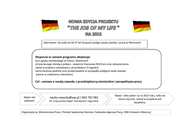 skierowana do osób od 18-27 lat chcących podjąć naukę zawodu i pracę w Niemczech Wsparcie w ramach programu obejmuje: kurs języka niemieckiego w Polsce i Niemczech od pierwszego miesiąca pobytu - wsparcie finansowe 818 Euro oraz ubezpieczenia udział w praktyce zawodowej u pracodawcy ( 6 tygodni) zwrot kosztow podróży oraz przeprowadzki w przypadku podjęcia nauki zawodu pomoc w znalezieniu mieszkania Cel : umowa o naukę zawodu z przedsiębiorcą niemieckim i perspektywa pracy Napisz lub zadzwoń: [email protected] / 663 762 962 M. Czapczyńska-Nagel- koordynator regionalny Nabór -tylko jeden raz w 2015 roku, tylko do końca stycznia. Udział w projekcie jest bezpłatny. Organizatorzy: Ministerstwo Pracy i Polityki Społecznej Niemiec; Federalna Agencja Pracy; WBS Schwerin (Niemcy)