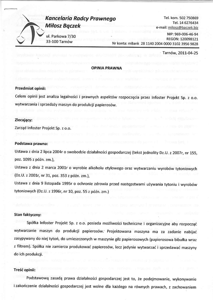 # KanceloriaRadcyPrdwnego Mitosz Bqczek Tel.kom.502 750869 Tel.746276434 e-mail:milosz(abaczek.biz NIP:969-006-46-94 REGON:120098121 Nr konta:mBank28 114020040000310239569828 ul. Parkowa7/30 33-100Tarn6w farn6w,2O77-O+25 OPINIAPRAWNA Przedmiotopinii: Celemopiniijest analizalegalnojciiprawnych aspekt6wrozpoczecia przezlnfosterprojektSp.z o,o. wytwarzania i sprzedaiymaszyndo produkcjipapieros6w. Zlecajqcy: ZarzqdInfosterProjekt5p.z o.o. PodstawaDrawna: Ustawaz dnia2 lipca2004ro swobodziedzialalnojcigospodarczej (tekstjednolityDz.t). z 2OO:r,ff IS5, poz.7095z p6in. zm.j, Ustawaz dnia 2 marca2001ro wyrobiealkoholuetylowegooraz wytwarzaniuwyrobdwt]^oniowvch (Dz.U. z 2001r,nr 31,poz.353z p62n.zm.), Ustawaz dnia9 listopada 1995ro ochroniezdrowiaprzednastepstwami u:ywaniatwoniuiwvrob6w q oniowych (Dz.U. z 1996r,nr 10,poz.55 z p6in.zm.) Stanfaktyczny: Sp6lkaInfosterProjektSp.z o,o.posiadam02liwojci techniczne iorganizacyjne aby rozpoczqd wytwarzaniemaszyn do produkcji papjeros6w.-projektowanamaszynama za zadanie nabljaa zasypywany do niejtytofi, do umieszczonych w maszynie gilzpapierosowych (papierosowa bibutkawraz z filtrem).5p6tkanie zamierzaprodukowa6papieros6w,leczjedyniewytwarzaii sprzedawaimaszyny do ichprodukcji. Trei6opinii: Podstawowazasadqprawa dzialalnojcigospodarczej jest to, ie podejmowanje, wykonywanie izakoiczeniedzialalnoicigospodarczej jest wolne dla kaidegona r6wnychprawach,z zachowaniem Kdtueld d Rdd.y Prowrego Mitosz Bq.tek Tet.kom,502750469 Tel. 14 6276434 e [email protected] przepisami prawa{art.6 ust.l ustawyo swobodzie warunk6wokre<lonych gospodarczej, dziatalnoici dalejUSDG). Oznacza gospodarcza to, i2tylkojasnyprzepis rangiustawowe.i mo2edzialalno3i ogranicza6 i uzale2nlai od uzyskania np. koncesjiczy zezwolenia. Aktualnie- zgodniez art. 46 ust. 1 USDG gospodarczej uzyskania koncesjiwymagawykonywanie dziatalnoici w zakresie:poszukiwania lub rozpoznawania 2162 kopalin,wydobywaniakopalinze2162, bezzbiornikowego magazynowania substancji g6rniczych; orazskladowania odpad6ww g6rotworze,w tym w podziemnych wyrobiskach wytwarzania iobrotu materialami wybuchowymi, broniai amunicjaorazwyrobamiitechnologiE o przeznaczeniu wojskowym lub policyjnym;wwwarzania,przetwarzania,magazynowania, przesylania,dystrybucji iobrotu paliwamii energiA;ochronyos6b i mienia;rozpowszechniania program6wradiowych przewoz6w prowadzenia itelewizyjnych; gry.Natomiast lotniczych; kasyna zgodnie z art.3 ust.2 ustawy o wyrobie alkoholuetylowegooraz wytwarzaniuwyrob6w tytoniowych(dalej: ustawatytoniowa) gospodarcza dzialalno66 wzakresiewytwarzaniawyrob6wtytonjowychjest dziafalnofuiqregulowanE w rozumieniuprzepis6wustawyo swobodziedzialalnoicigospodarczej i vvymagawpisu do rejestru producent6wwyrob6w twoniowych. Przy czym nale2y podkreilia, i2 wyrobem tytoniowym jest w rozumieniuustawywyr6bwyprodukowany z tytoniu przeznaczony do paleniaoraztabaka(art.2 pkt 2 ustawytytoniowej). Analiza przepis6wobu cytowanychustaw skfaniado wniosku, i2 dzialalnoidgospodarcza polegajqca na wytwarzaniu maszyndo produkcjipapieros6w nie podlegakoncesjonowaniu ani nie wymagazezwolenia. Niejest ona bowiemwymieniona w art. 46 ust. 1 USDG, ani w jej wynikunie powstajewyr6btytoniowy. Ograniczenie tegorodzajudziafalnosci mo2ewynika6natomiast z przepis6w ustawyo ochronie zdrowiaprzednastQpstwami u:ywaniatytoniui wyrob6wtytoniowych.Ustawata zawieraw art. 2 pkt 4 definicjq"rekwizyt6wMoniowych", kt6re zdefiniowanojako artykutyi przynady przeznaczone do u2ywaniatytoniu, jak papieroinice,cygarniczki, bibulki papierosowe, urzadzeniado zwijania papieros6w, fajki orazprzyborydo ich czyszczenia inabijania,popielniczki, obcinacze do cygaritp. papieros6w zapalniczek i zapatek). Zatemzgodniez tE definicja, maszyna do produkcji {zwylaczeniem tytoi do gilz),mo2ebyi uznanaza rekwizyttytoniowy.W konsekwencji na mocyart. 8 ust.1 {nabijajaca cytowanej papieros6w-niezai ustawynielegalne bqdziereklamowanie i promocja maszyn do produkcji samowytwarzanie tegotypu maszyn. Reasumujac naleZystwierdzid,ii wytwarzaniemaszyndo produkcjipapieros6wjest legalnebez koniecznoiciuzyskiwaniadodatkowychkoncesjiczy zezwole6. Maszyn tych nie moina jednak reklamowai anioromowa6. Na.@ldrld Rd.lcy,\nweEo Milo, Bqczek Zastrzeienia: Niniejszaopiniazostalasporzadzona przezInfosterProjekt w oparciuo informacjeprzekazane Sp.z o.o.,na bazieakt6wprawnychpowolanychpowy2ejiobowiEzujqcych w daciesporzEdzenia opinii. Opiniujecynie ma obowiazkuuaktualniania treici opinii w przypadkuzmian w przepisach obowiqzujEcych i zmianystanufaldycznego. RADC ngl Lf$dsfftqczek