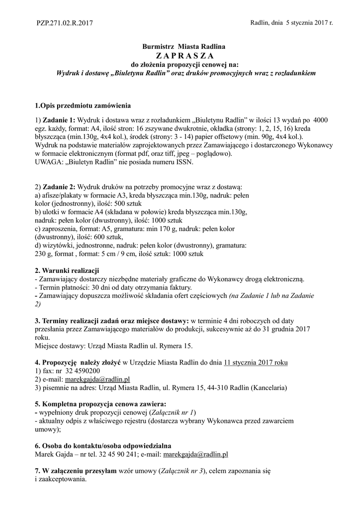 Radlin, dnia 5 stycznia 2017 r. PZP.271.02.R.2017 Burmistrz Miasta Radlina ZAPRAS ZA do złożenia propozycji cenowej na: Wydruk i dostawę „Biuletynu Radlin” oraz druków promocyjnych wraz z rozładunkiem 1.Opis przedmiotu zamówienia 1) Zadanie 1: Wydruk i dostawa wraz z rozładunkiem „Biuletynu Radlin” w ilości 13 wydań po 4000 egz. każdy, format: A4, ilość stron: 16 zszywane dwukrotnie, okładka (strony: 1, 2, 15, 16) kreda błyszcząca (min.130g, 4x4 kol.), środek (strony: 3 - 14) papier offsetowy (min. 90g, 4x4 kol.). Wydruk na podstawie materiałów zaprojektowanych przez Zamawiającego i dostarczonego Wykonawcy w formacie elektronicznym (format pdf, oraz tiff, jpeg – poglądowo). UWAGA: „Biuletyn Radlin” nie posiada numeru ISSN. 2) Zadanie 2: Wydruk druków na potrzeby promocyjne wraz z dostawą: a) afisze/plakaty w formacie A3, kreda błyszcząca min.130g, nadruk: pełen kolor (jednostronny), ilość: 500 sztuk b) ulotki w formacie A4 (składana w połowie) kreda błyszcząca min.130g, nadruk: pełen kolor (dwustronny), ilość: 1000 sztuk c) zaproszenia, format: A5, gramatura: min 170 g, nadruk: pełen kolor (dwustronny), ilość: 600 sztuk, d) wizytówki, jednostronne, nadruk: pełen kolor (dwustronny), gramatura: 230 g, format , format: 5 cm / 9 cm, ilość sztuk: 1000 sztuk 2. Warunki realizacji - Zamawiający dostarczy niezbędne materiały graficzne do Wykonawcy drogą elektroniczną. - Termin płatności: 30 dni od daty otrzymania faktury. - Zamawiający dopuszcza możliwość składania ofert częściowych (na Zadanie 1 lub na Zadanie 2) 3. Terminy realizacji zadań oraz miejsce dostawy: w terminie 4 dni roboczych od daty przesłania przez Zamawiającego materiałów do produkcji, sukcesywnie aż do 31 grudnia 2017 roku. Miejsce dostawy: Urząd Miasta Radlin ul. Rymera 15. 4. Propozycję należy złożyć w Urzędzie Miasta Radlin do dnia 11 stycznia 2017 roku 1) fax: nr 32 4590200 2) e-mail: [email protected] 3) pisemnie na adres: Urząd Miasta Radlin, ul. Rymera 15, 44-310 Radlin (Kancelaria) 5. Kompletna propozycja cenowa zawiera: - wypełniony druk propozycji cenowej (Załącznik nr 1) - aktualny odpis z właściwego rejestru (dostarcza wybrany Wykonawca przed zawarciem umowy); 6. Osoba do kontaktu/osoba odpowiedzialna Marek Gajda – nr tel. 32 45 90 241; e-mail: [email protected] 7. W załączeniu przesyłam wzór umowy (Załącznik nr 3), celem zapoznania się i zaakceptowania. 8. Kryterium oceny ofert: 100% cena. 9. Załączniki: Wzór druku propozycji cenowej: Zadanie 1 - Załącznik nr 1, Zadanie 2 - Załącznik nr 2 Wzór umowy: Załącznik nr 3 …................................................................. (podpis osoby upoważnionej z UM Radlin) Zadanie 1 Załącznik nr 1 nazwa firmy/podmiotu (może być pieczątka firmy) : ...............................................................................……………………. ............................................................................................................................................................... adres: ..................................................................................................................................................... kod, miejscowość, ulica, województwo Numer telefonu : ….............................................................................................................................. e-mail : …............................................................................................................................................. NIP: ….................................................................................................................................................. PR O PO ZYC JA C E N OWA Niniejszym składam propozycję cenową na: Wydruk i dostawa wraz z rozładunkiem „Biuletynu Radlin” Oferujemy wykonanie przedmiotu zamówienia za: cena brutto ….…....... zł x 13 wydań = cena brutto ...............................................zł słownie: ................................................................................................................................. Termin wykonania: zgodnie z zapotrzebowaniem Zamawiającego, do 31 grudnia 2017 Oświadczamy, że: 1. Zapoznaliśmy się z Zaproszeniem i zakresem przedmiotu zamówienia oraz Wzorem Umowy (Załącznik nr 3) i nie wnosimy do nich zastrzeżeń. 2. W przypadku wybrania naszej propozycji, zobowiązujemy się do zawarcia umowy na warunkach zawartych we Wzorze Umowy (Załącznik nr 3), w miejscu i terminie określonym przez Zamawiającego oraz przekazania aktualnego odpisu z właściwego rejestru. ............................................................. (podpis osoby składającej propozycję) Zadanie 2 Załącznik nr 2 nazwa firmy/podmiotu (może być pieczątka firmy) : ...............................................................................……………………. ............................................................................................................................................................... adres: ..................................................................................................................................................... kod, miejscowość, ulica, województwo Numer telefonu : ….............................................................................................................................. e-mail : …............................................................................................................................................. NIP: ….................................................................................................................................................. PR O PO ZYC JA C E N OWA Niniejszym składam propozycję cenową na: Wydruk druków na potrzeby promocyjne wraz z dostawą Oferujemy wykonanie przedmiotu zamówienia za: 1) afisze/plakaty w formacie A3, kreda błyszcząca min. 13